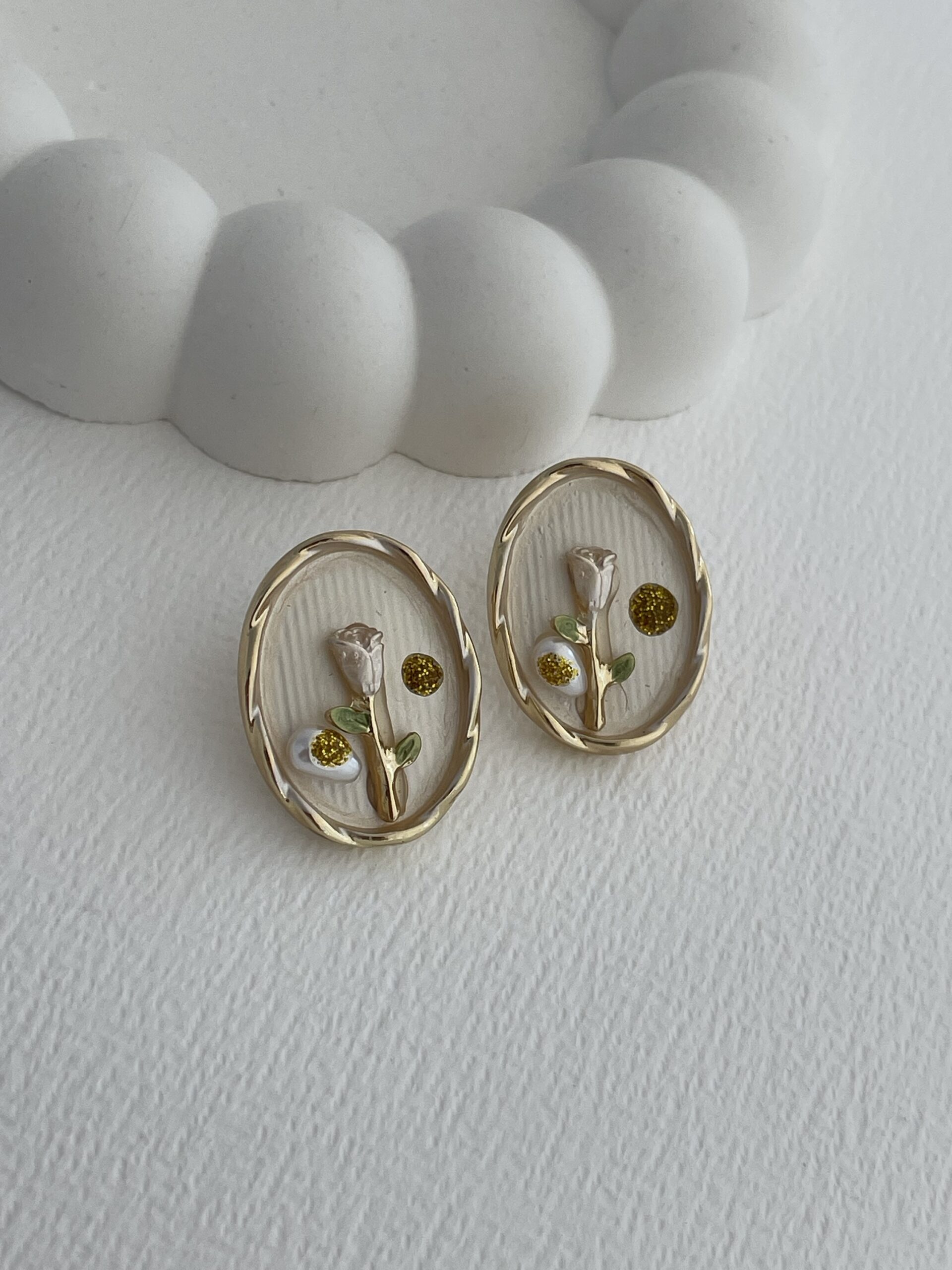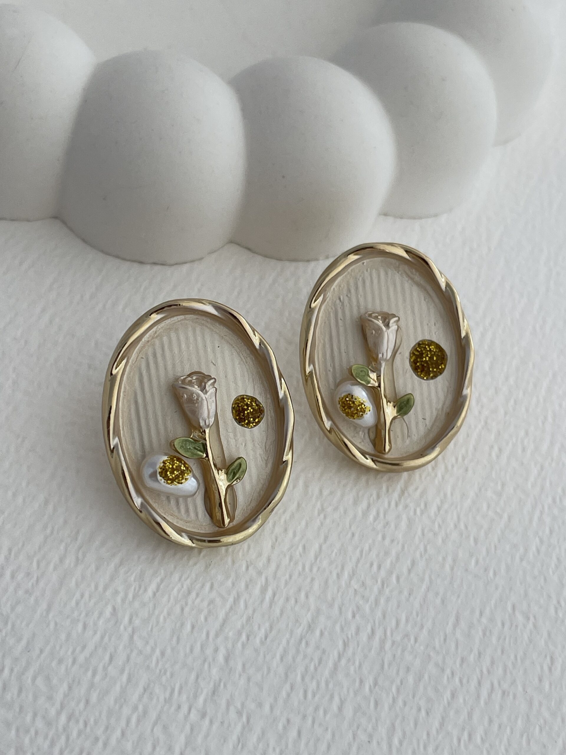 Özel Seri Krem Gül Tasarım Gold Oval Küpe