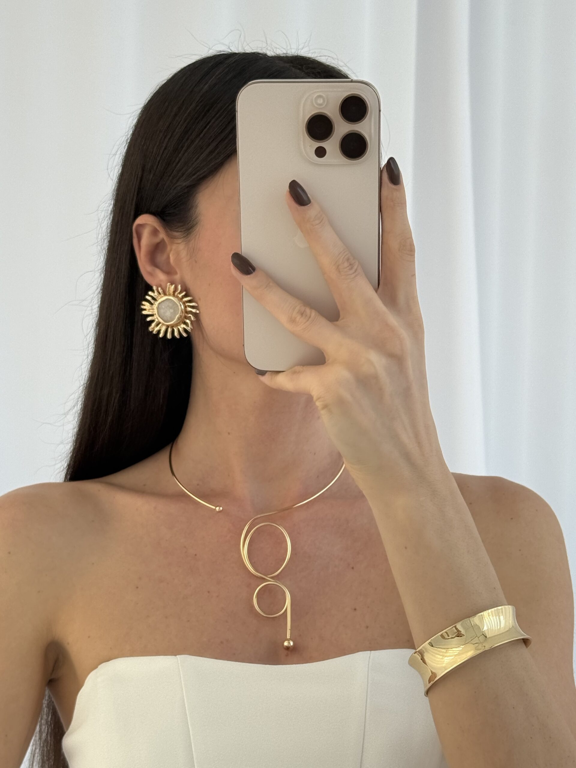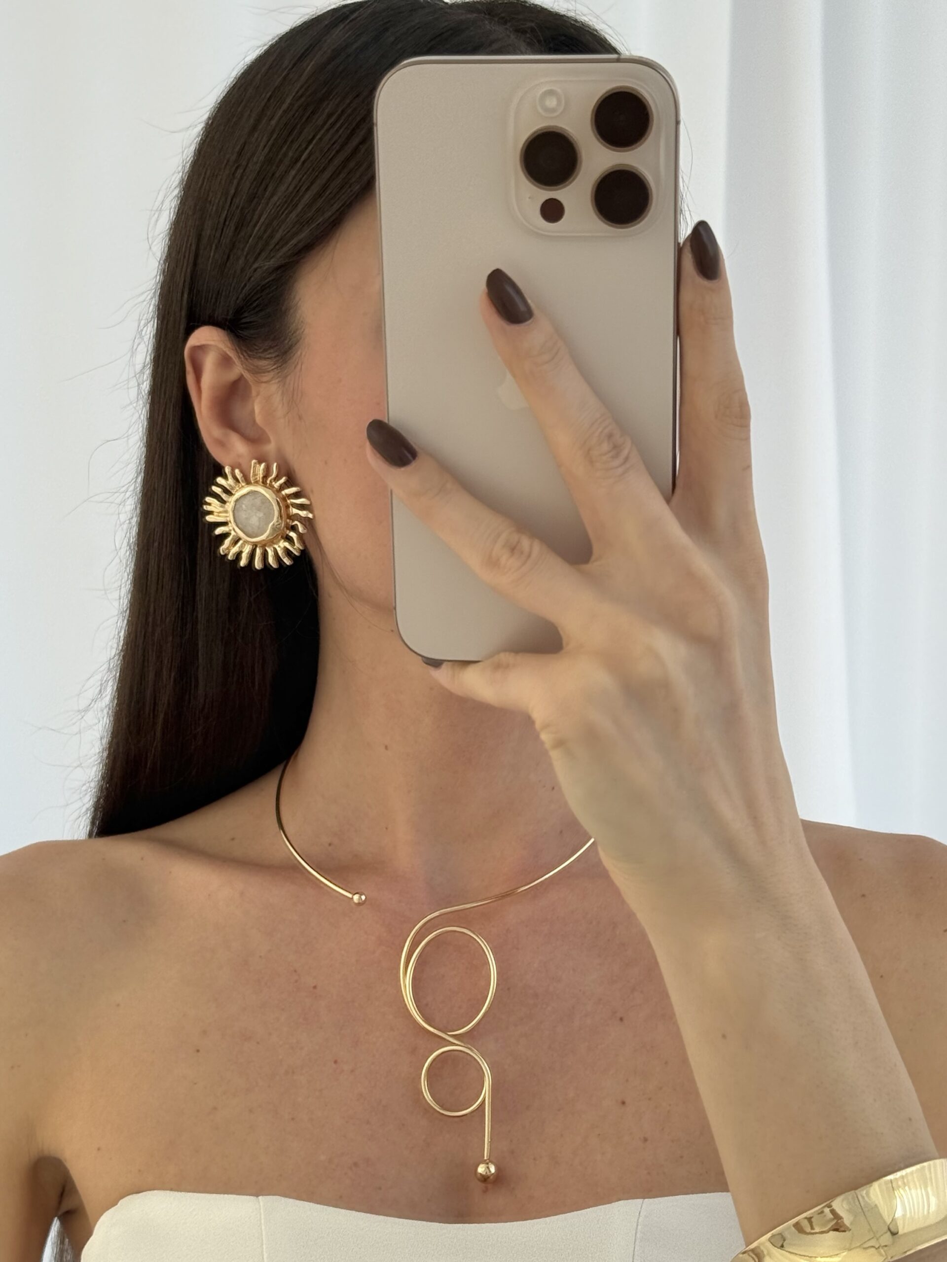 Özel Seri Krem Kemik Detay Güneş Tasarım Gold Küpe