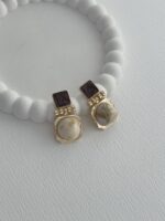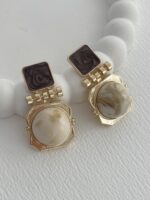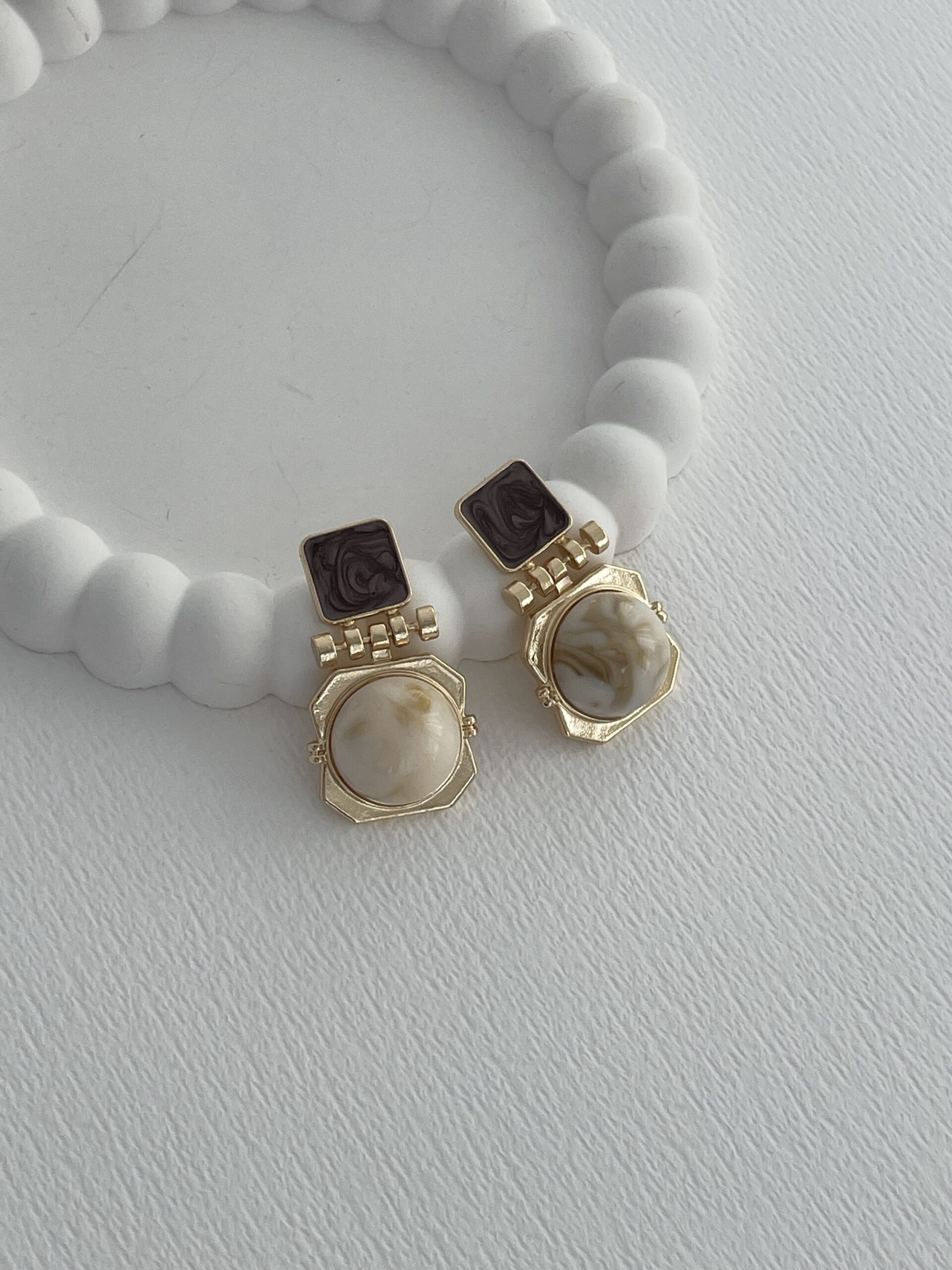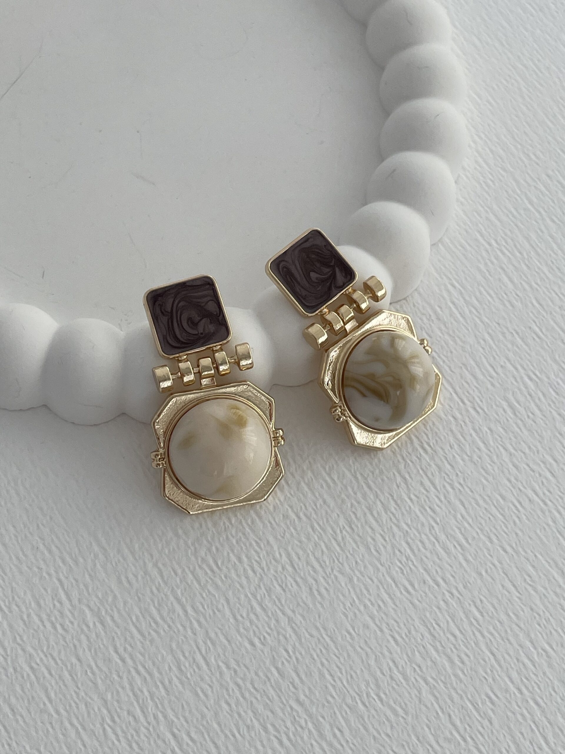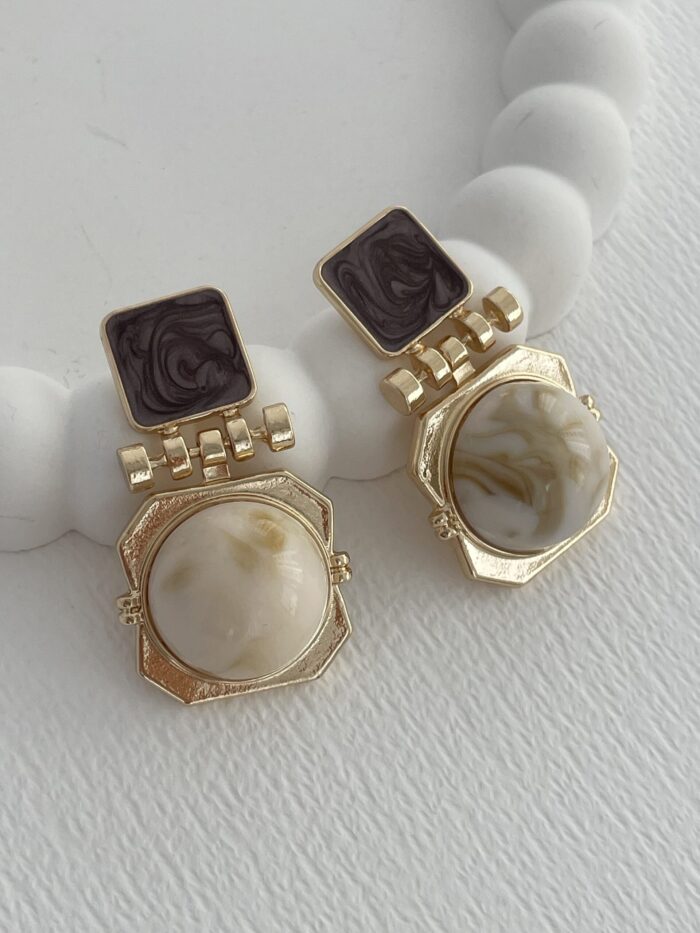 Özel Seri Krem Kemik Geometrik Tasarım Kahve Detay Gold Küpe