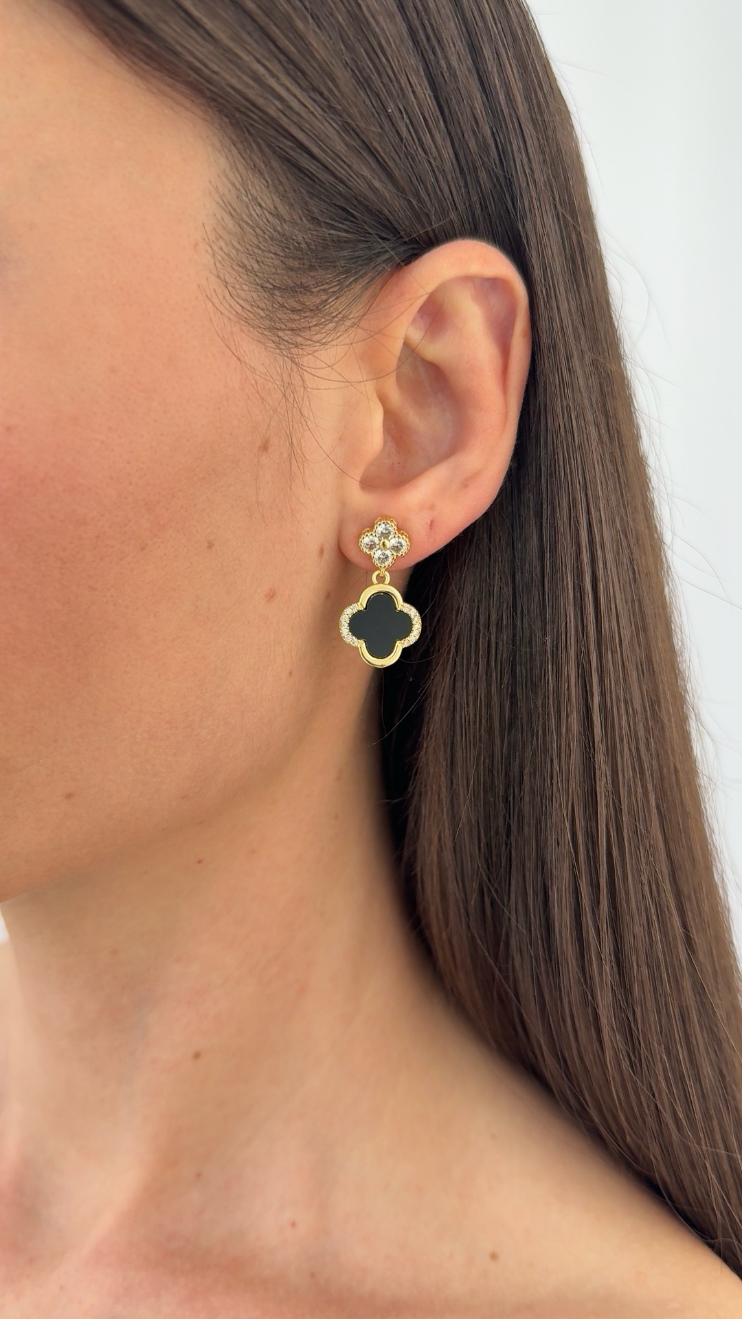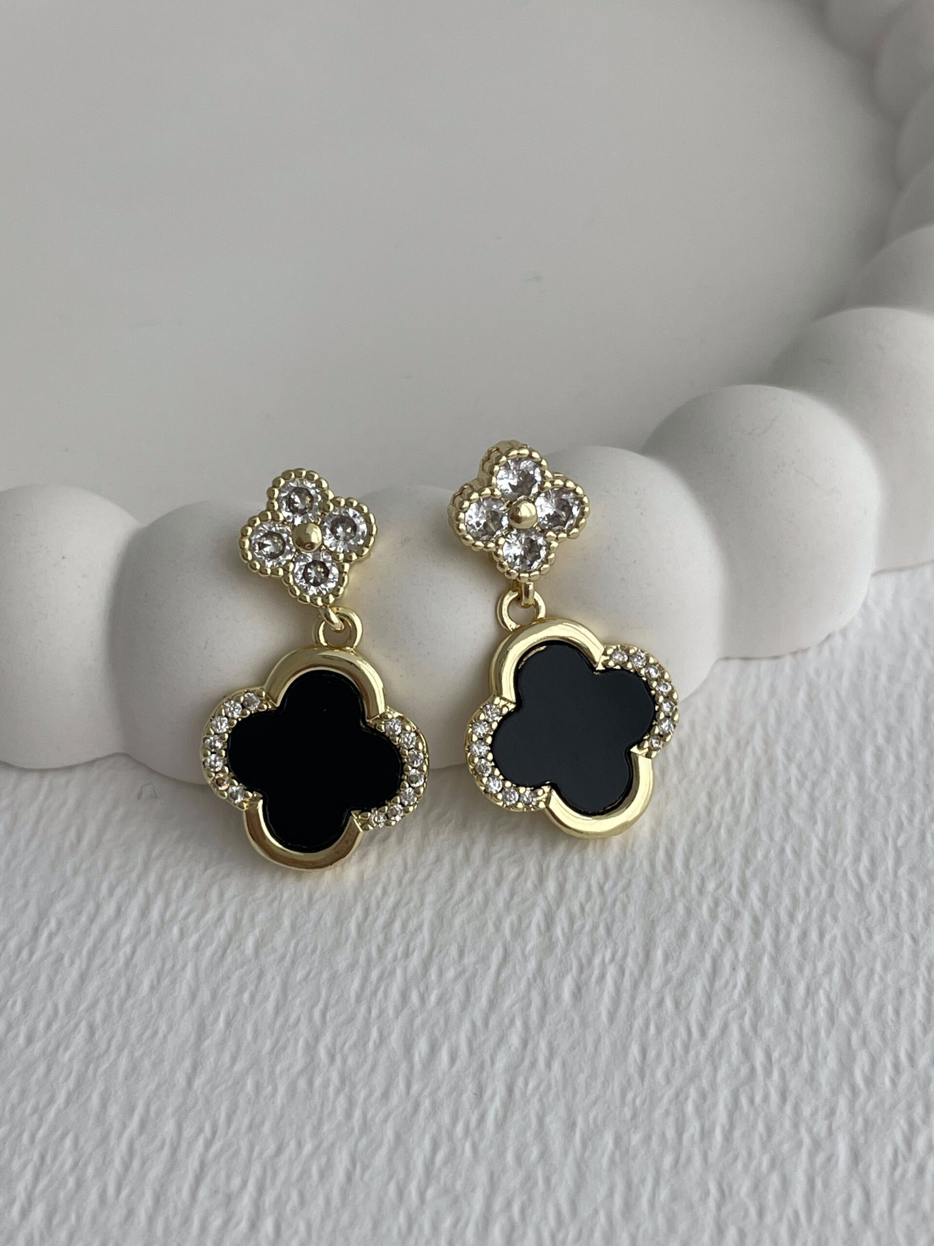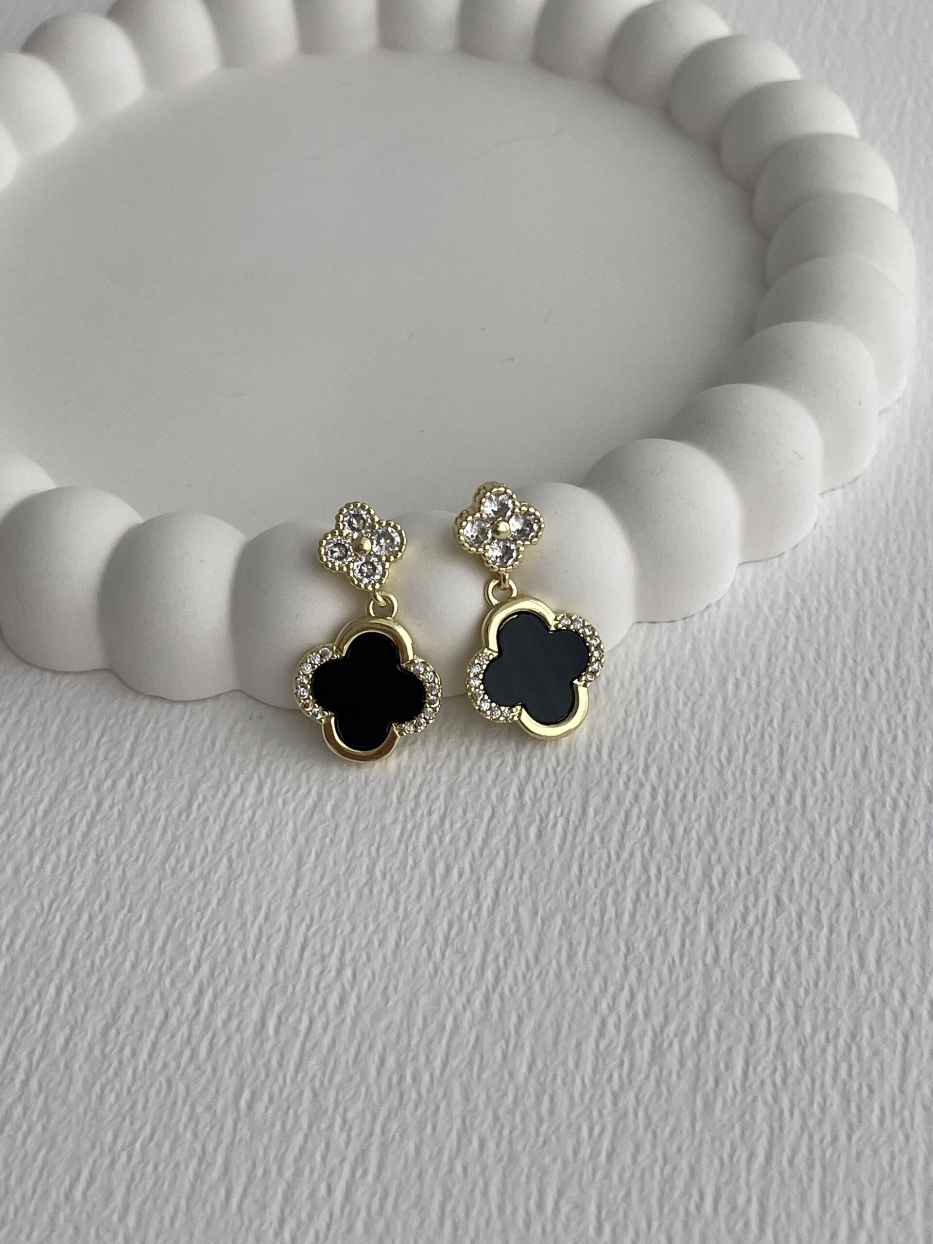 Özel Seri Marka Model Yonca Tasarım Zirkon Taşlı Siyah Mineli İkili Gold Küpe