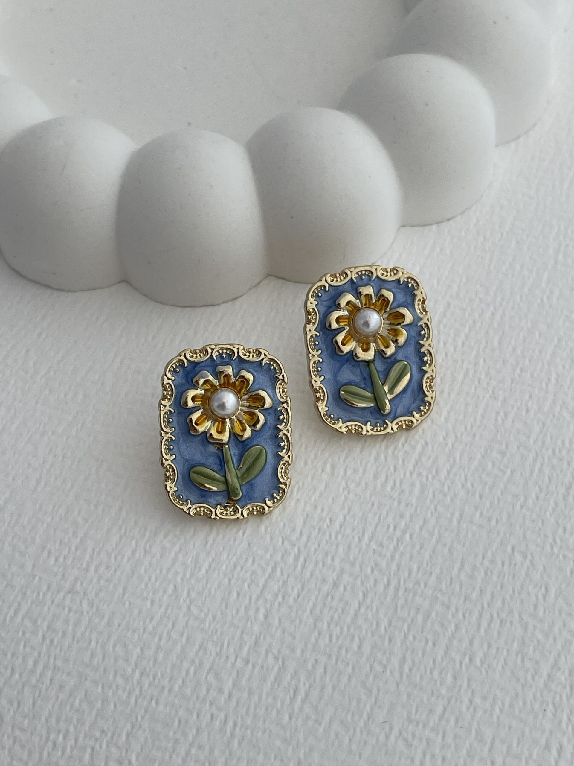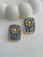 Özel Seri Mavi Çiçek Tasarım Gold Dikdörtgen Küpe