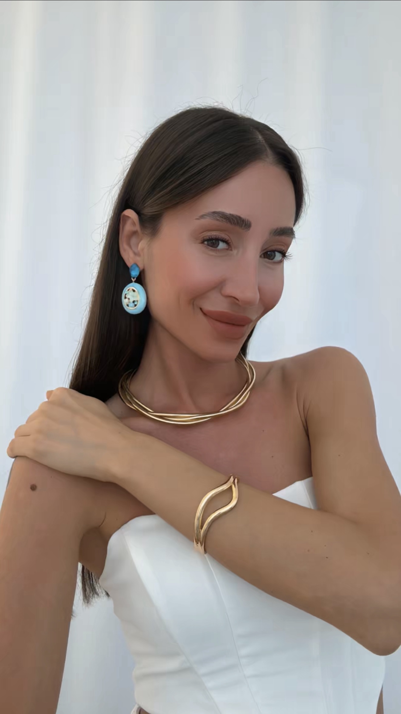 Özel Seri Mavi Taş Oval Tasarım Gold Küpe