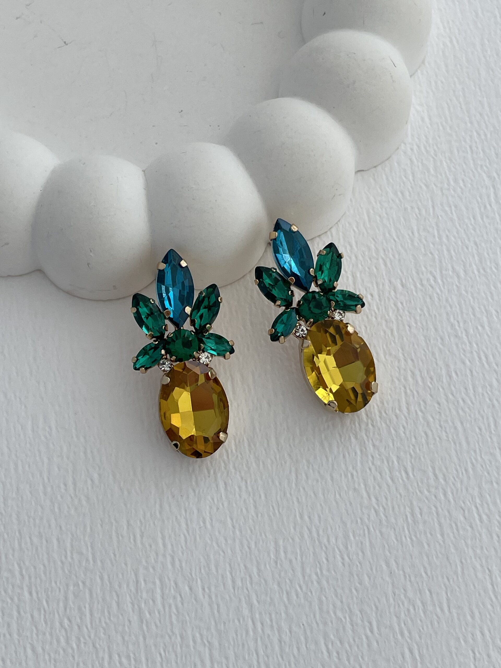 Özel Seri Mavi Yeşil Ananas Tasarım Gold Küpe