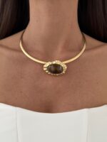 Özel Seri Oval Desenli Tasarım Kahverengi Mineli Gold Choker