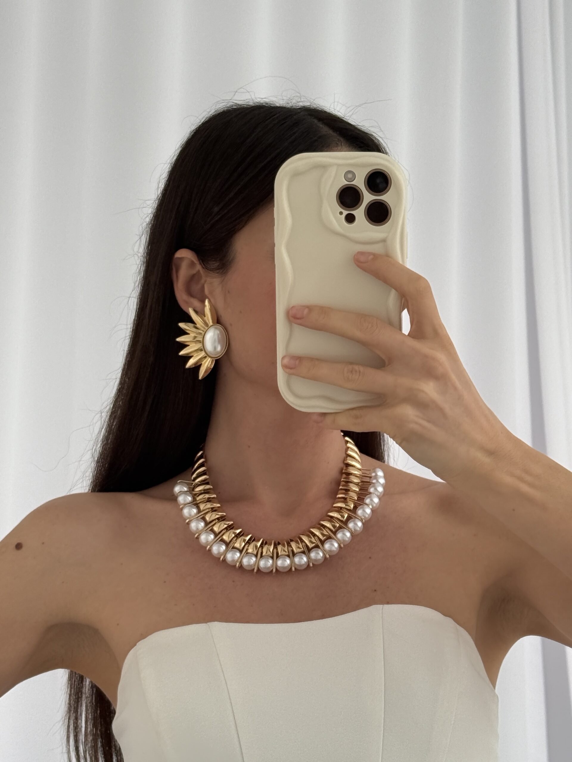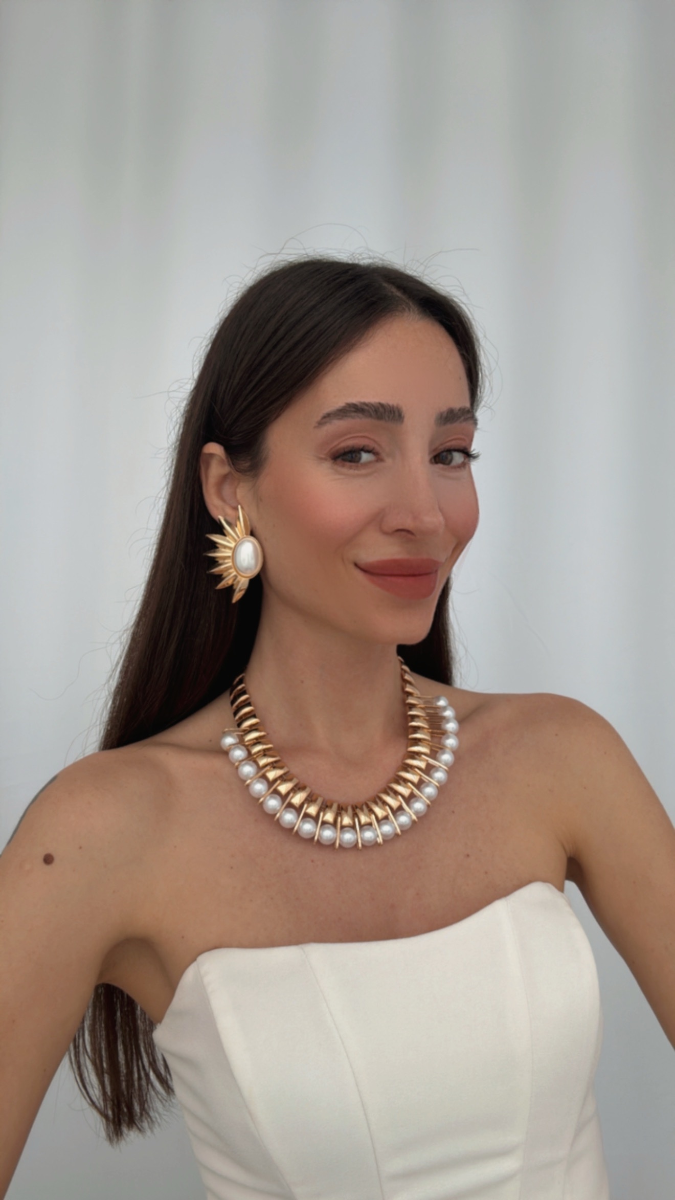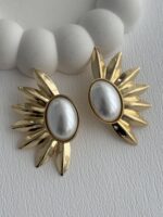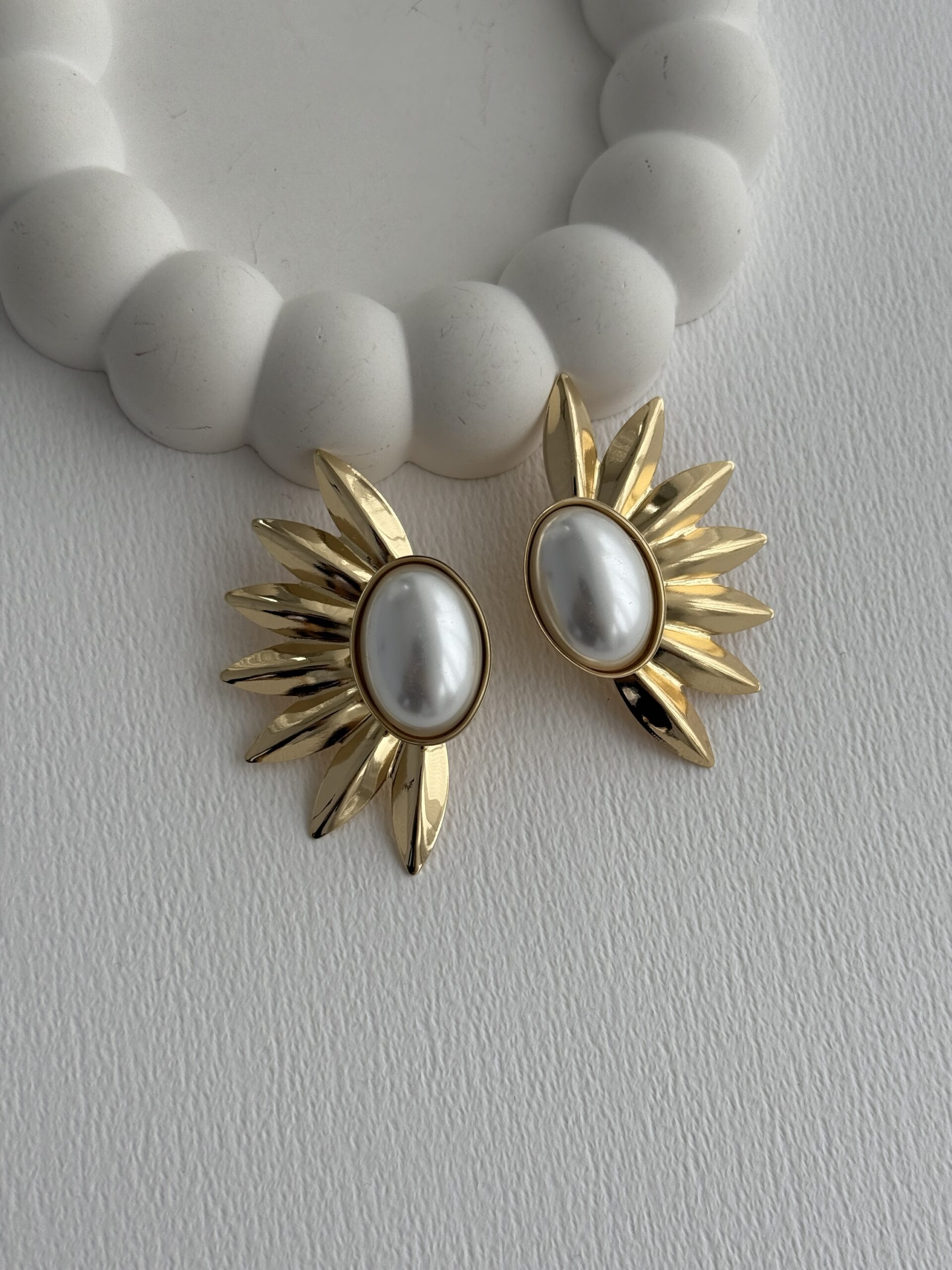 Özel Seri Oval İnci Detay Yarım Çiçek Gold Küpe