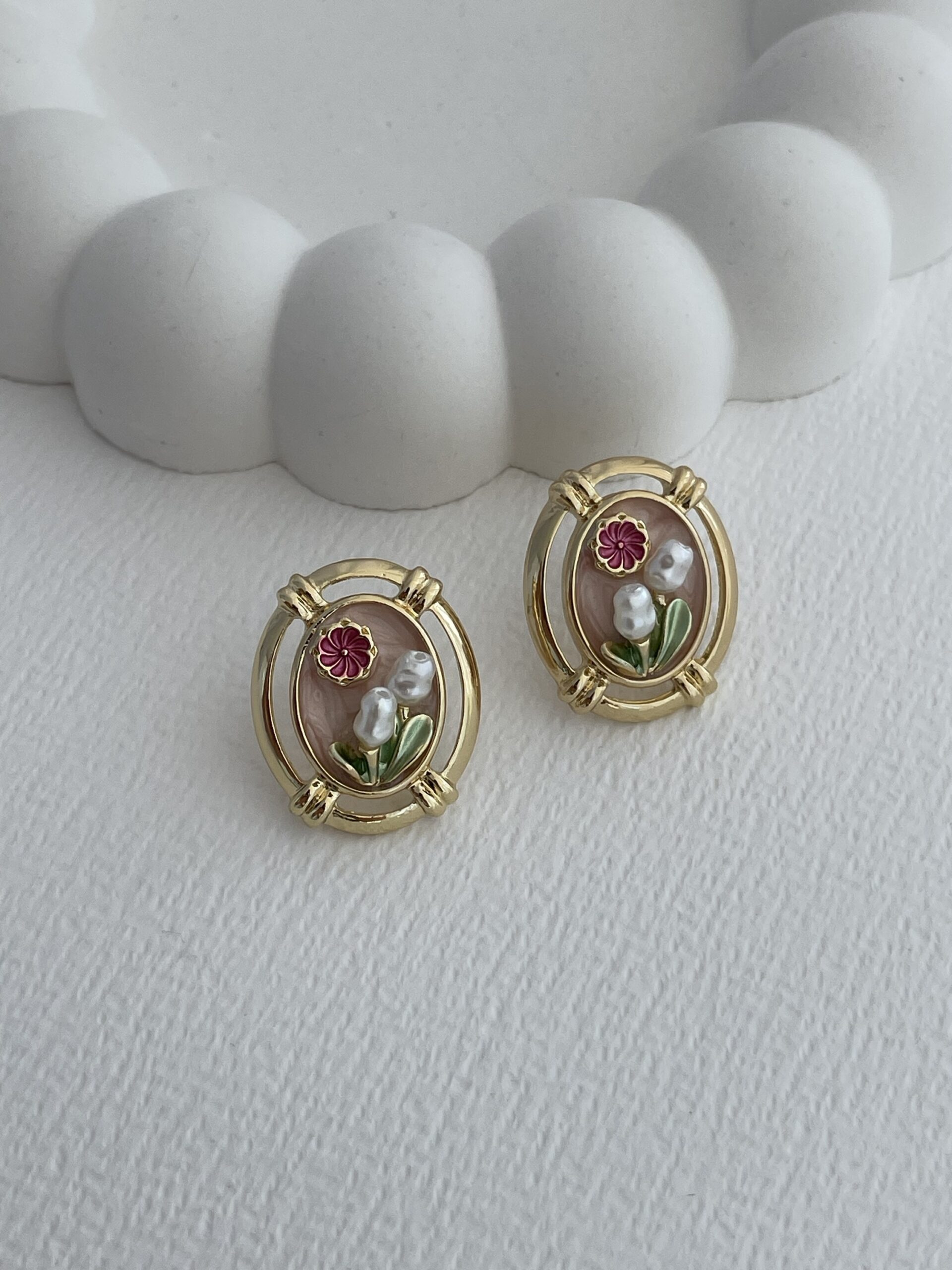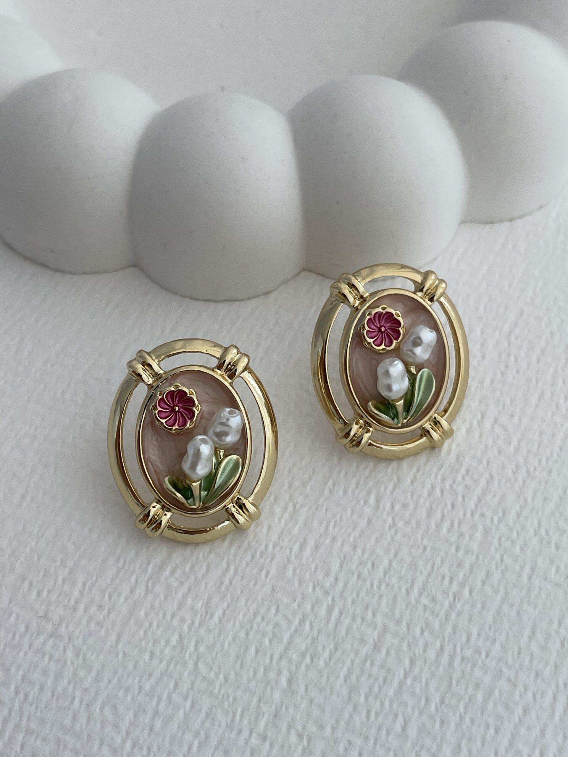 Özel Seri Pembe Çiçek Tasarım Gold Oval Küpe