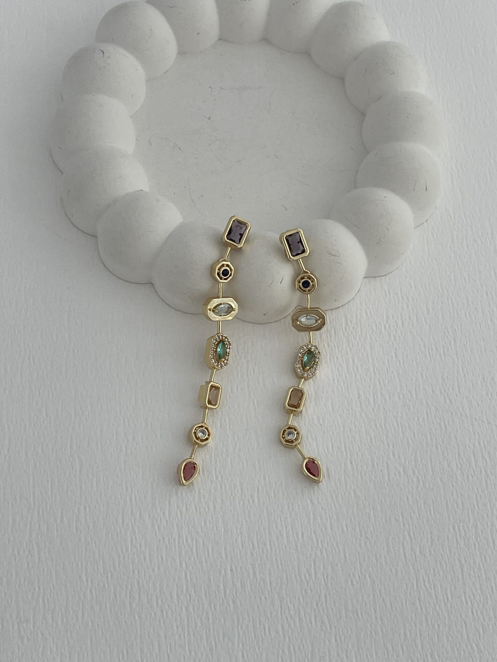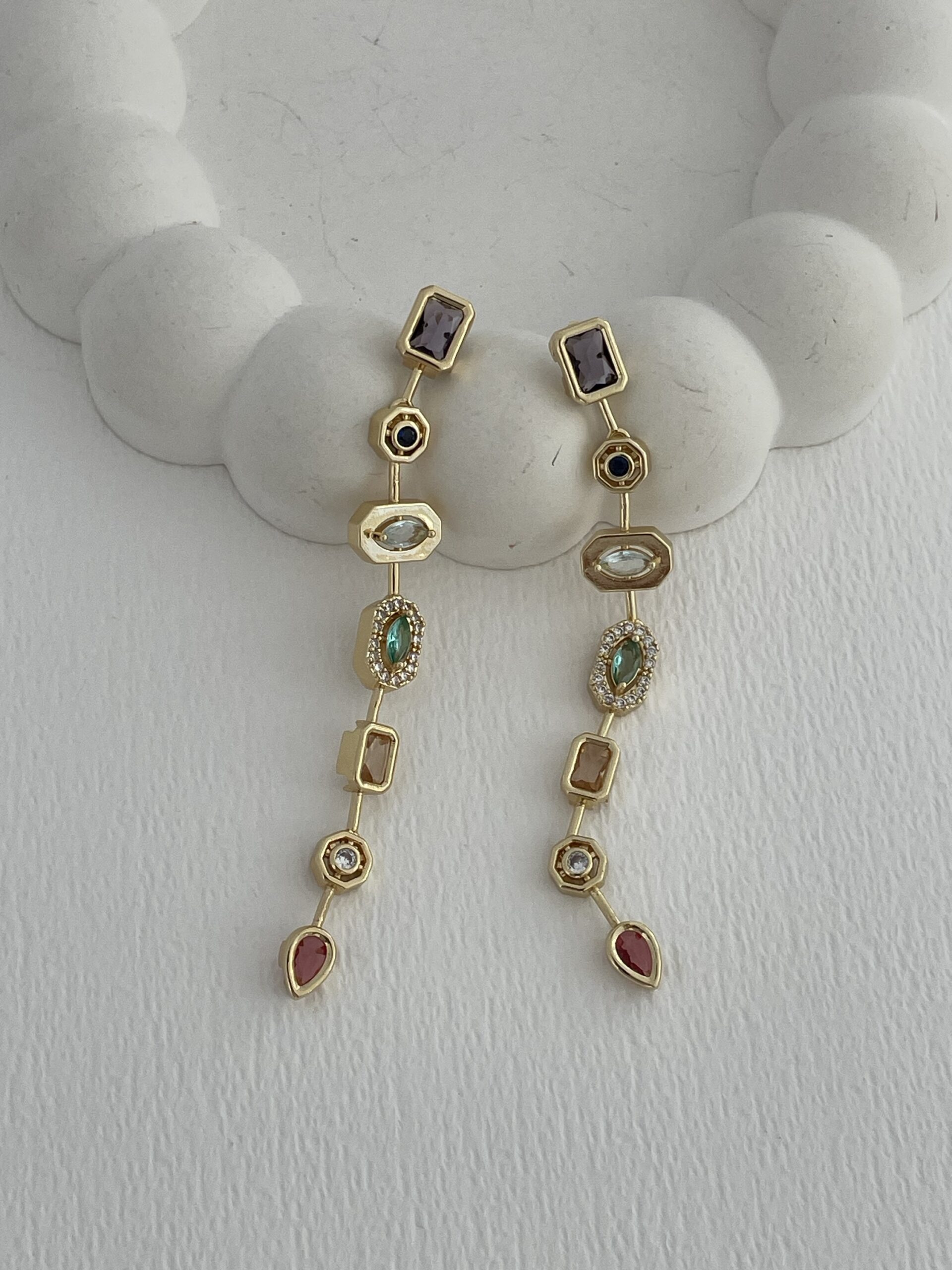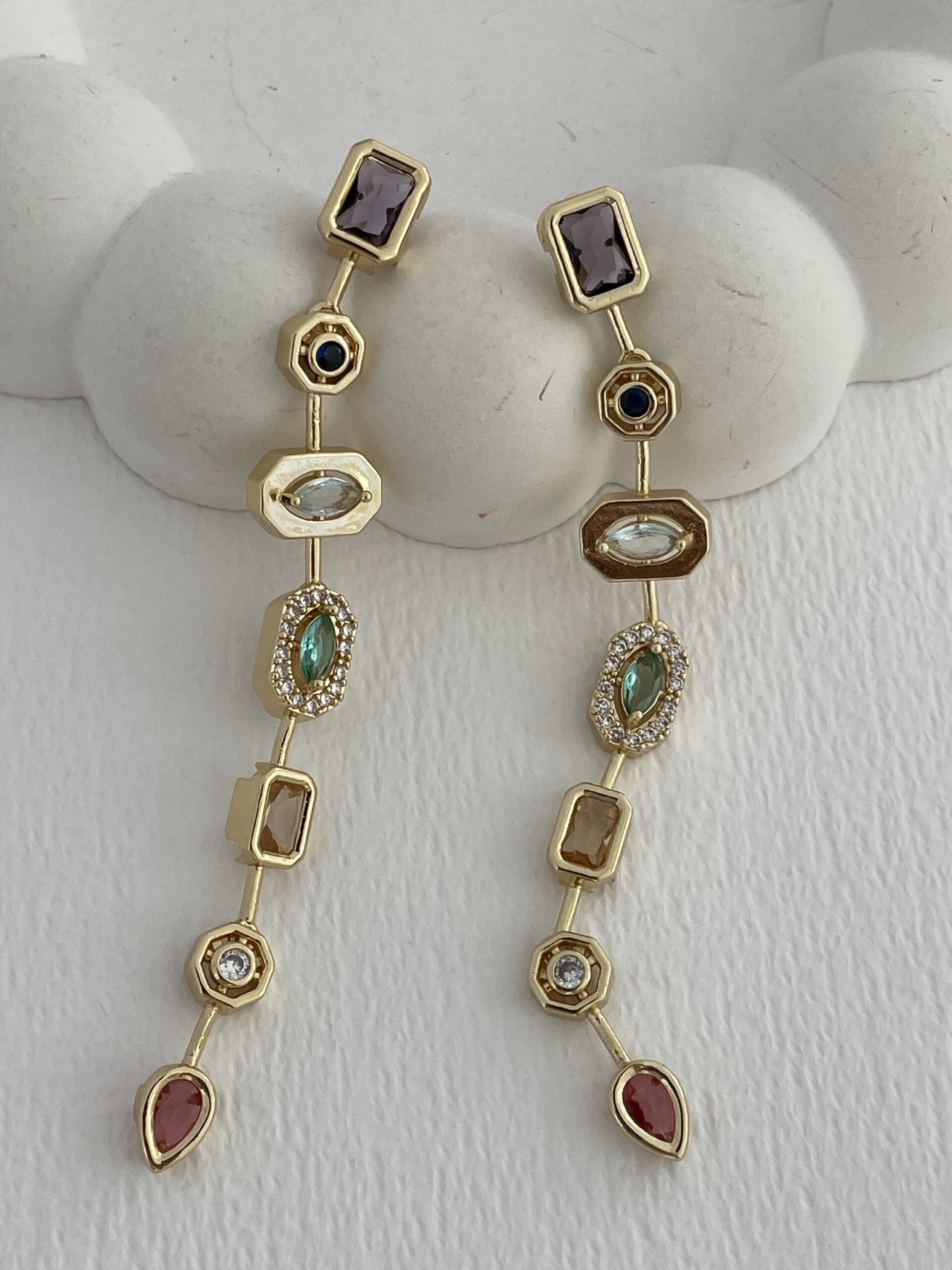Özel Seri Renkli Taş Geometrik Tasarım Uzun Gold Küpe