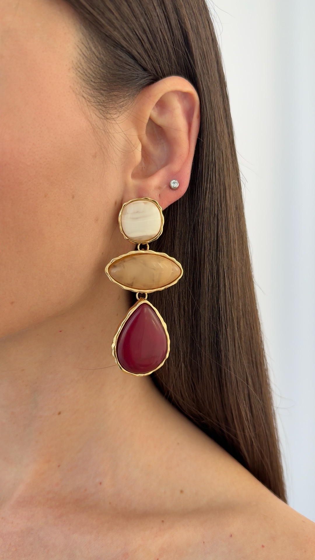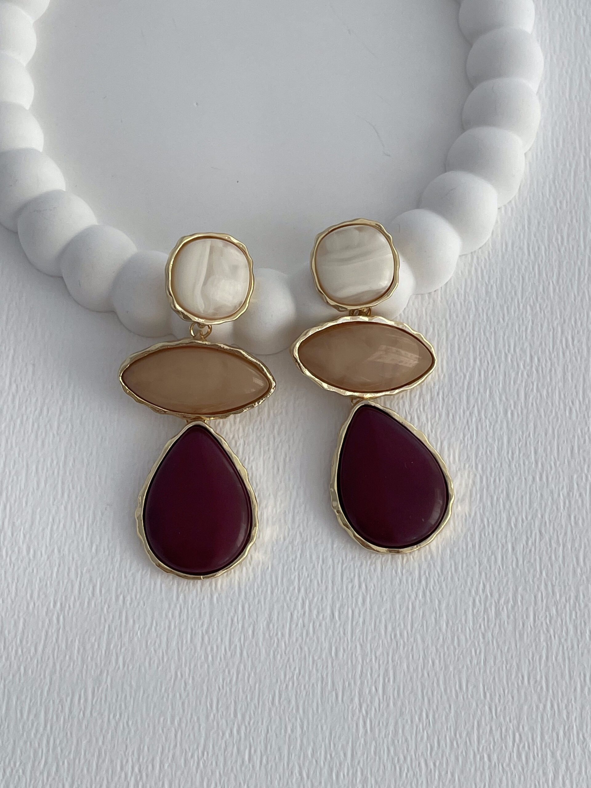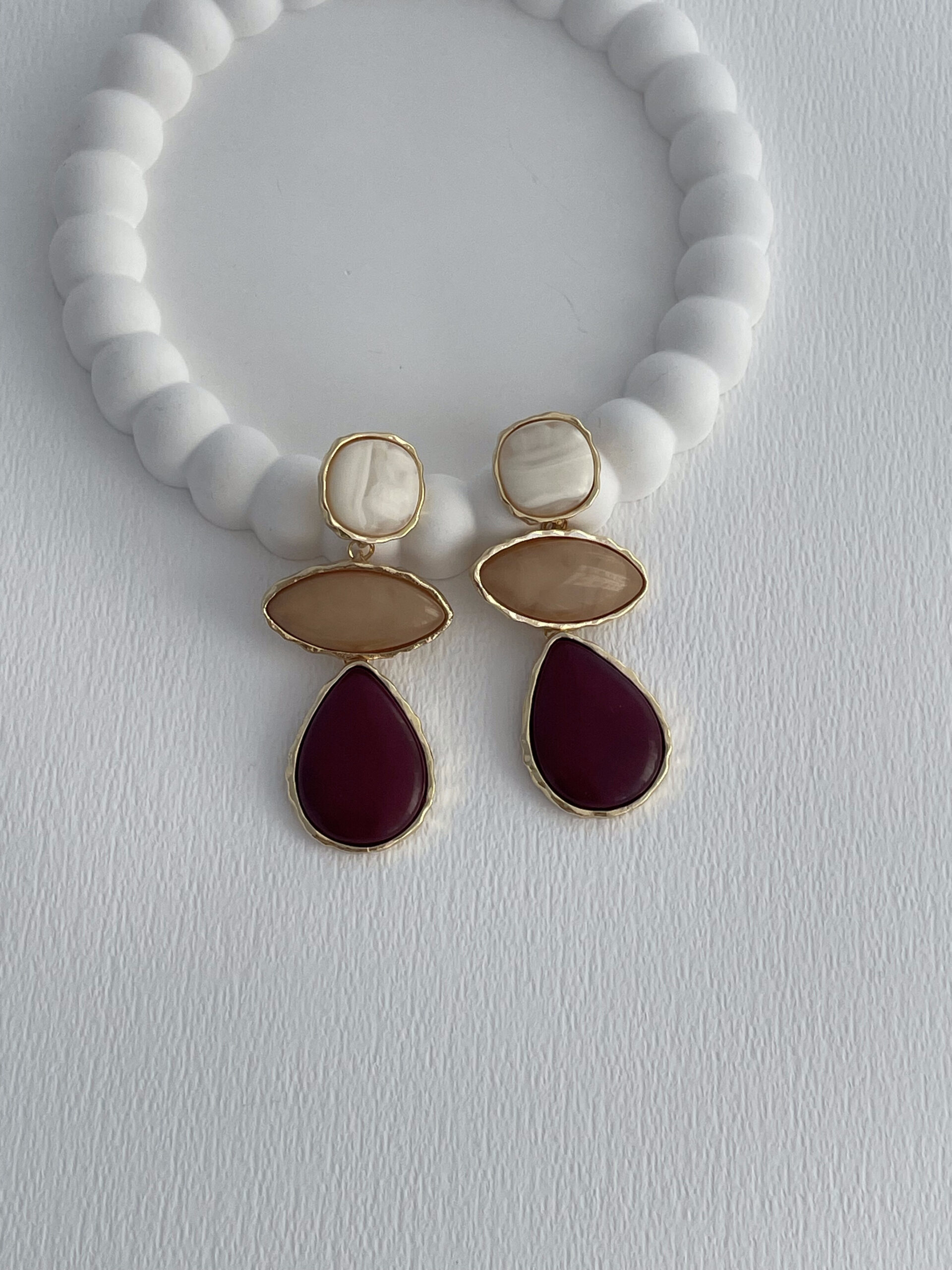 Özel Seri Sallantılı Bordo & Bej Taş Tasarım Damla Detay Gold Küpe