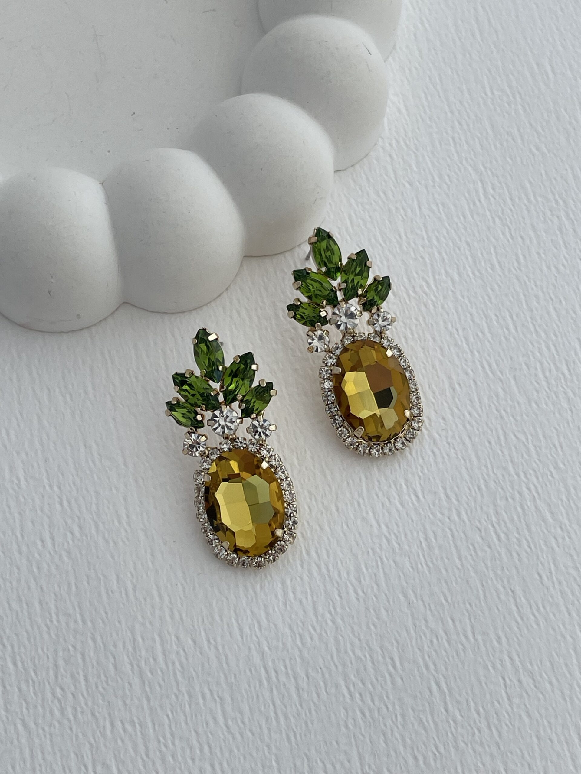 Özel Seri Sarı Yeşil Taşlı Ananas Tasarım Gold Küpe