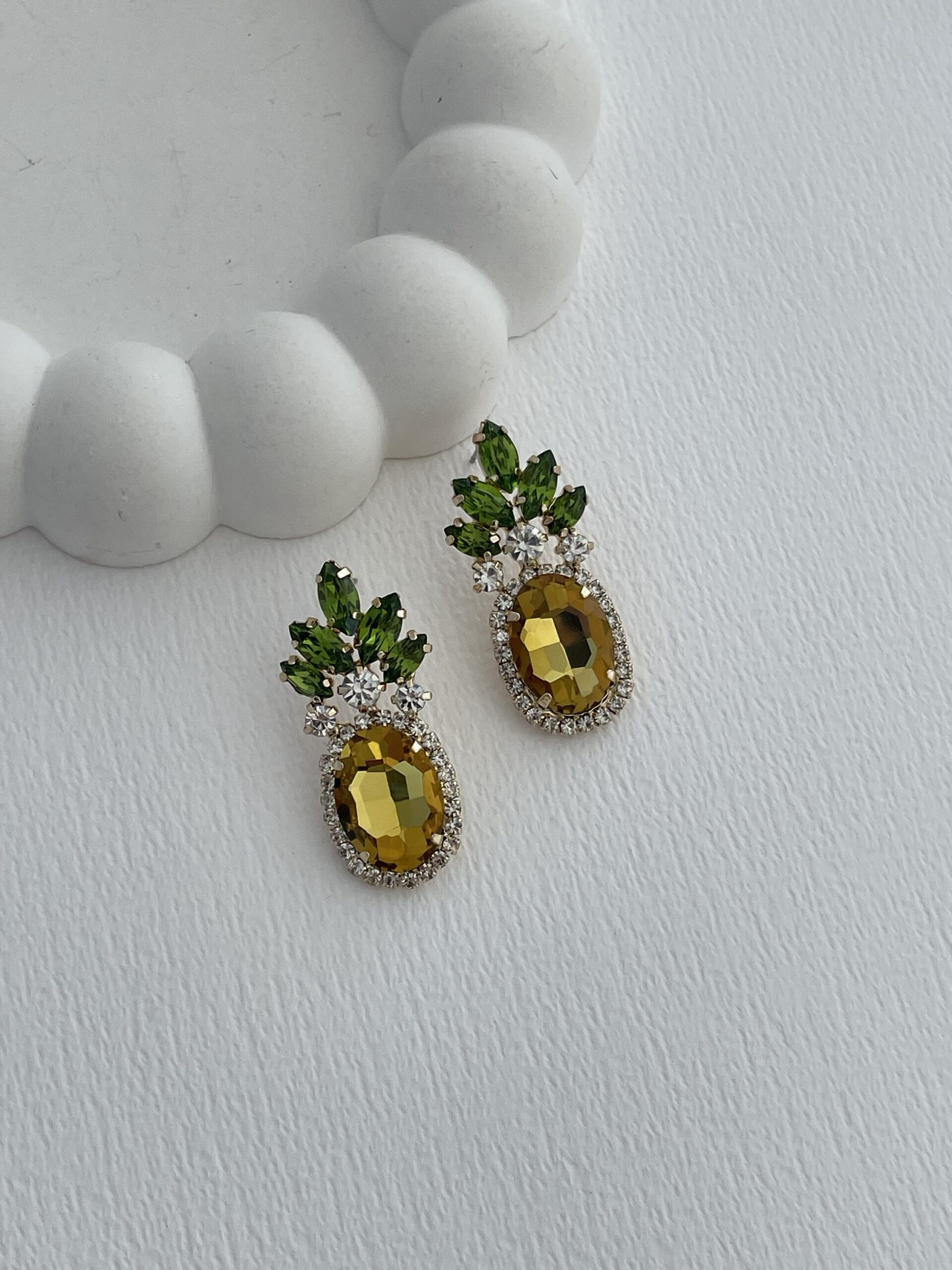 Özel Seri Sarı Yeşil Taşlı Ananas Tasarım Gold Küpe