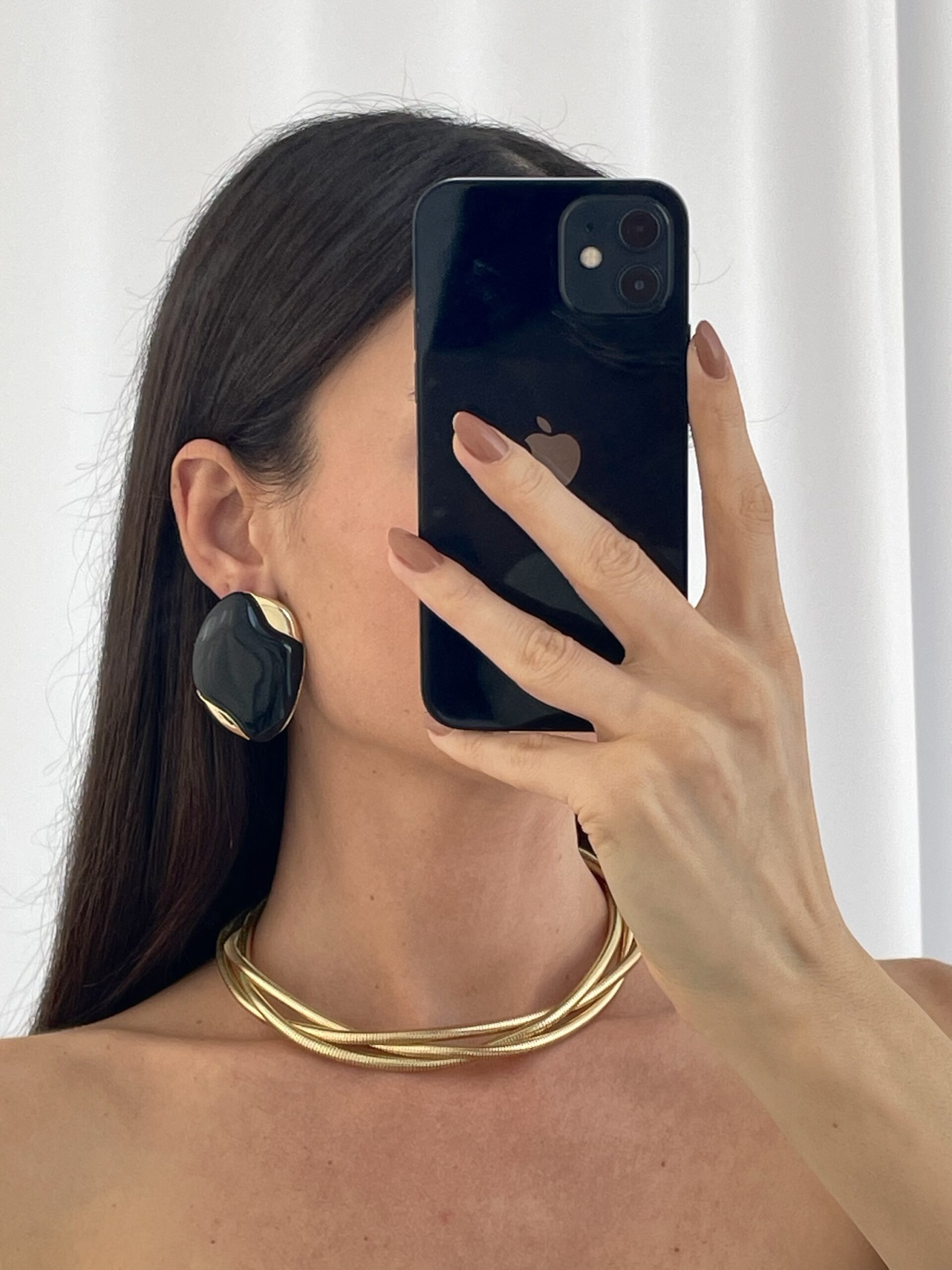 Özel Seri Siyah Kemik Oval Soyut Tasarım Gold Küpe
