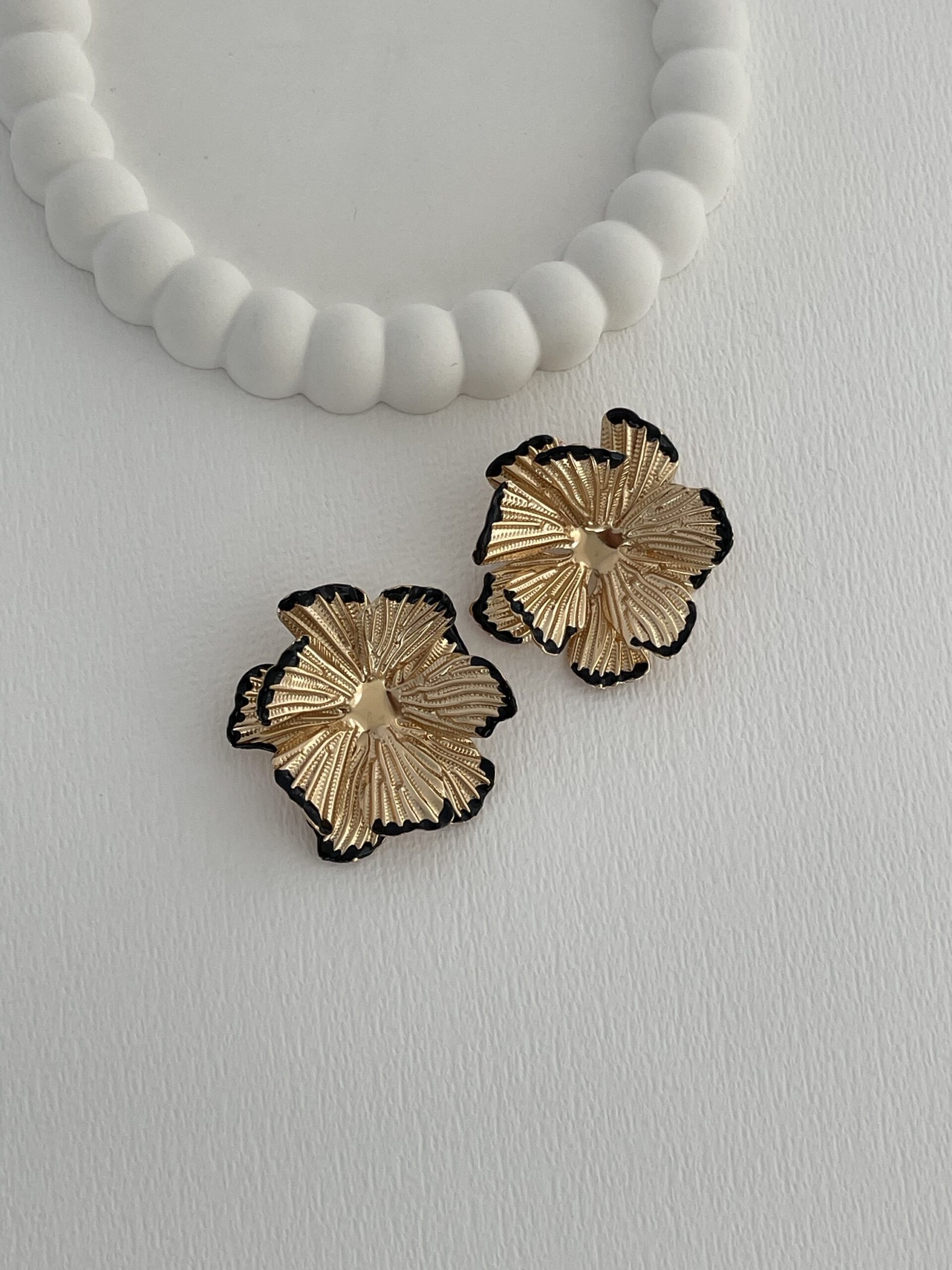 Özel Seri Siyah Mineli Çiçek Tasarım Gold Küpe