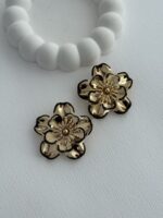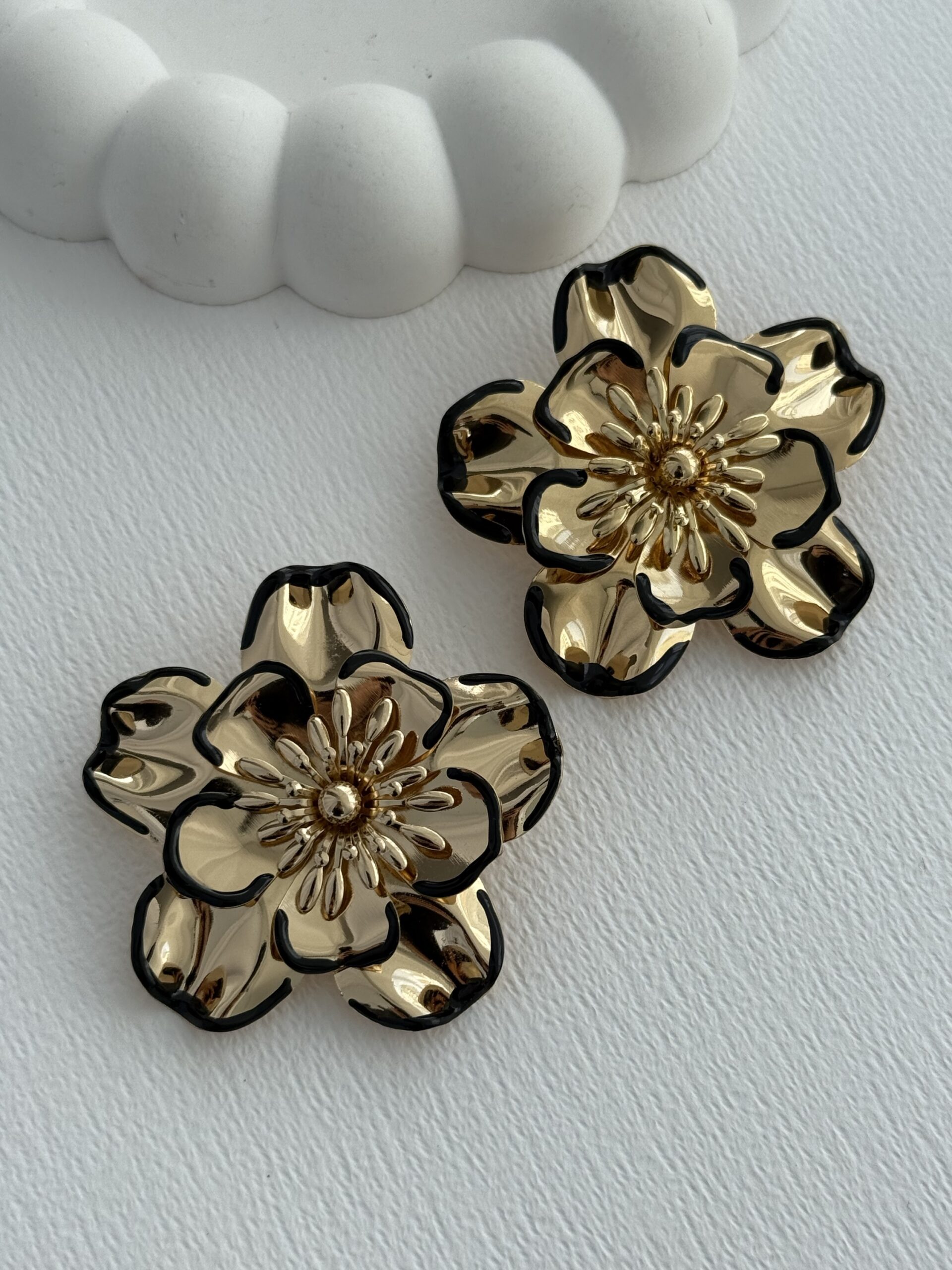 Özel Seri Siyah Mineli Çiçek Tasarım Gold Küpe