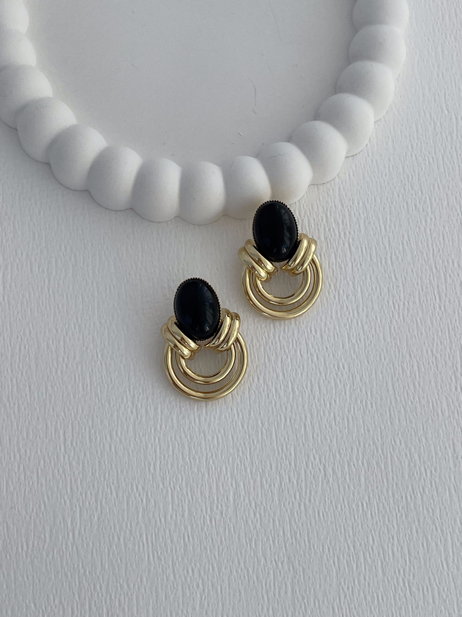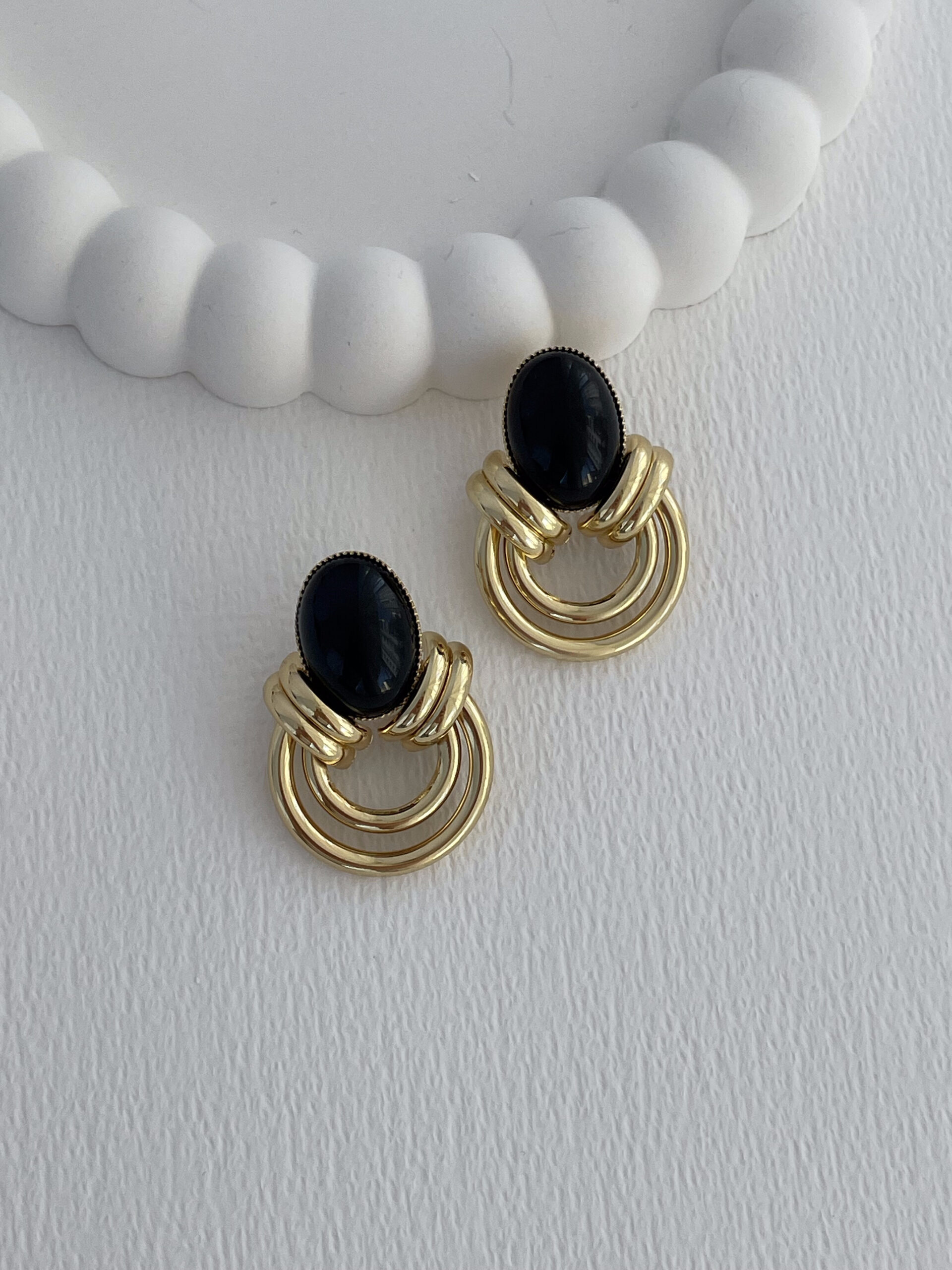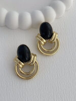 Özel Seri Siyah Mineli İç İçe Halka Tasarım Gold Küpe
