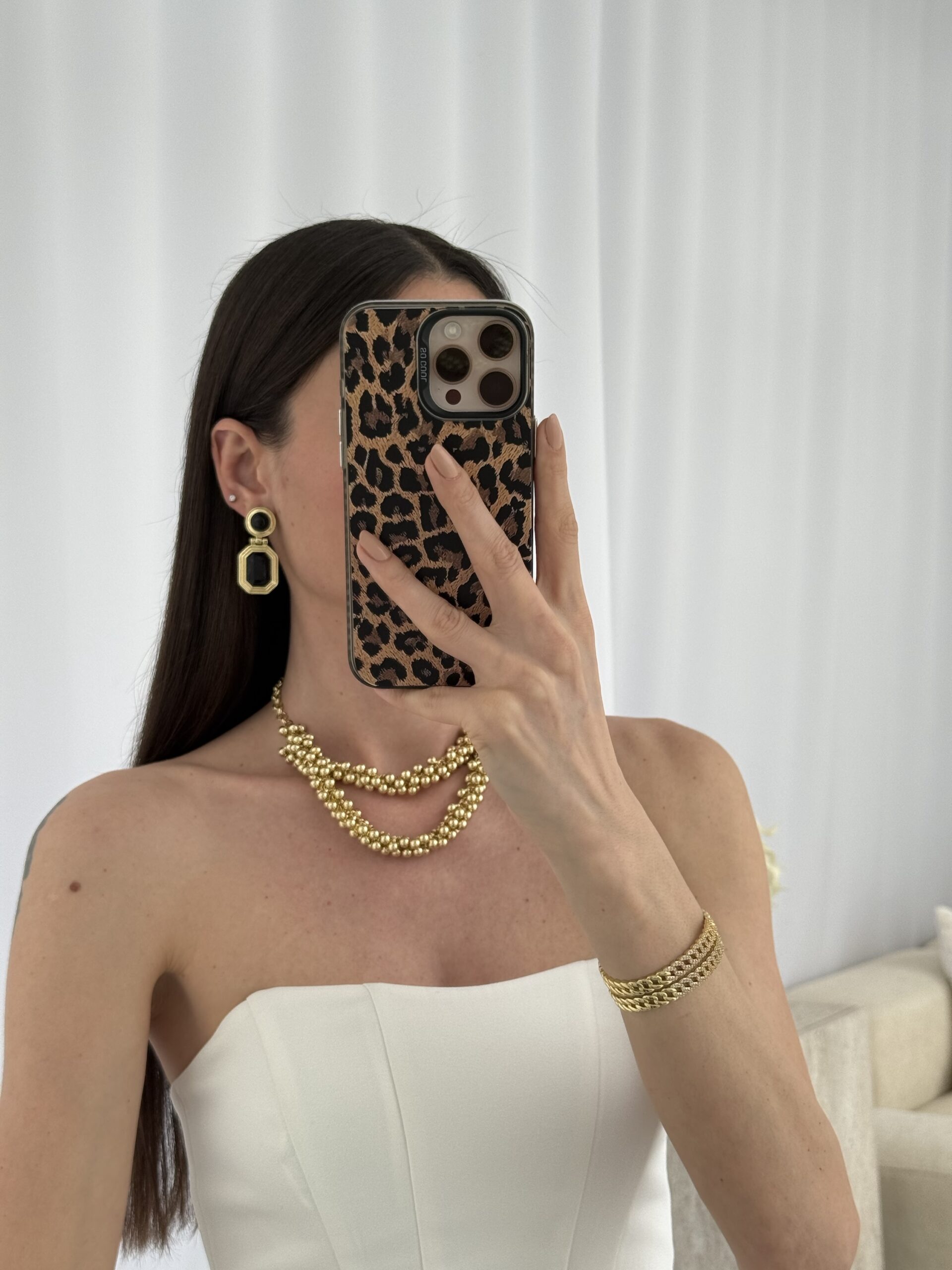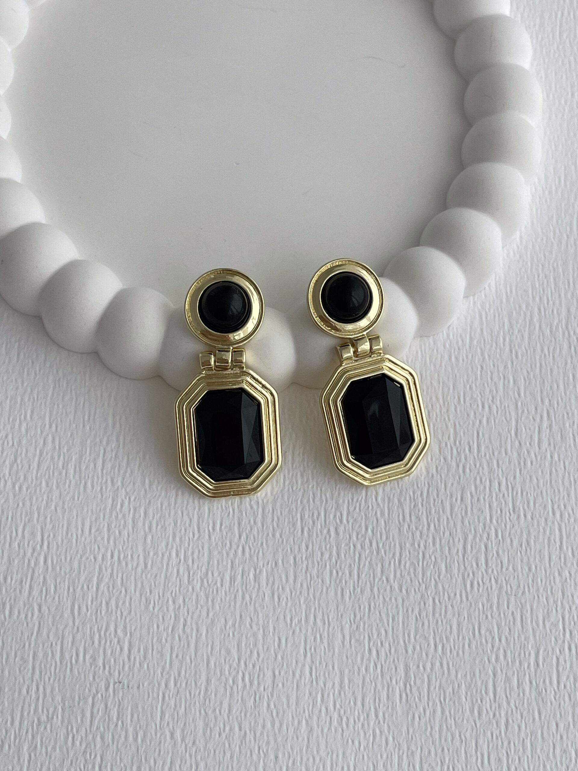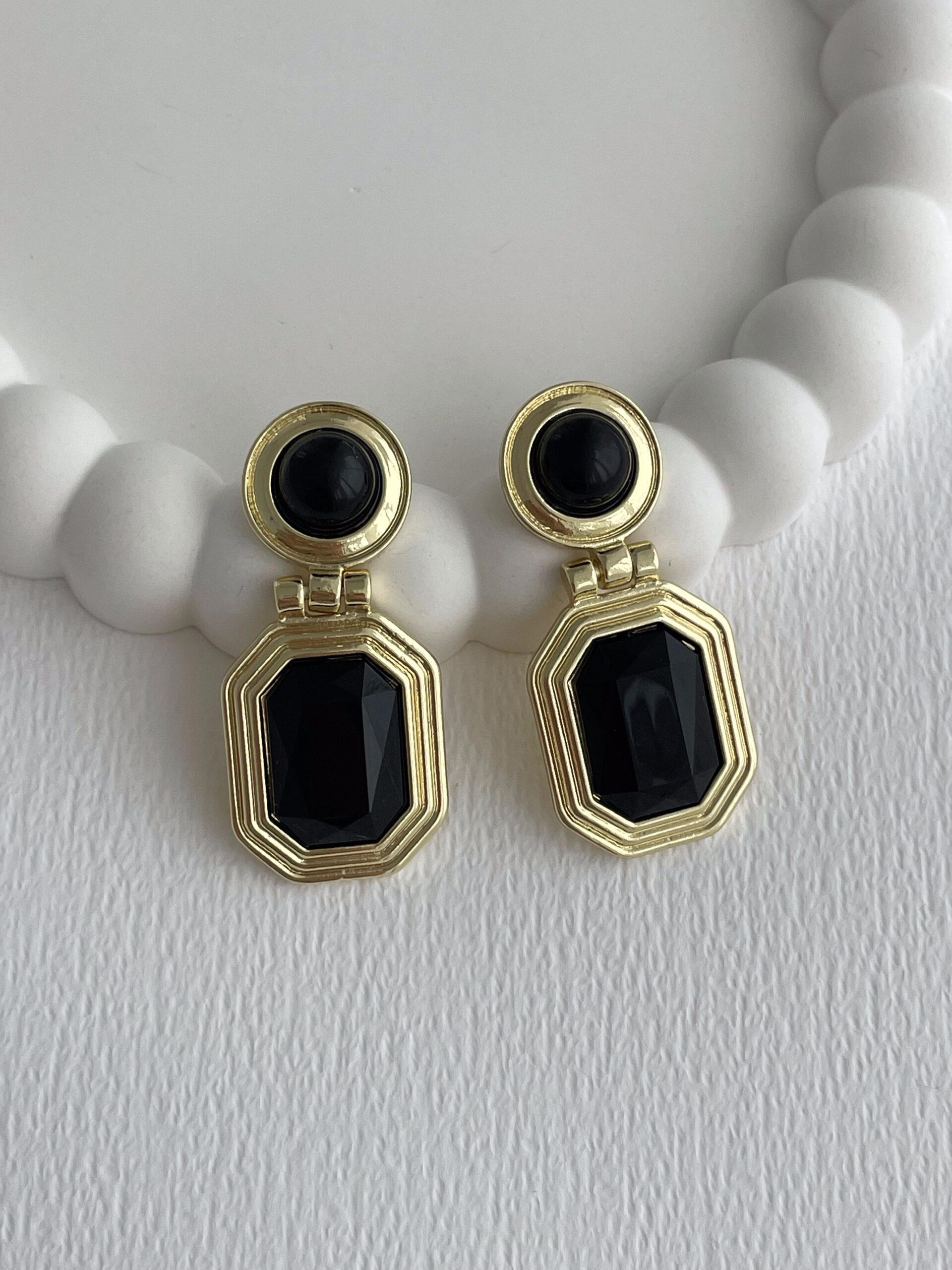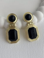 Özel Seri Siyah Mineli Sallantılı Dikdörtgen Tasarım Gold Küpe