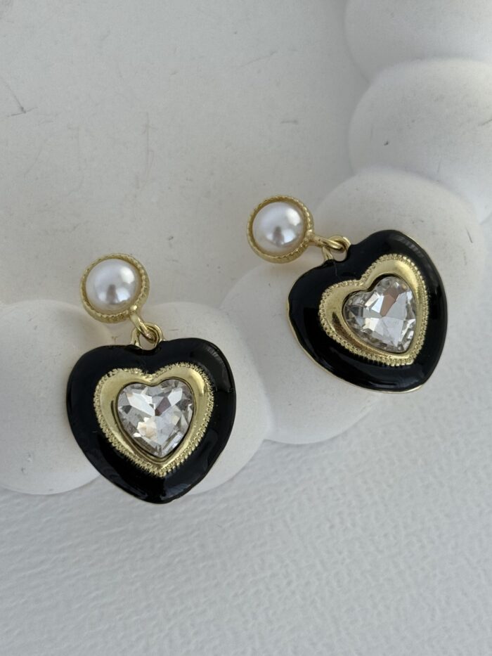 Özel Seri Taş Detay Kalp Tasarım İncili Siyah Gold Küpe