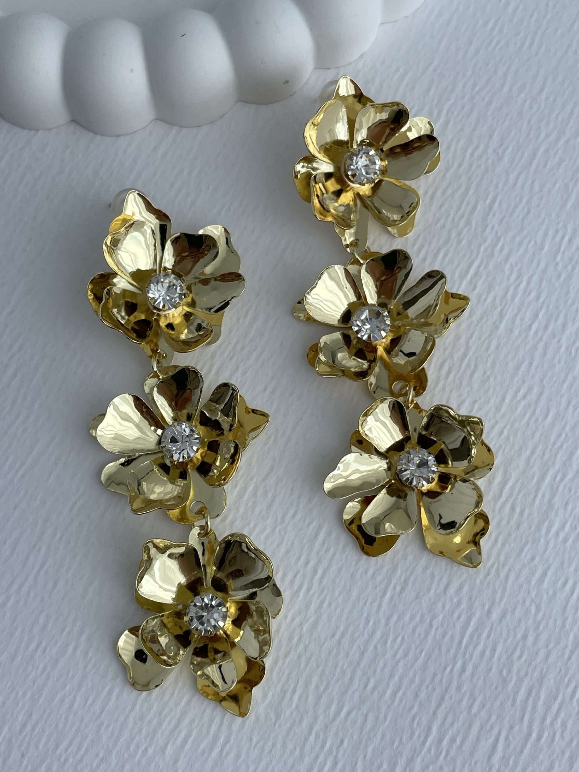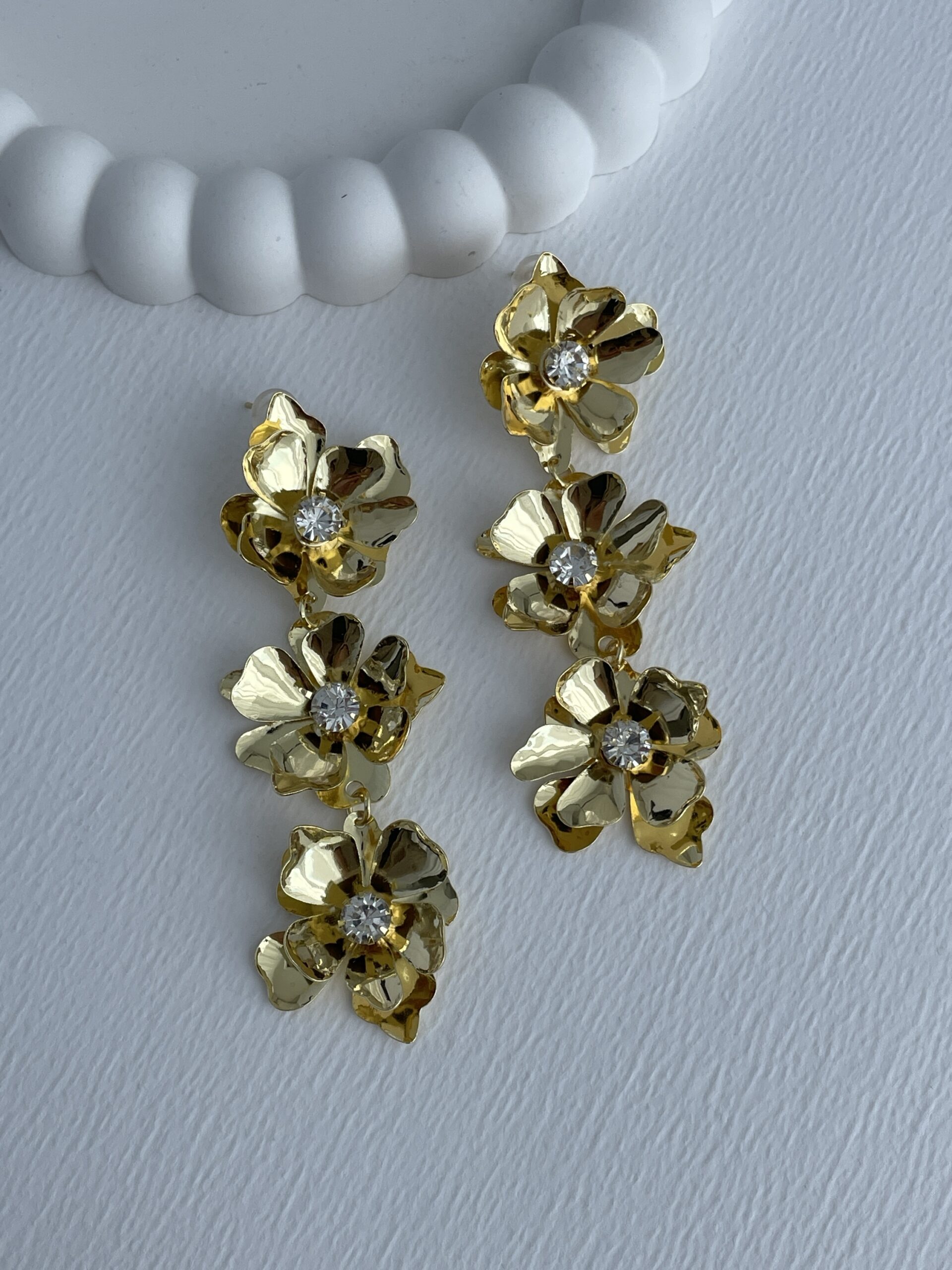Özel Seri Tek Taş Detaylı Gold Üçlü Çiçek Küpe 7cm