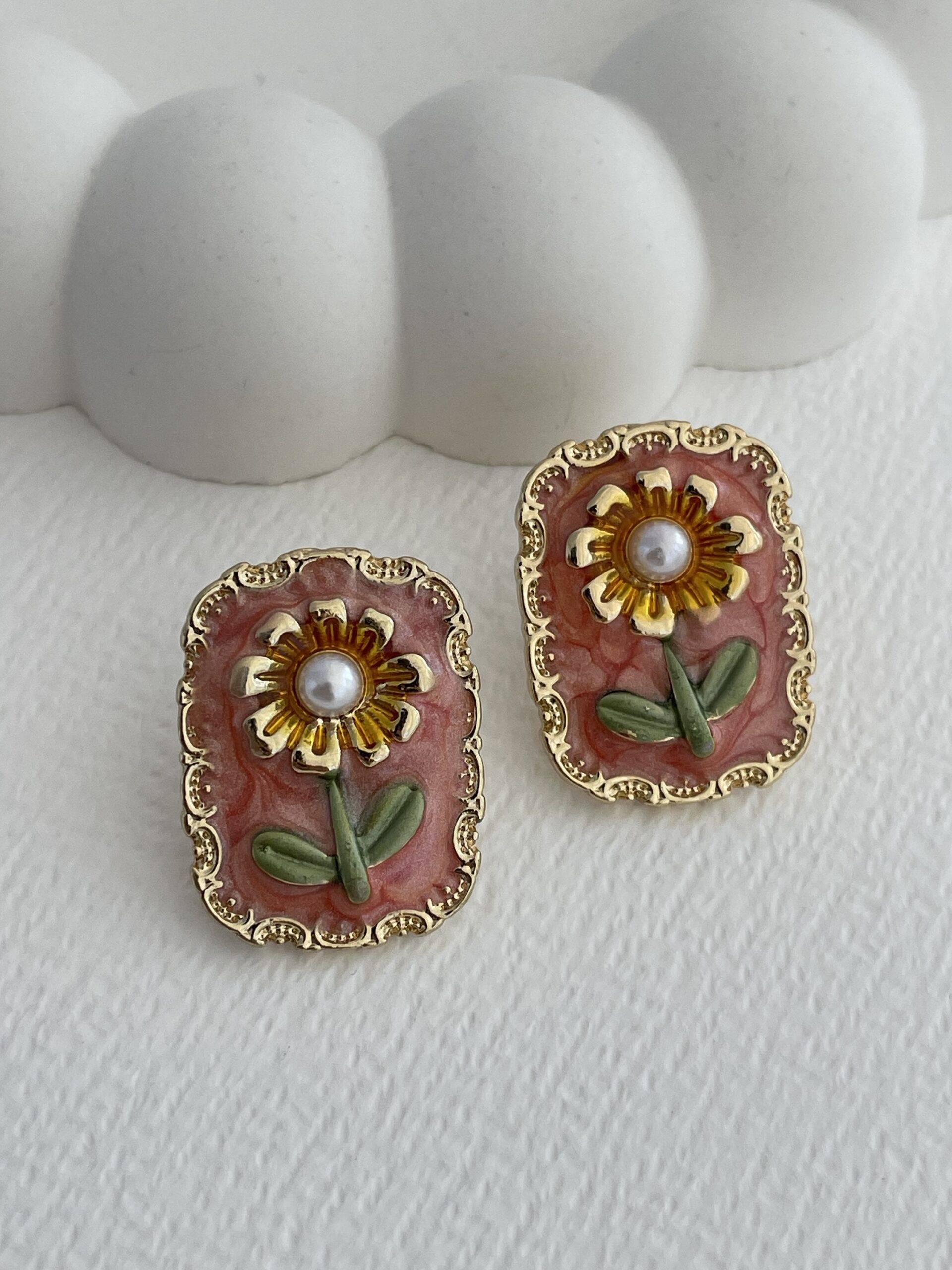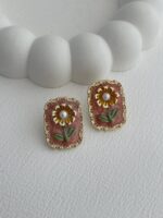 Özel Seri Turuncu Çiçek Tasarım Gold Dikdörtgen Küpe
