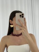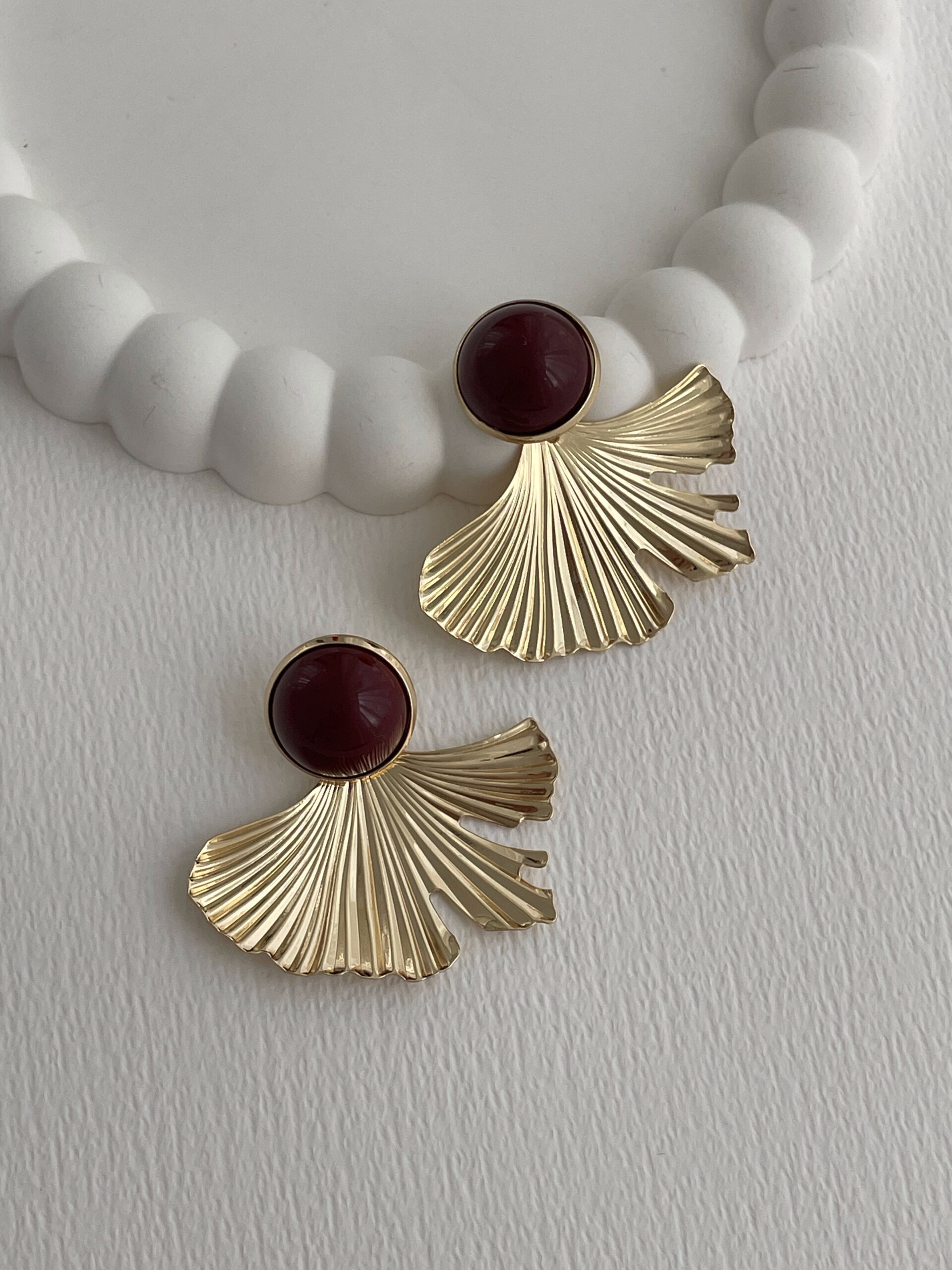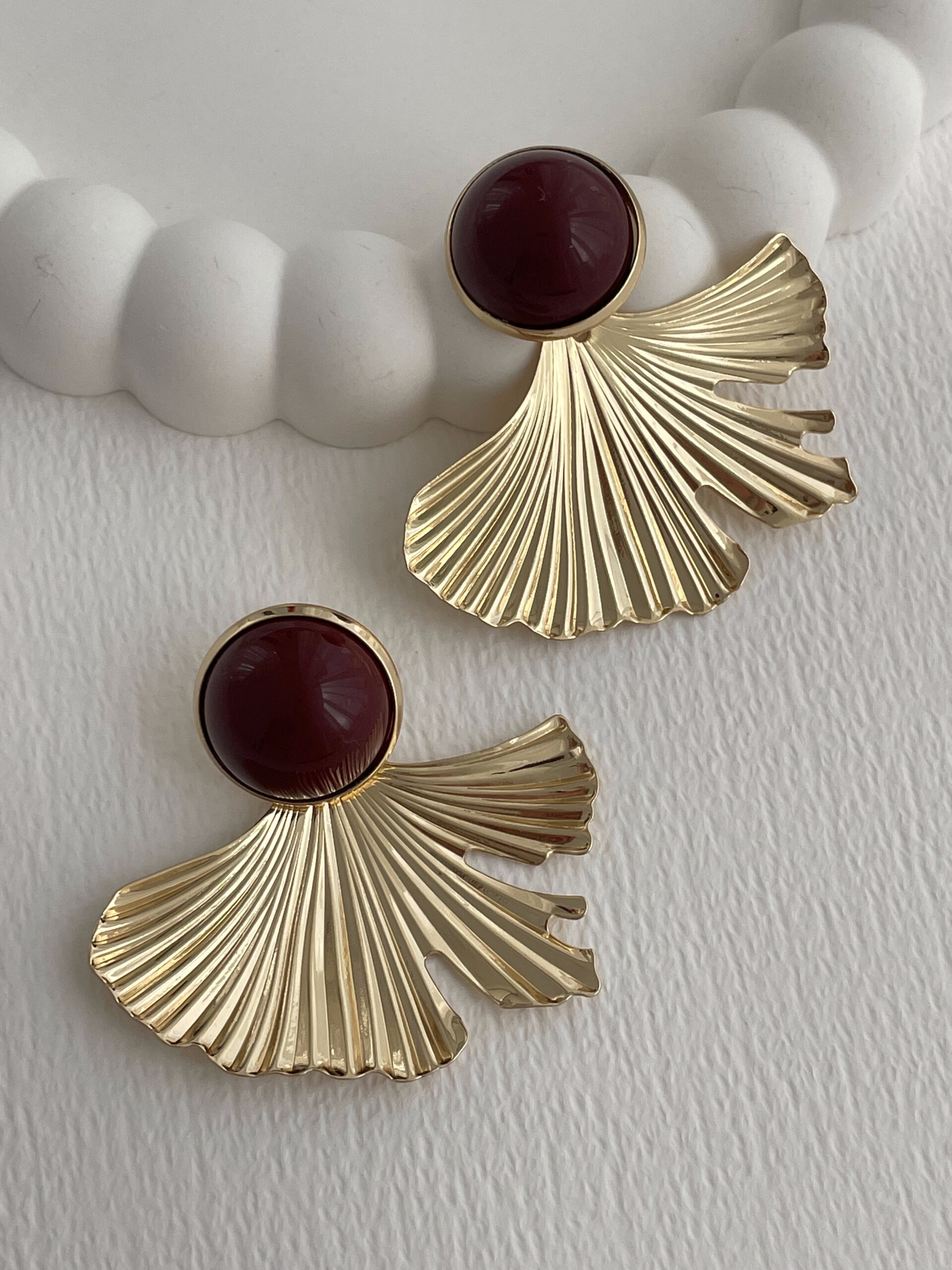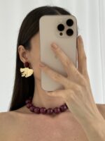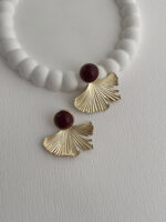 Özel Seri Yaprak Tasarım Bordo Mineli Gold Küpe