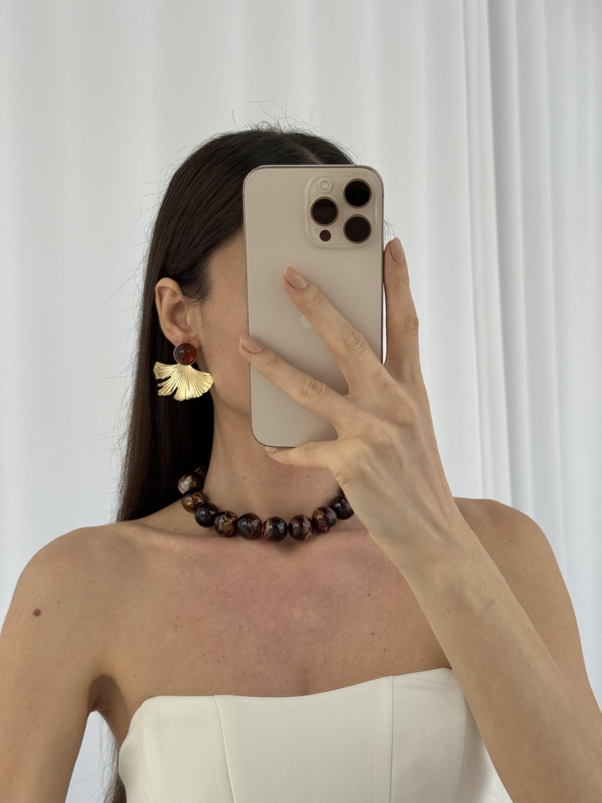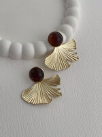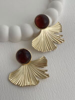 Özel Seri Yaprak Tasarım Kahverengi Mineli Gold Küpe