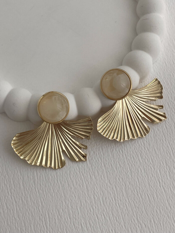 Özel Seri Yaprak Tasarım Krem Kemik Detay Gold Küpe