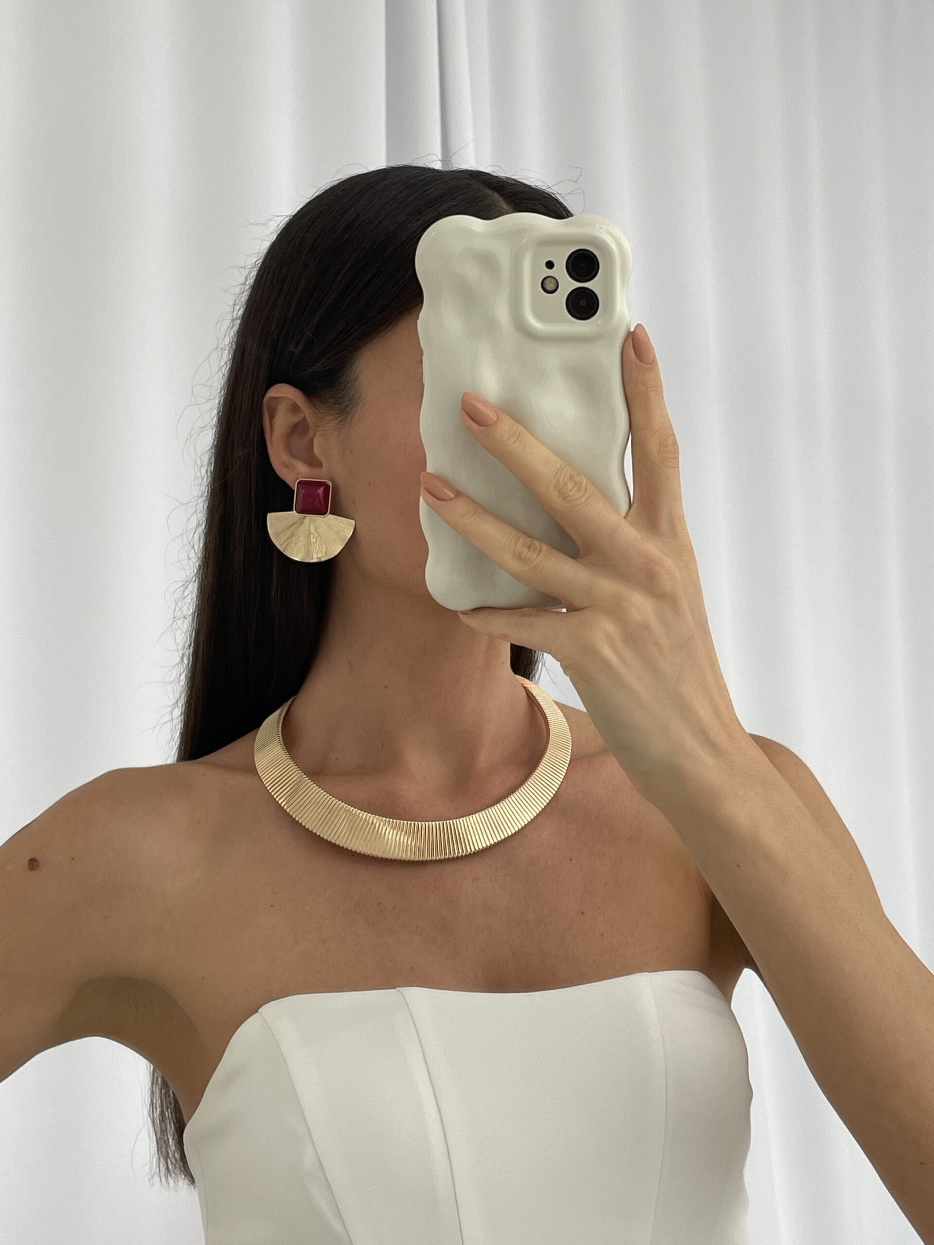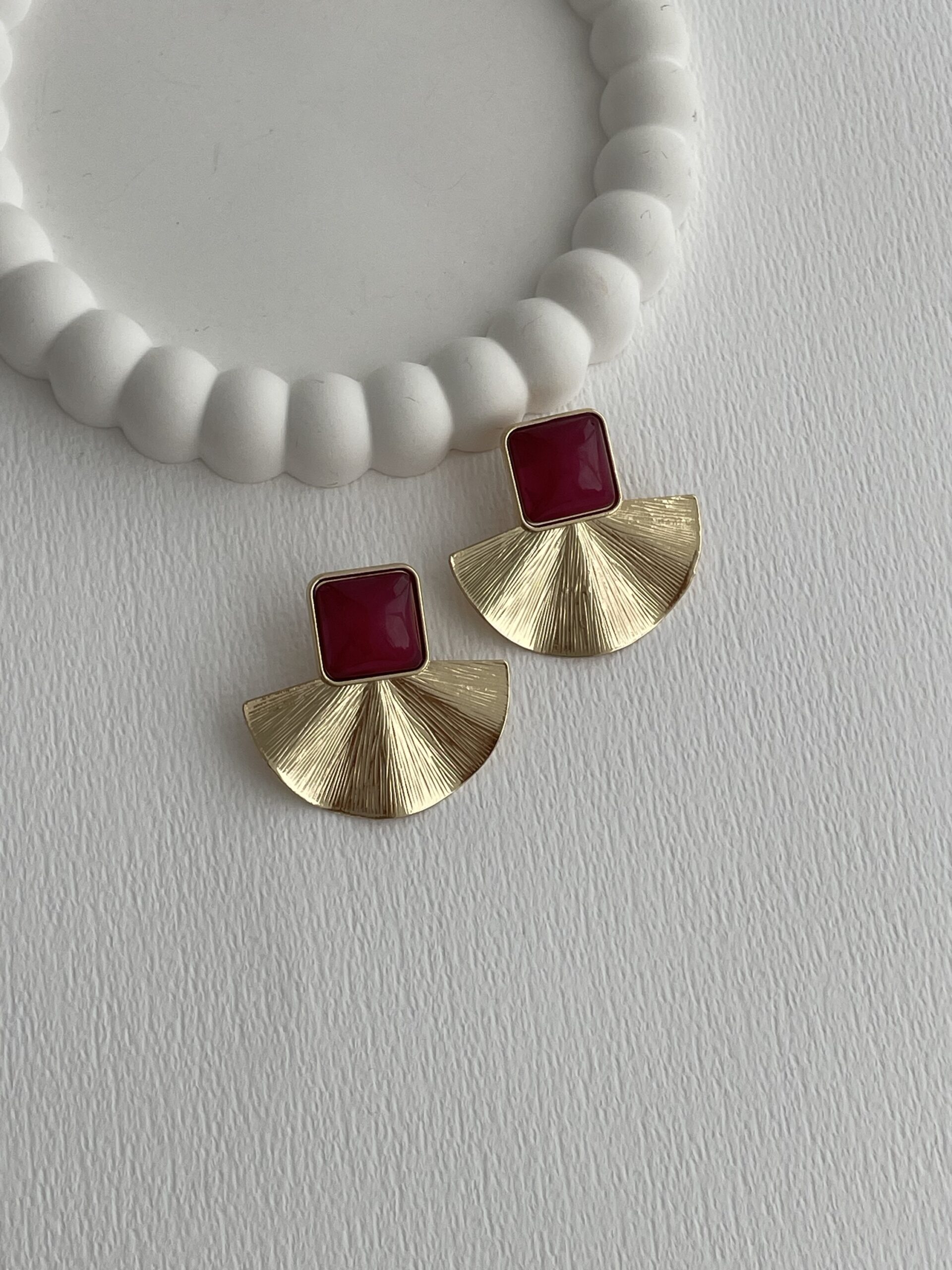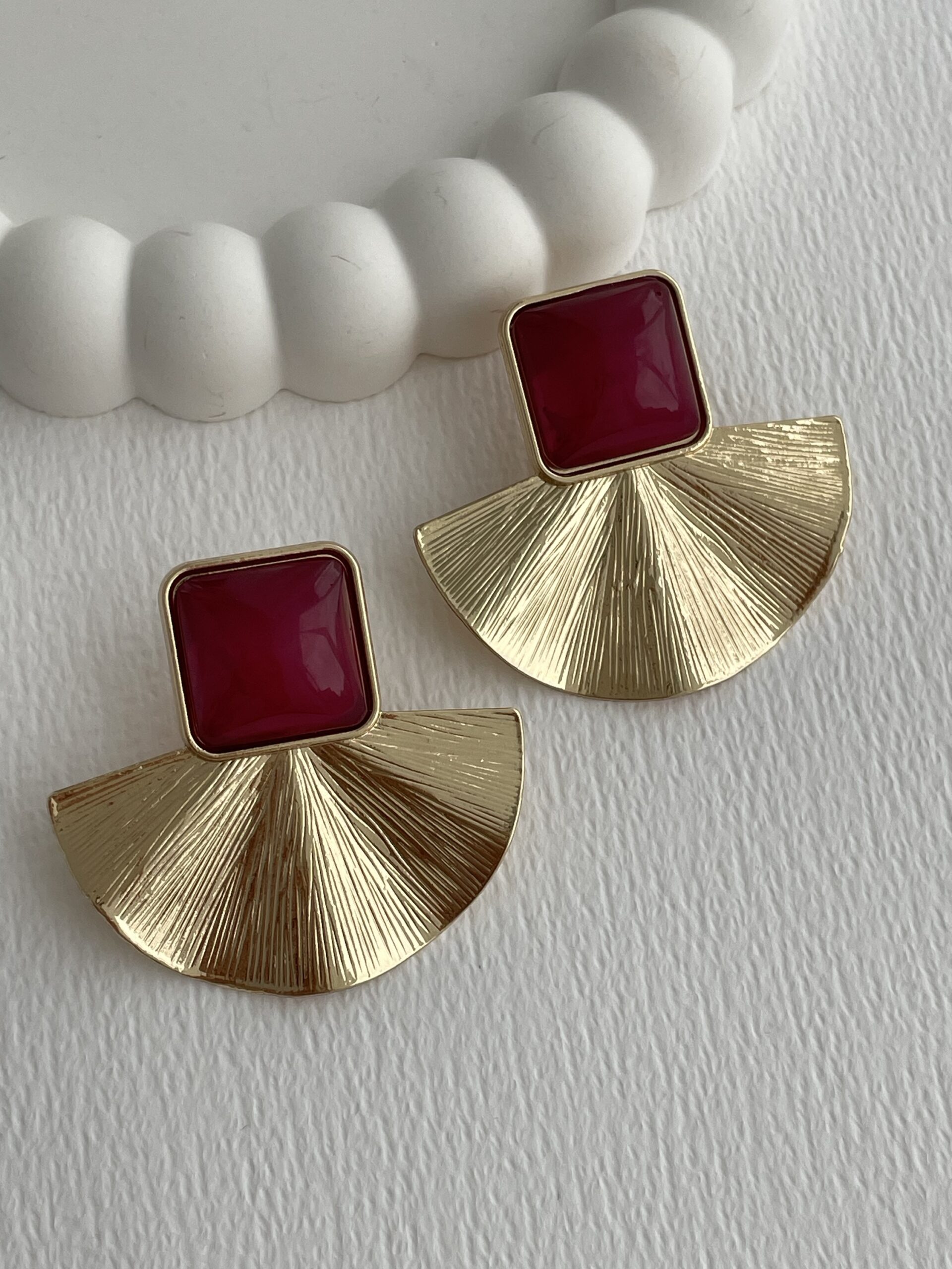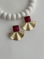Özel Seri Yelpaze Tasarım Bordo Mineli Gold Küpe