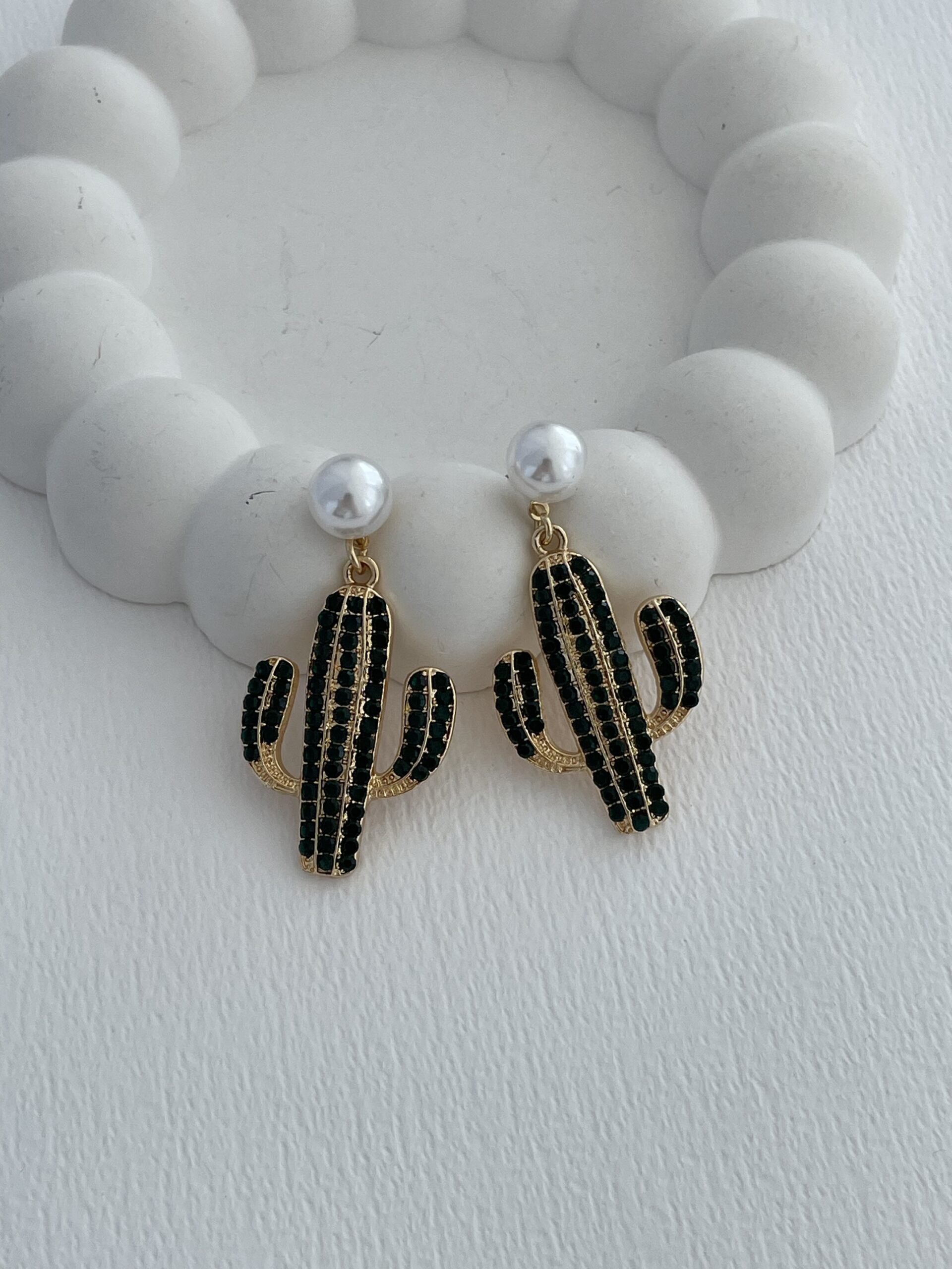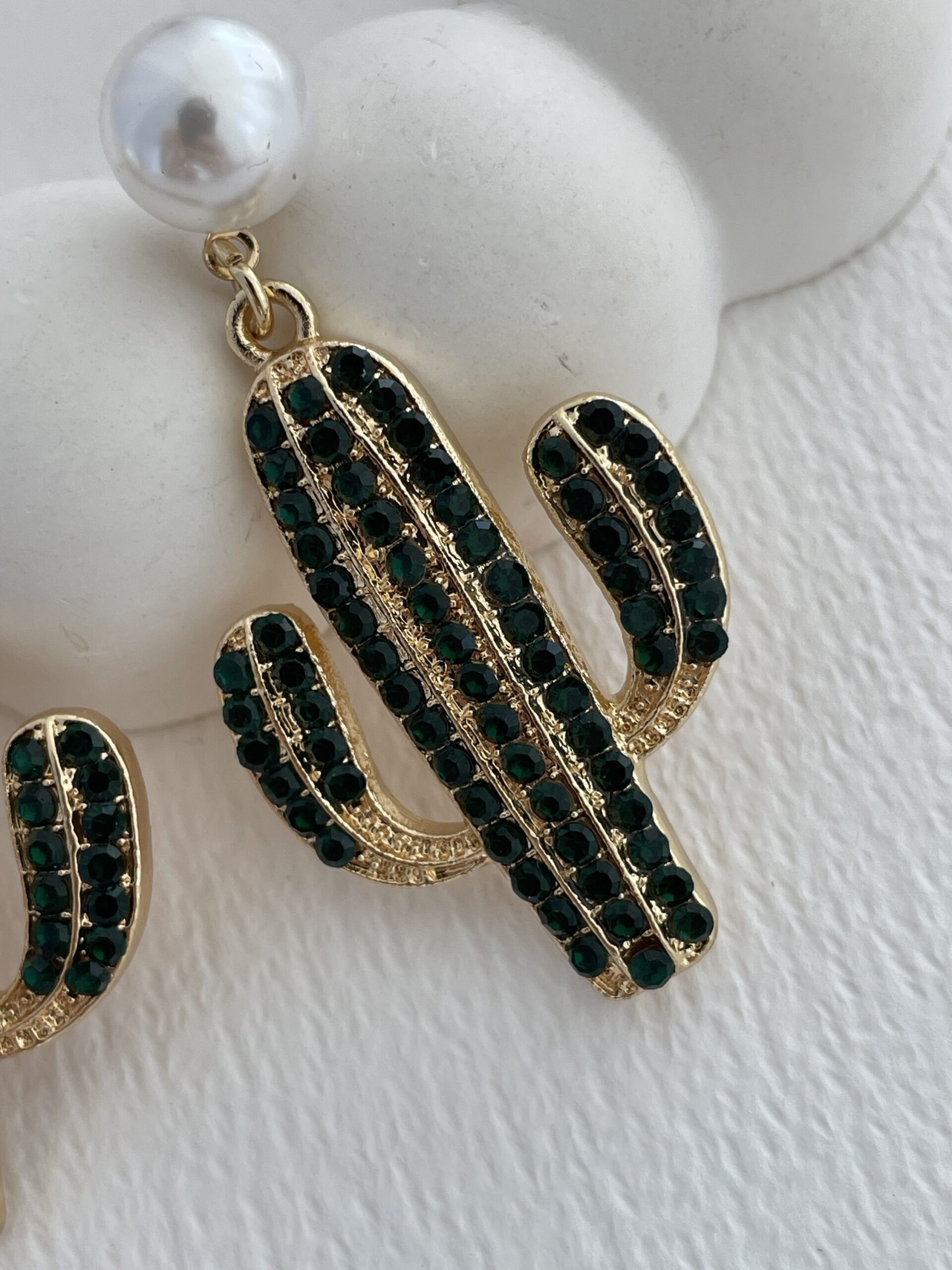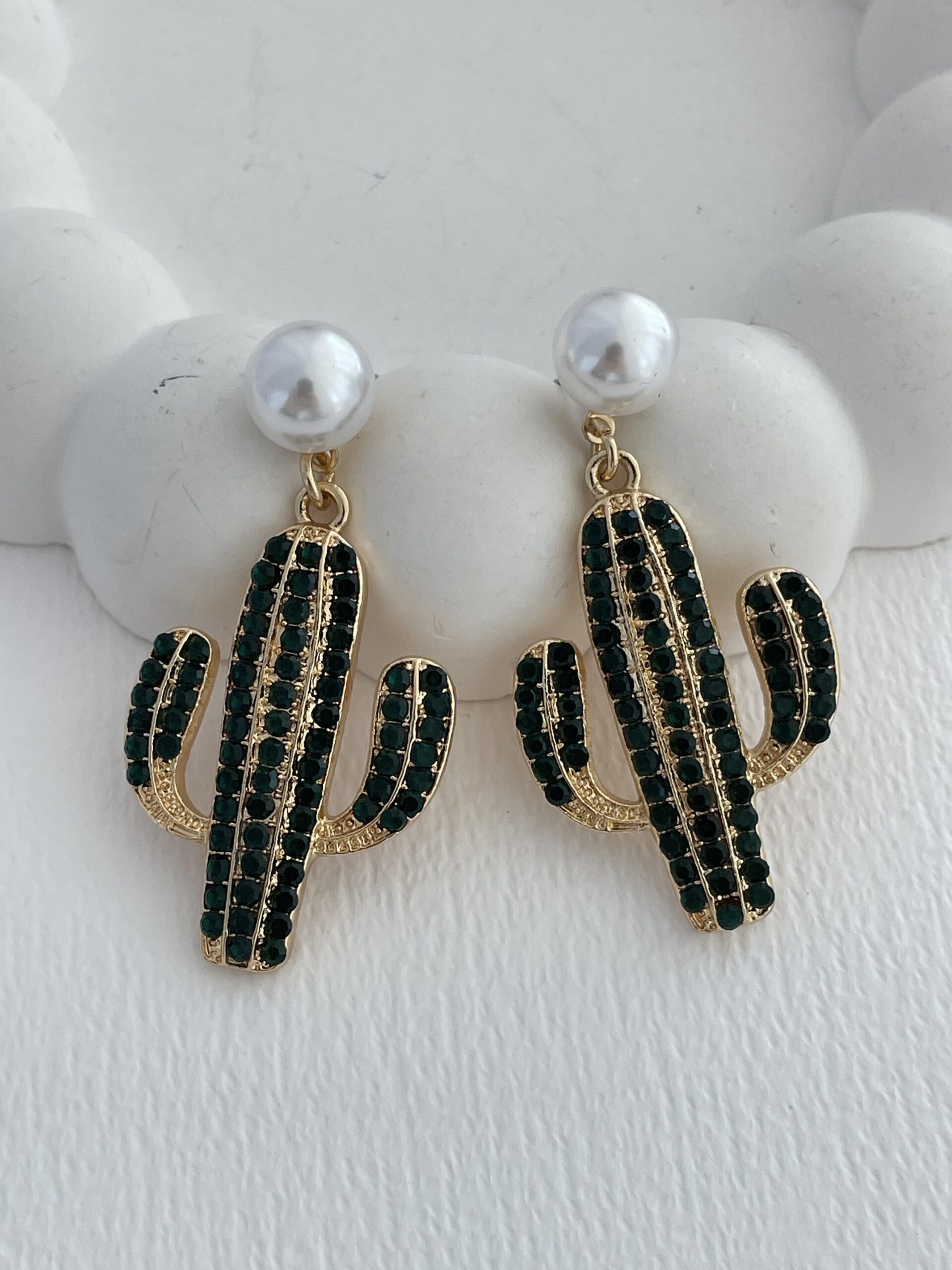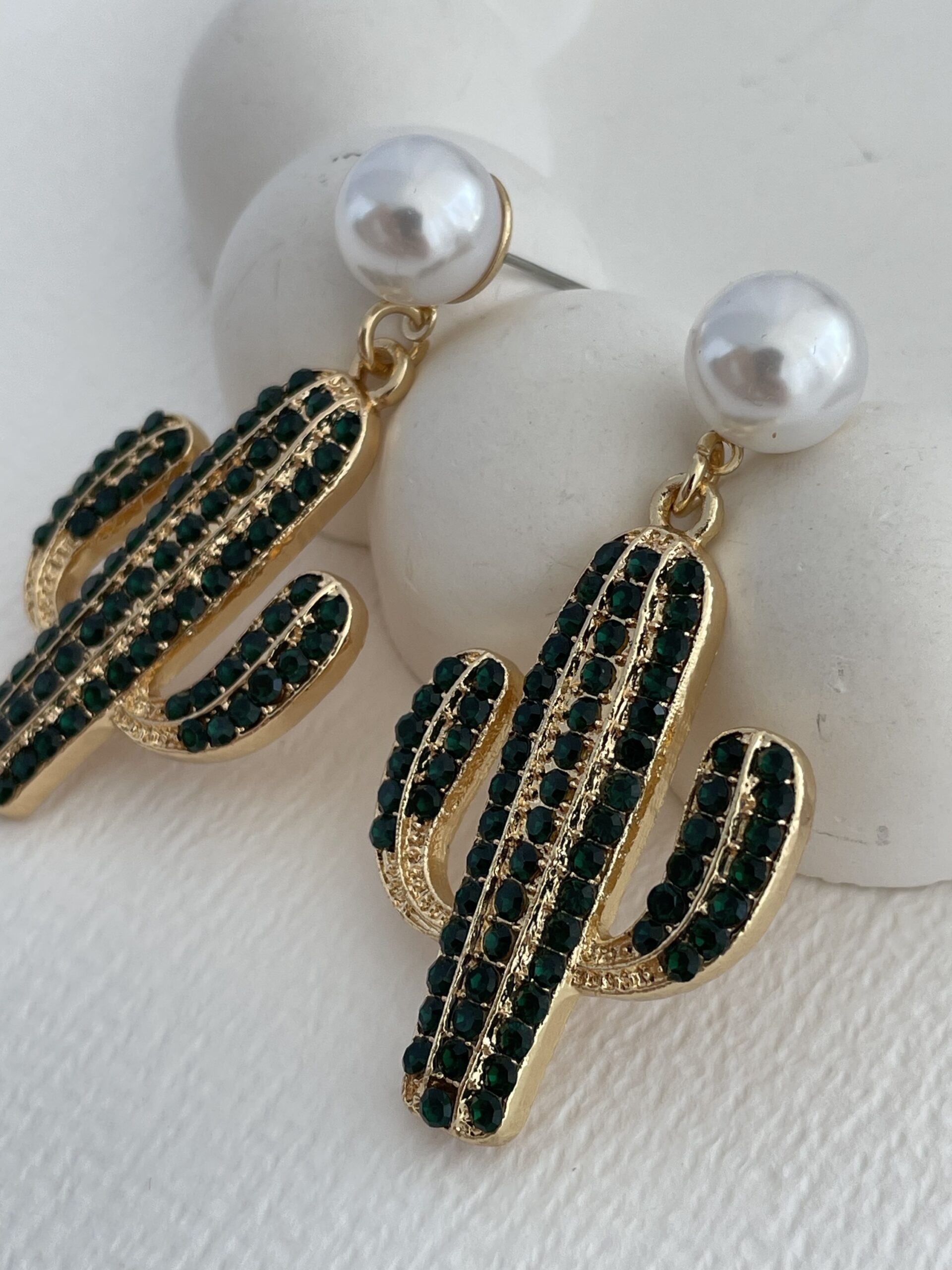 Özel Seri Yeşil Taşlı Kaktüs Tasarım Gold İncili Küpe