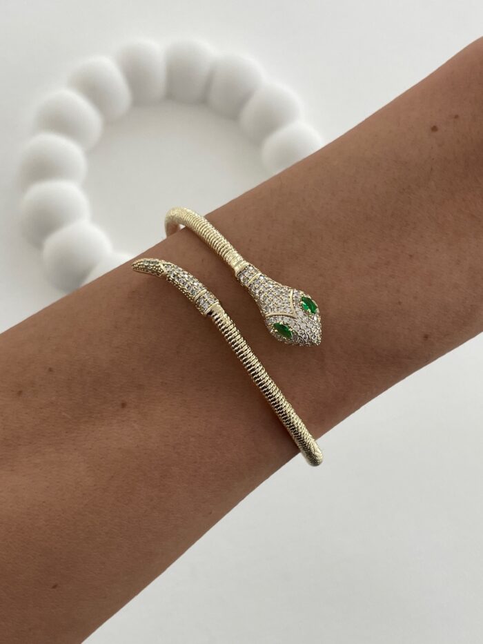 Özel Seri Yeşil Zirkon Taşlı Yılan Tasarım Gold Bileklik