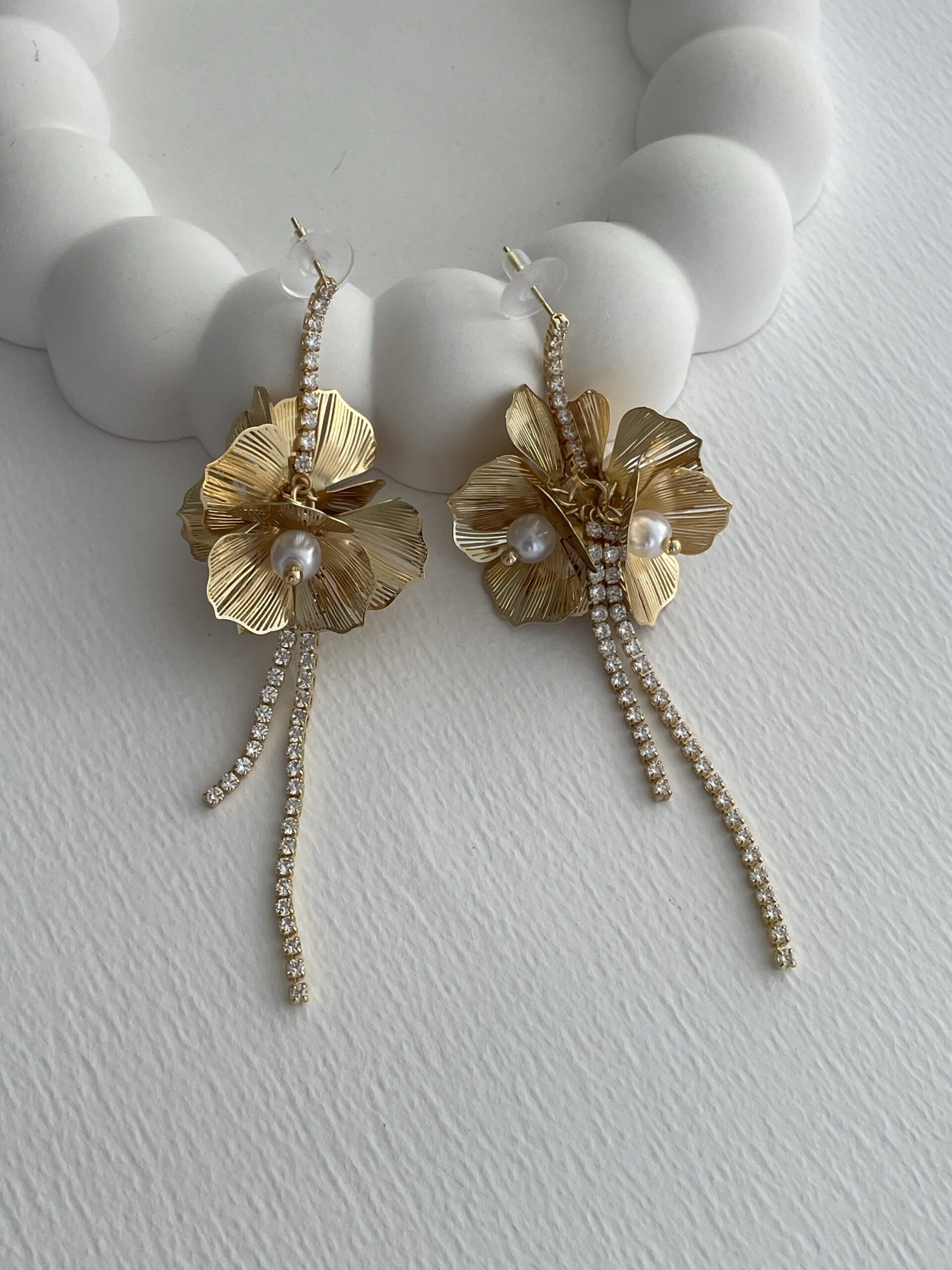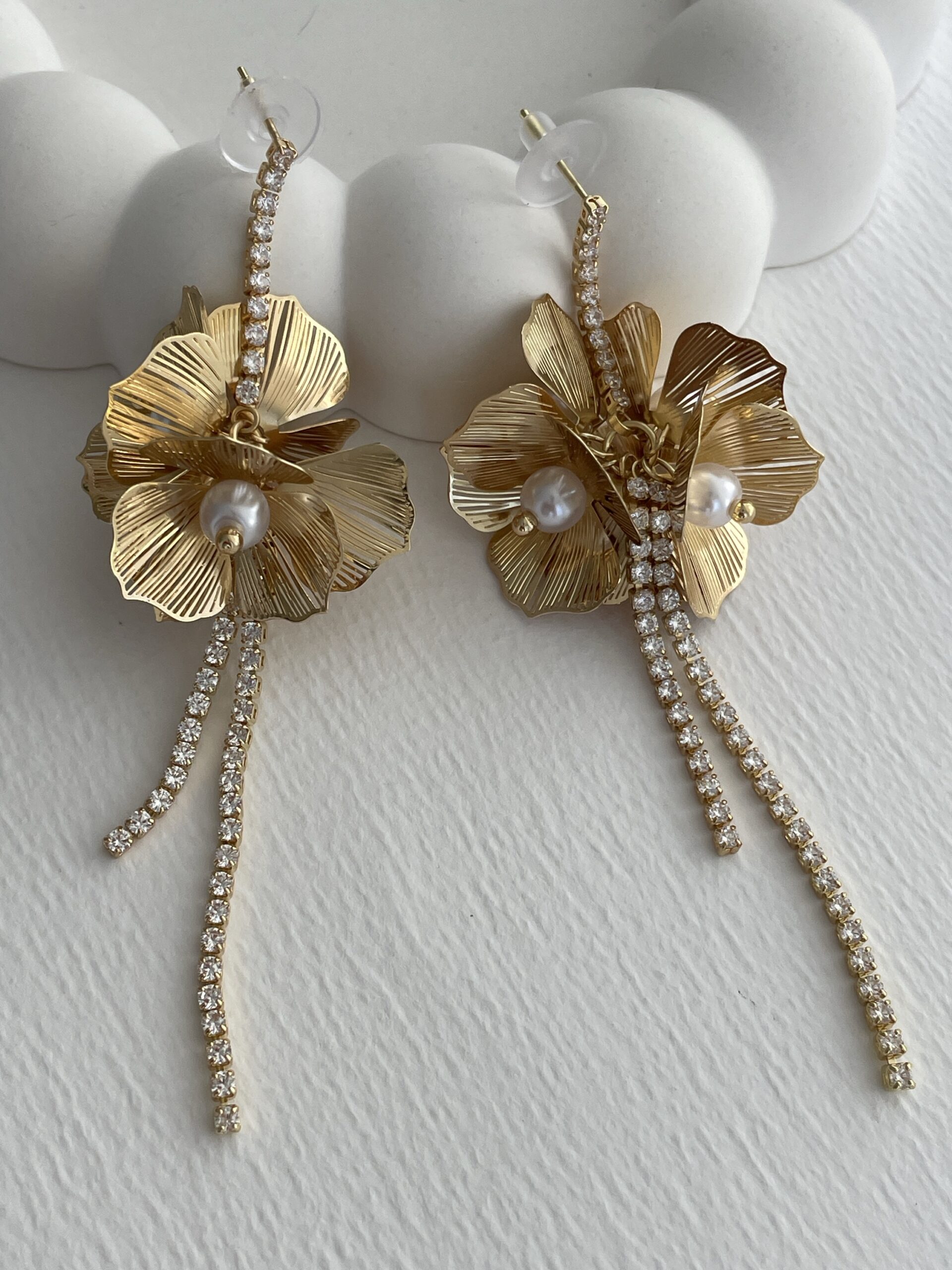Özel Seri Zirkon Taşlı Çiçek Tasarım Gold Sallantılı Küpe