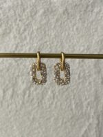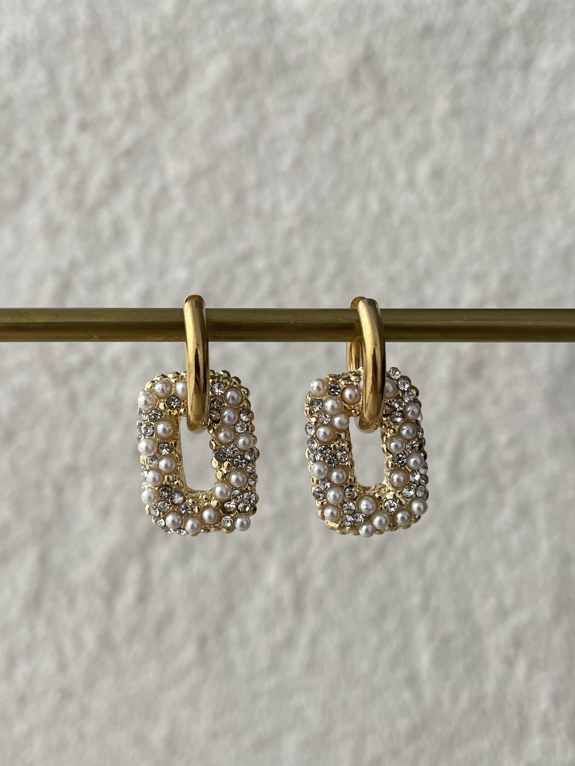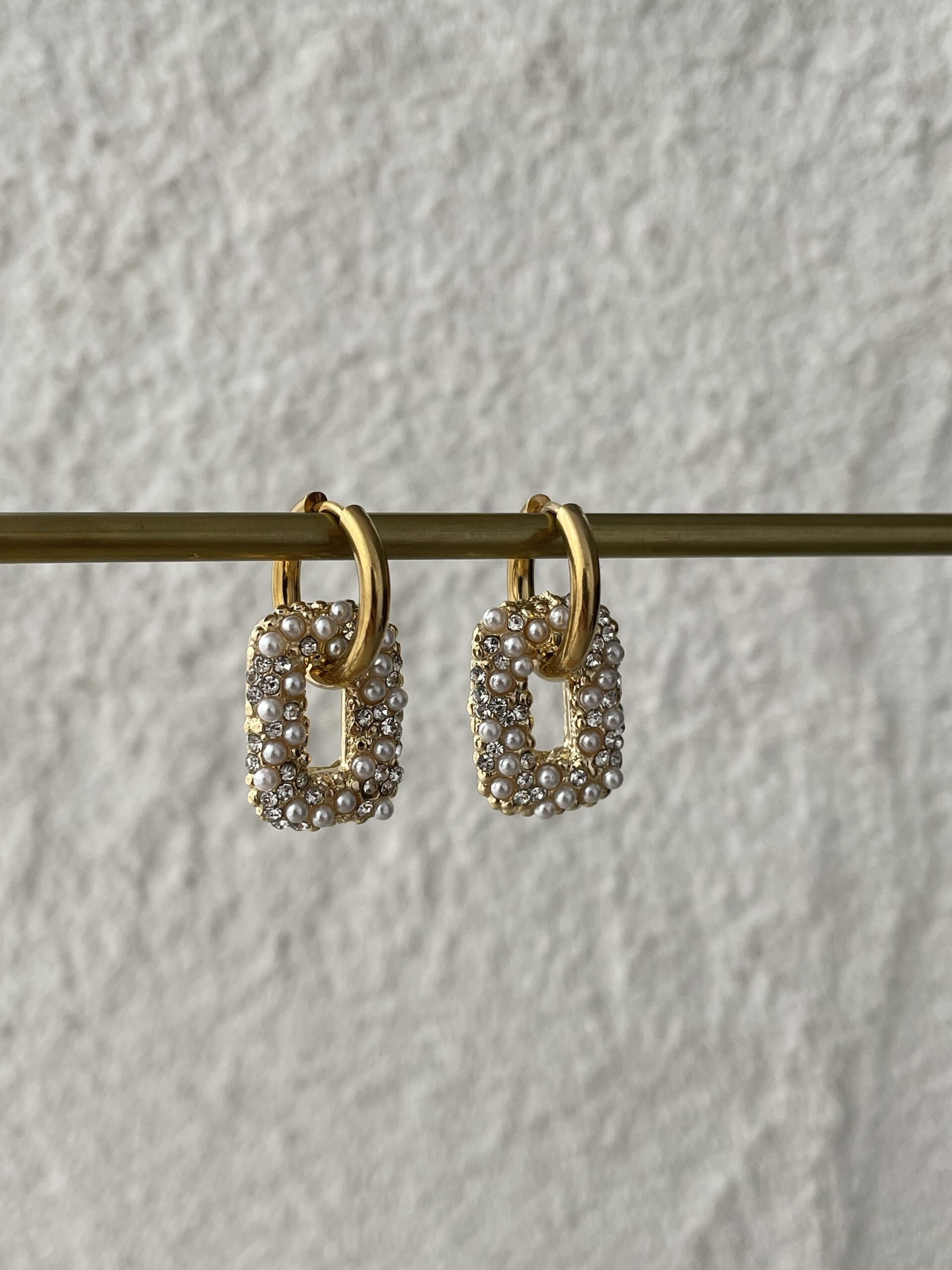 Özel Seri Zirkon Taşlı Dikdörtgen Tasarım Gold İnci Küpe