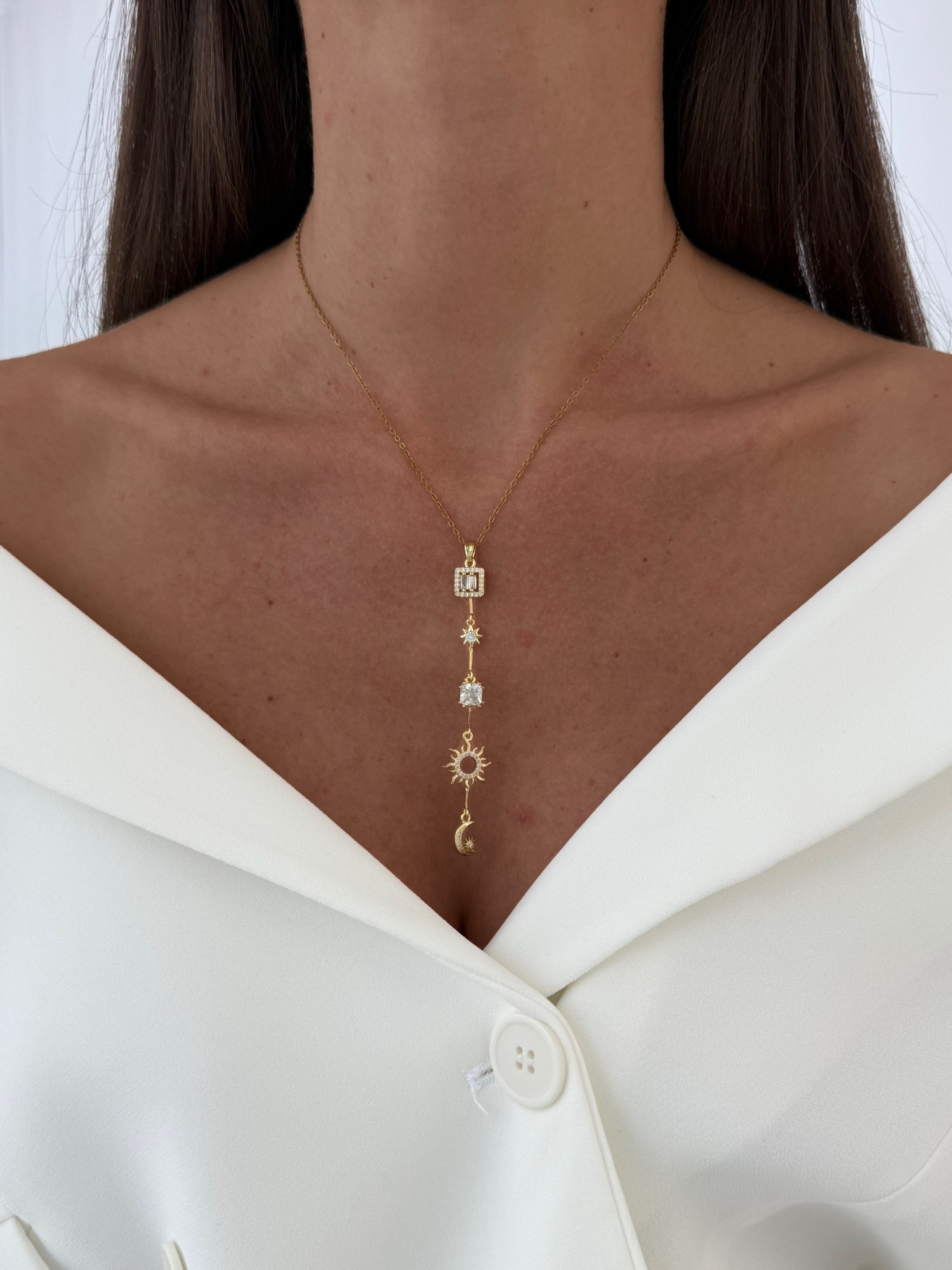 Özel Seri Zirkon Taşlı Güneş & Ay Tasarım Gold Y Kolye