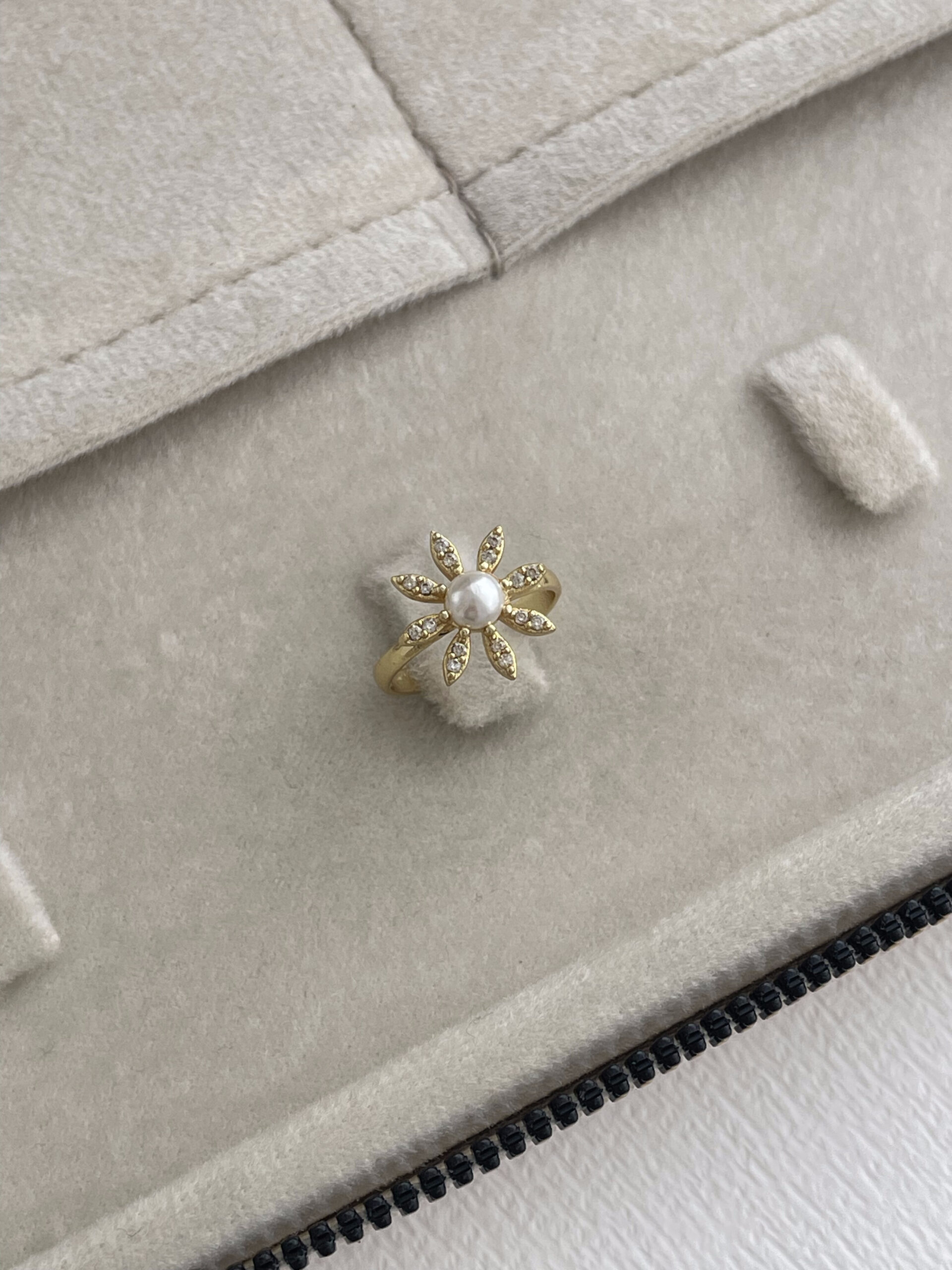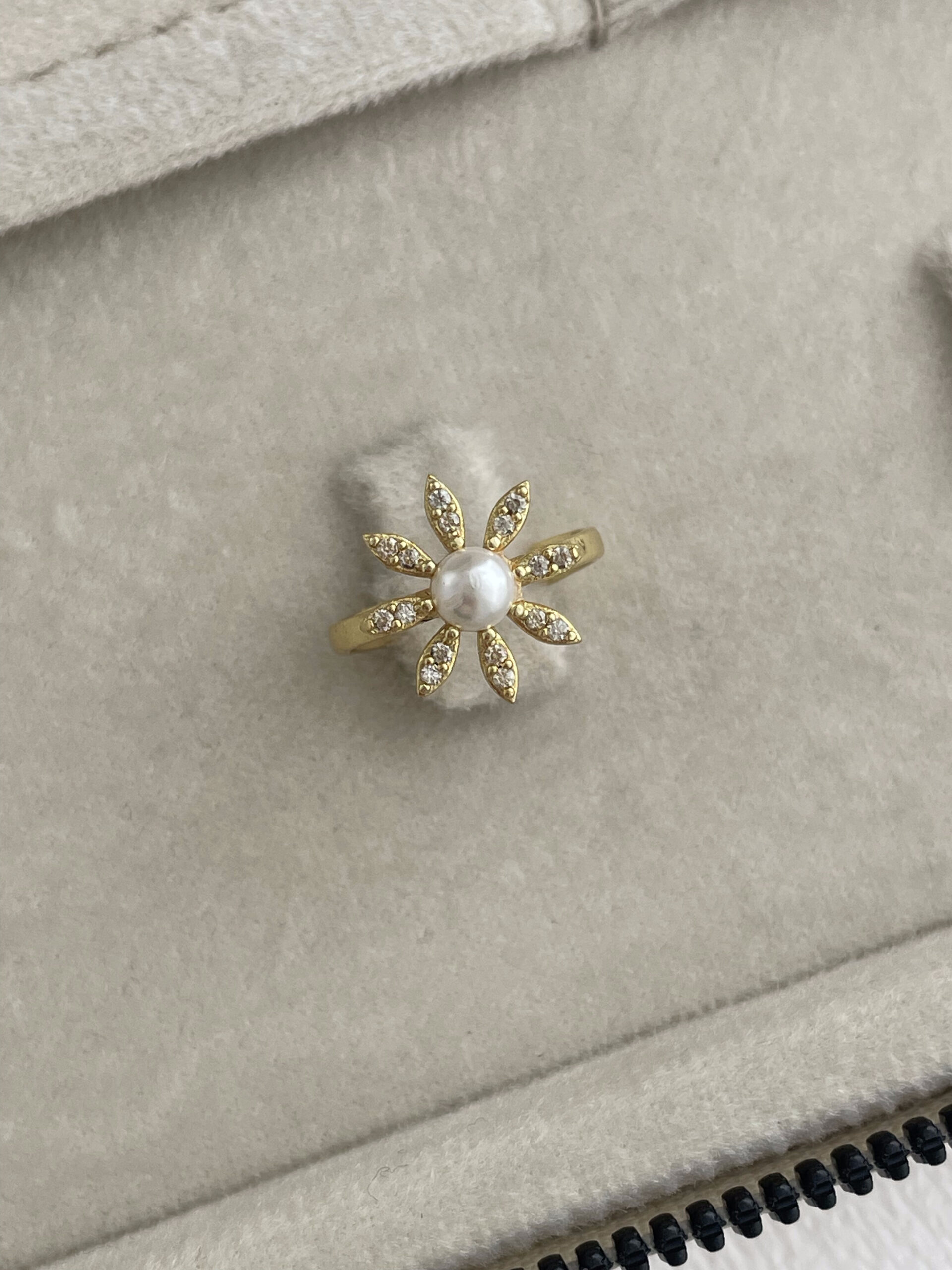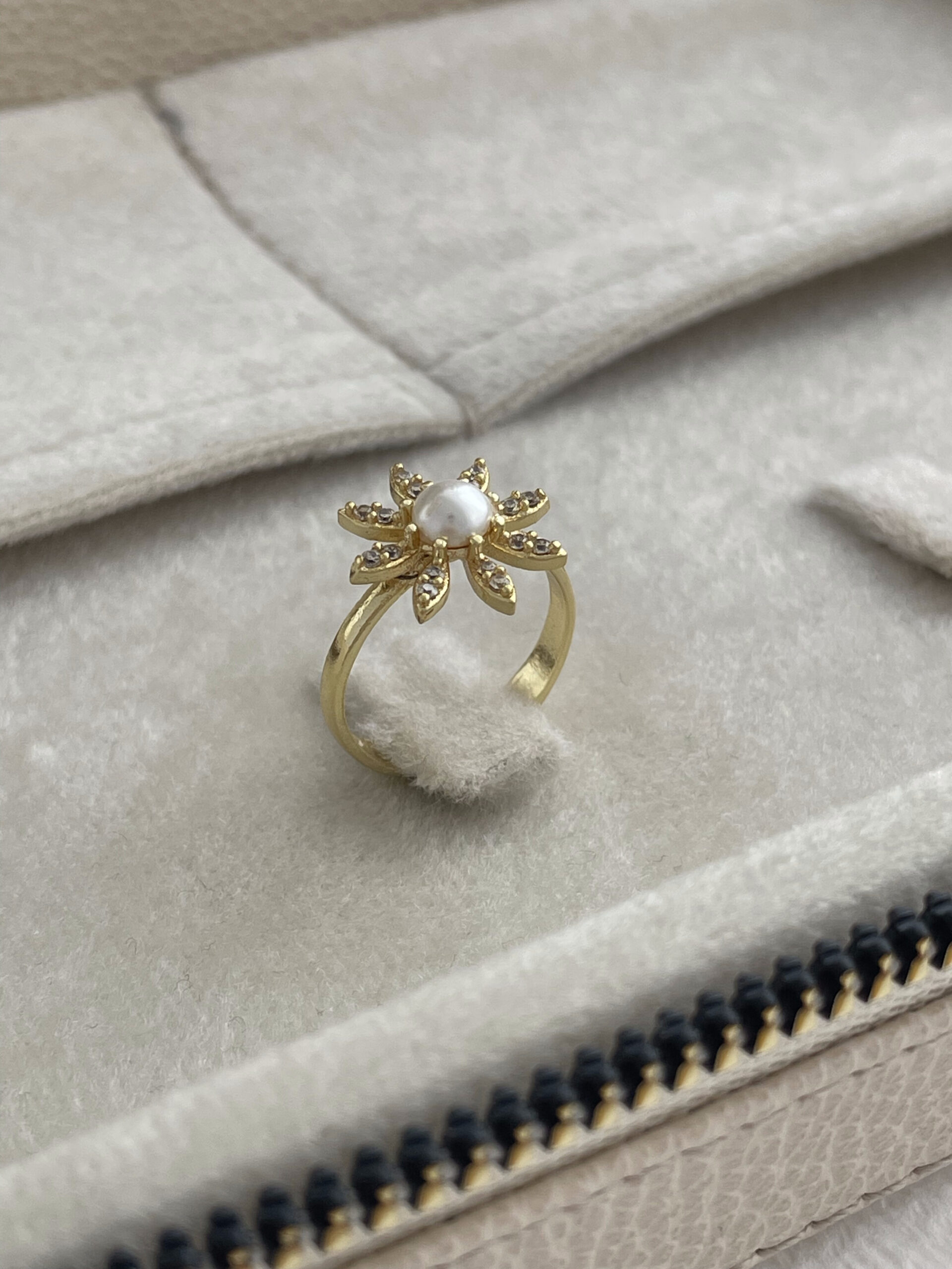 Özel Seri Zirkon Taşlı İnci Detay Çiçek Tasarım Ayarlanabilir Gold Yüzük