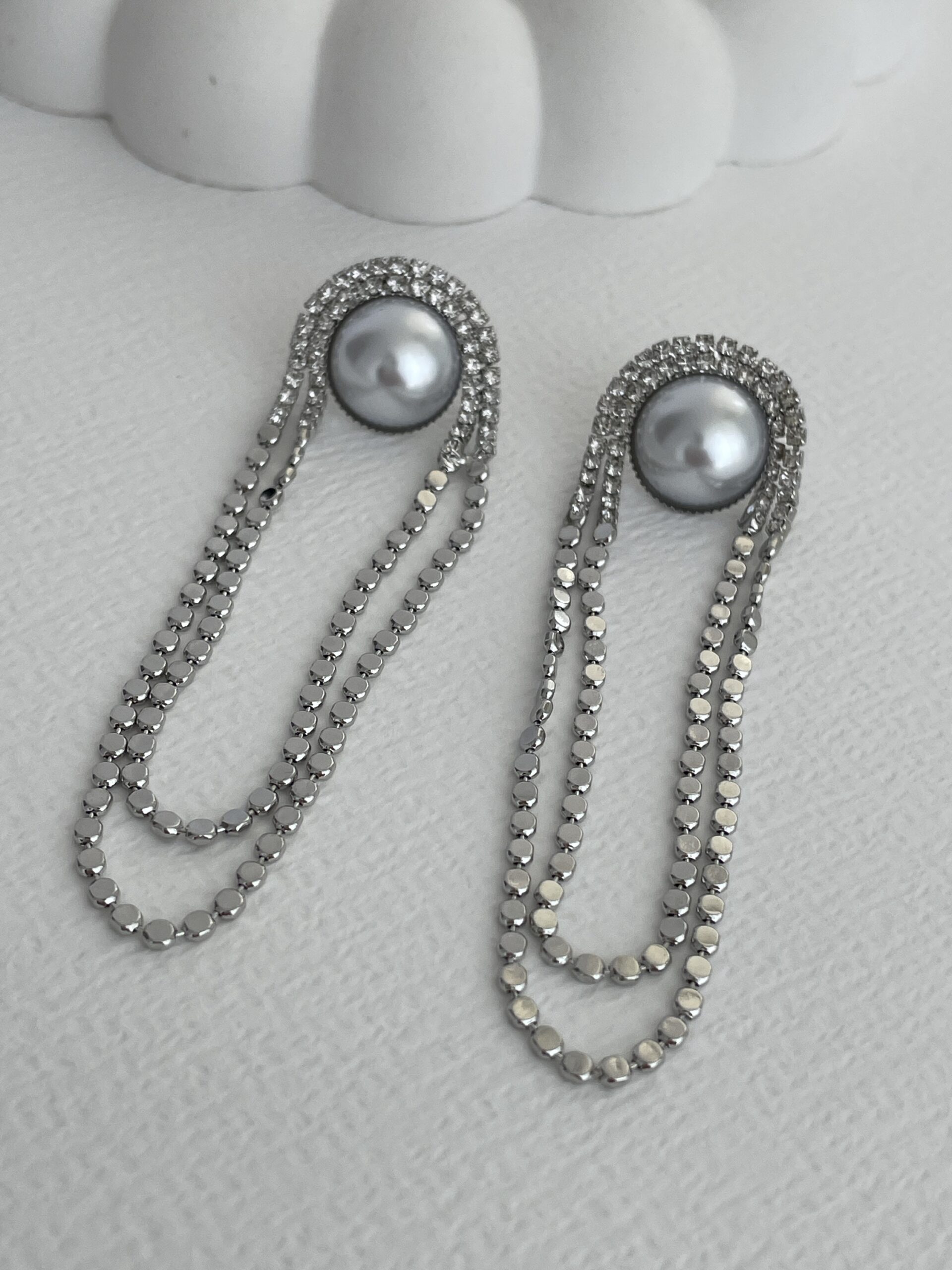 Özel Seri Zirkon Taşlı İncili Gümüş Ezme Zincir Küpe