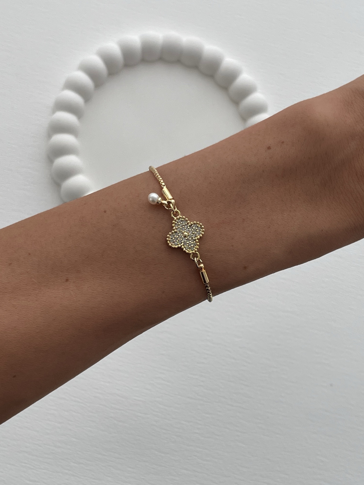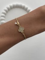 Özel Seri Zirkon Taşlı İncili Yonca Tasarım Gold Bileklik