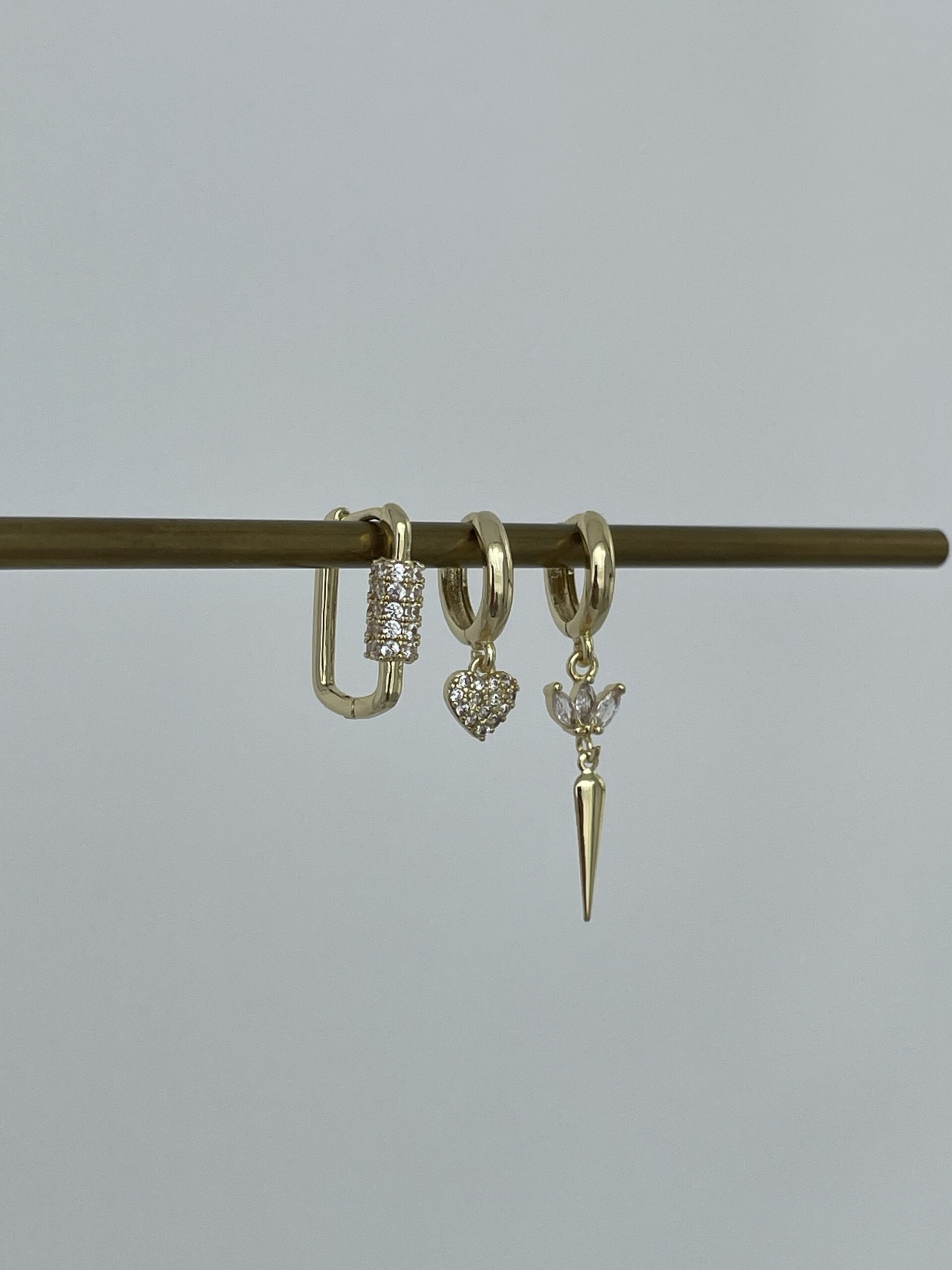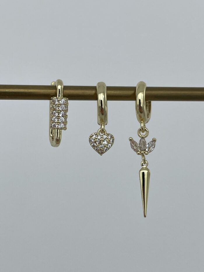 Özel Seri Zirkon Taşlı Kalp & Yaprak Tasarım Gold Üçlü Küpe Set