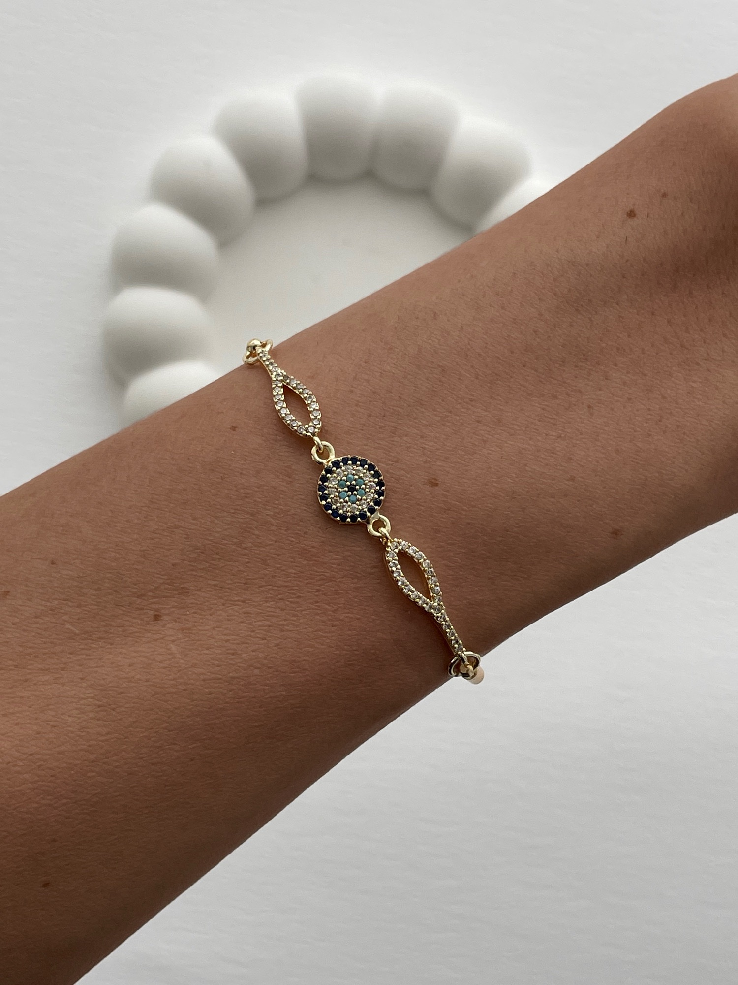 Özel Seri Zirkon Taşlı Oval Nazar Boncuk Gold Asansörlü Bileklik