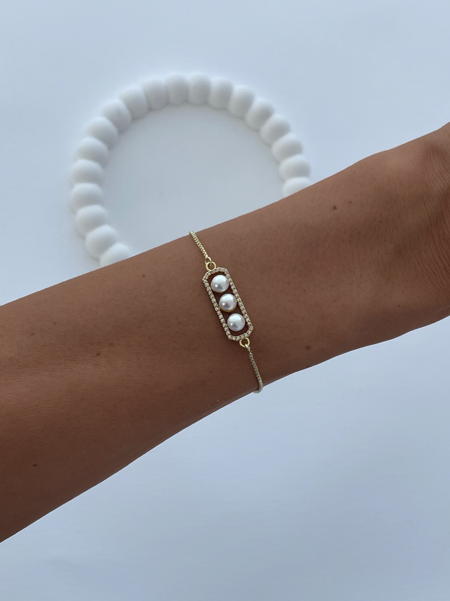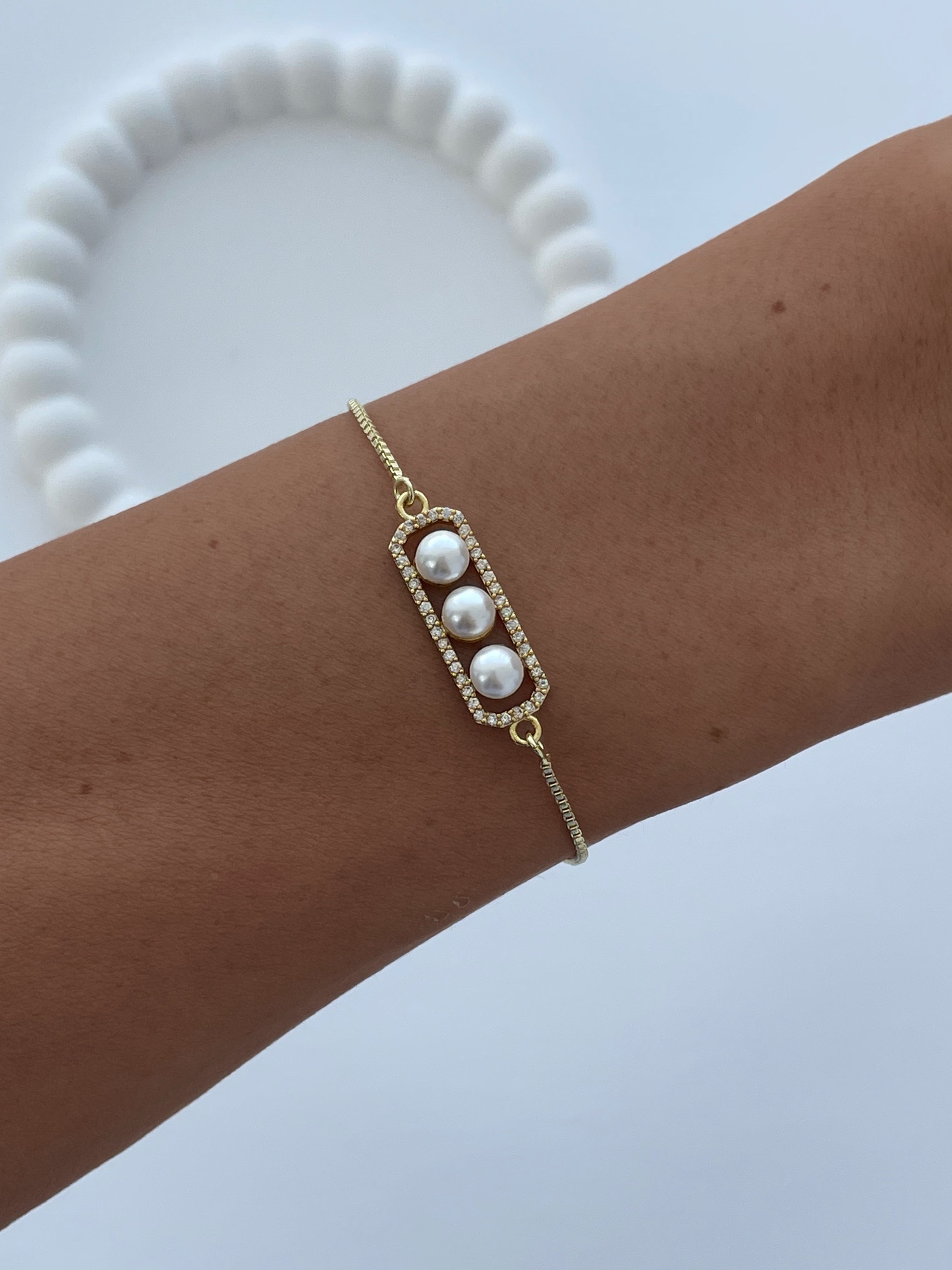 Özel Seri Zirkon Taşlı Üçlü İnci Tasarım Gold Asansörlü Bileklik