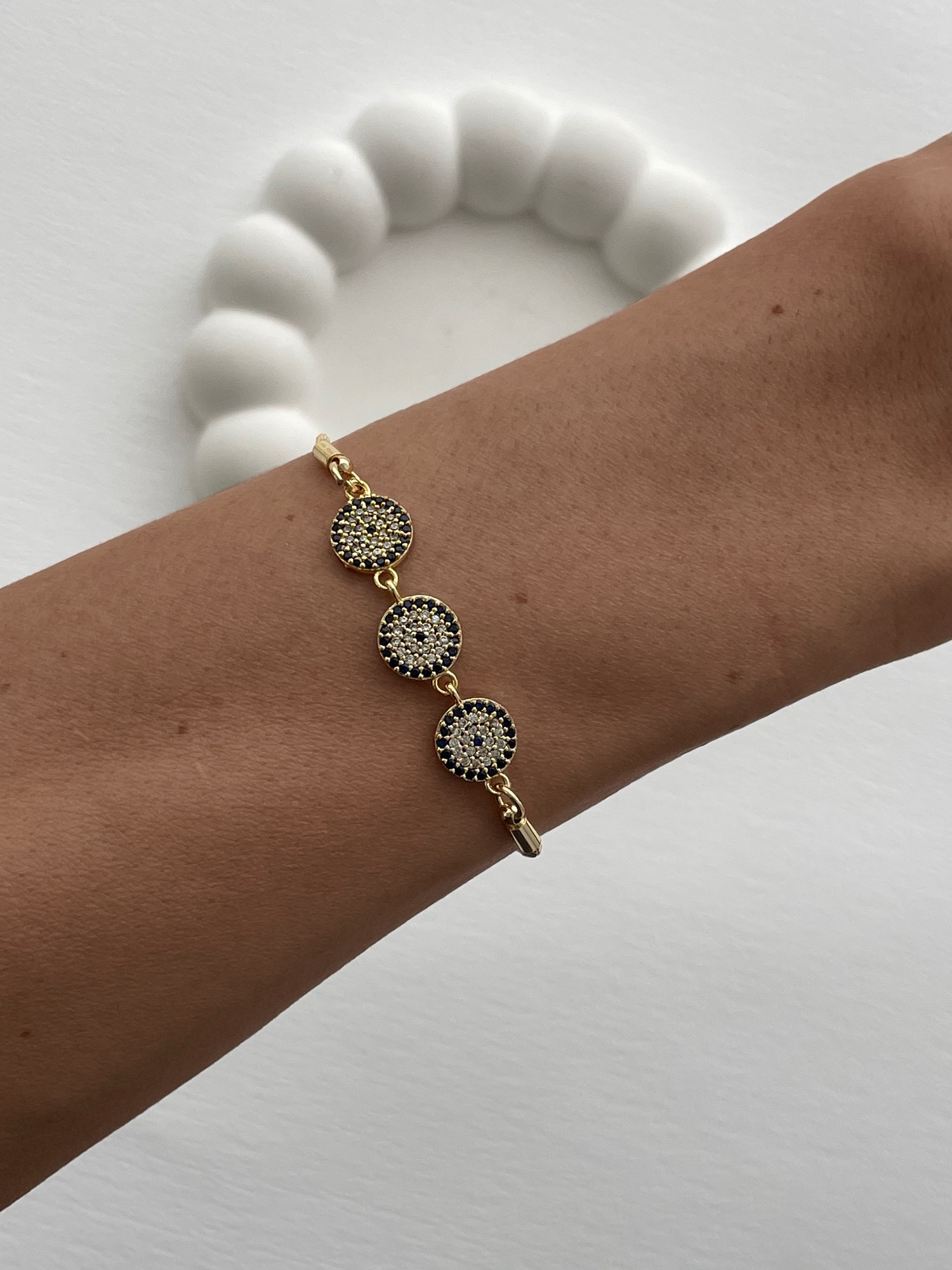 Özel Seri Zirkon Taşlı Üçlü Nazar Boncuk Gold Asansörlü Bileklik