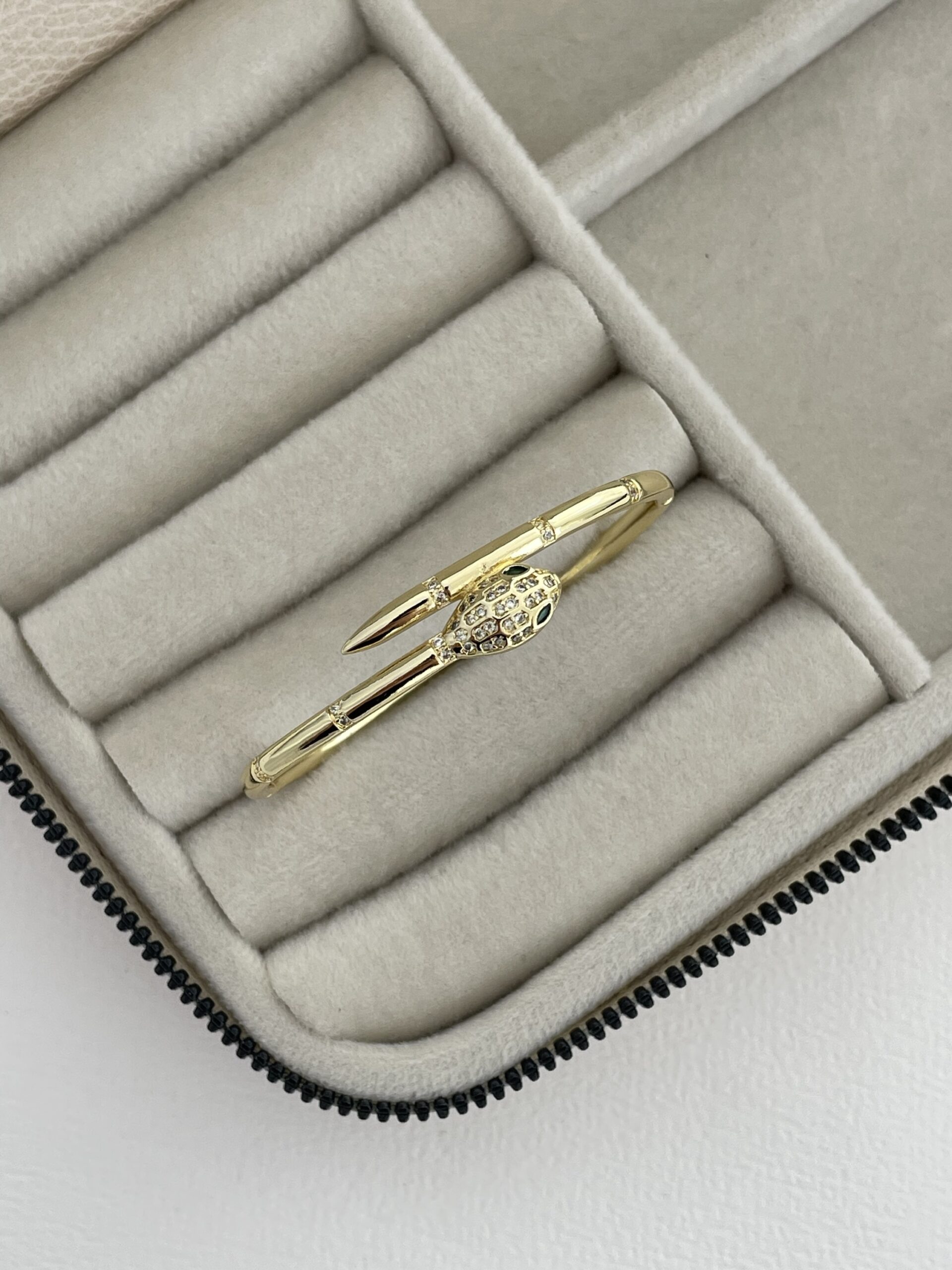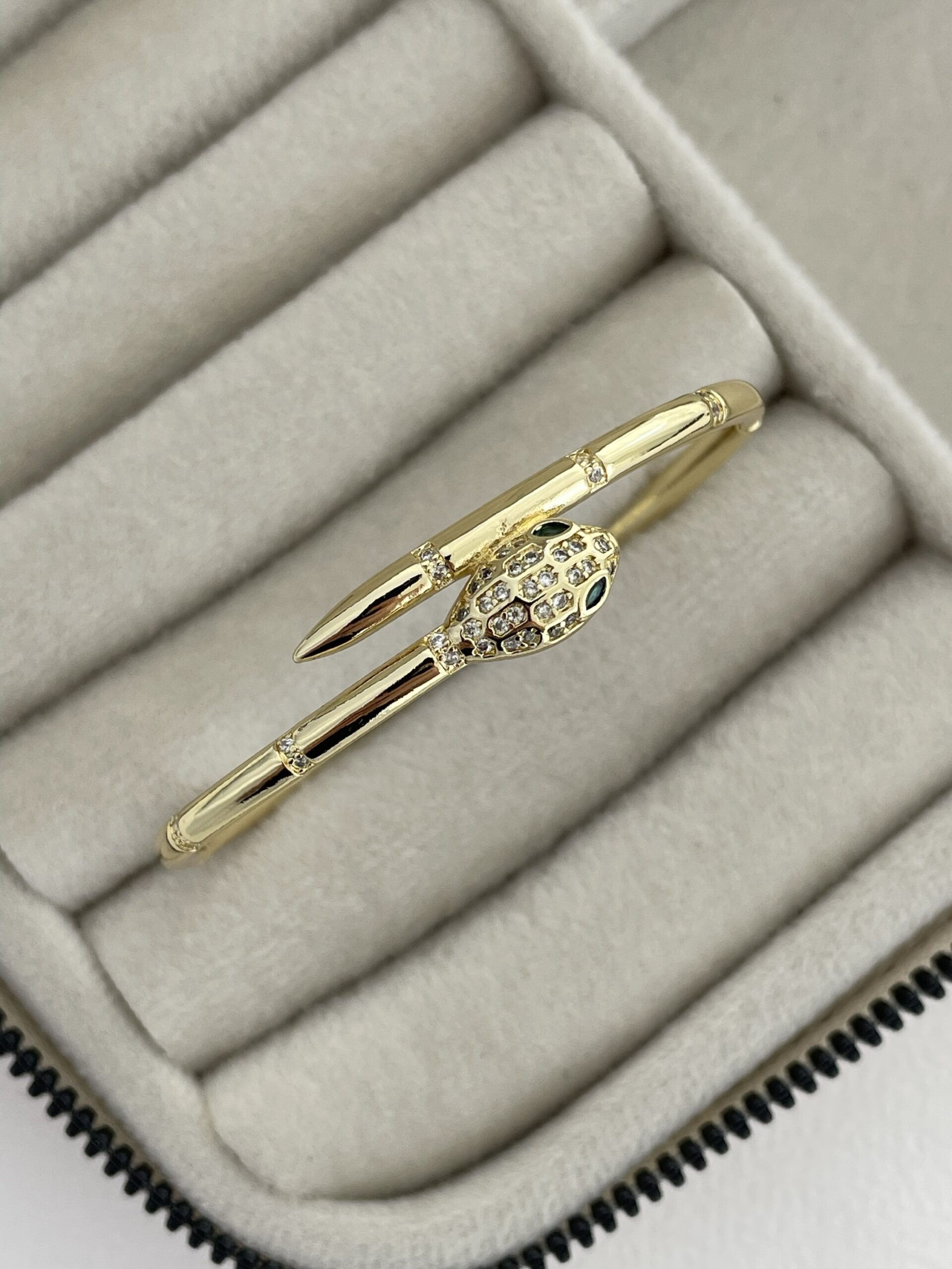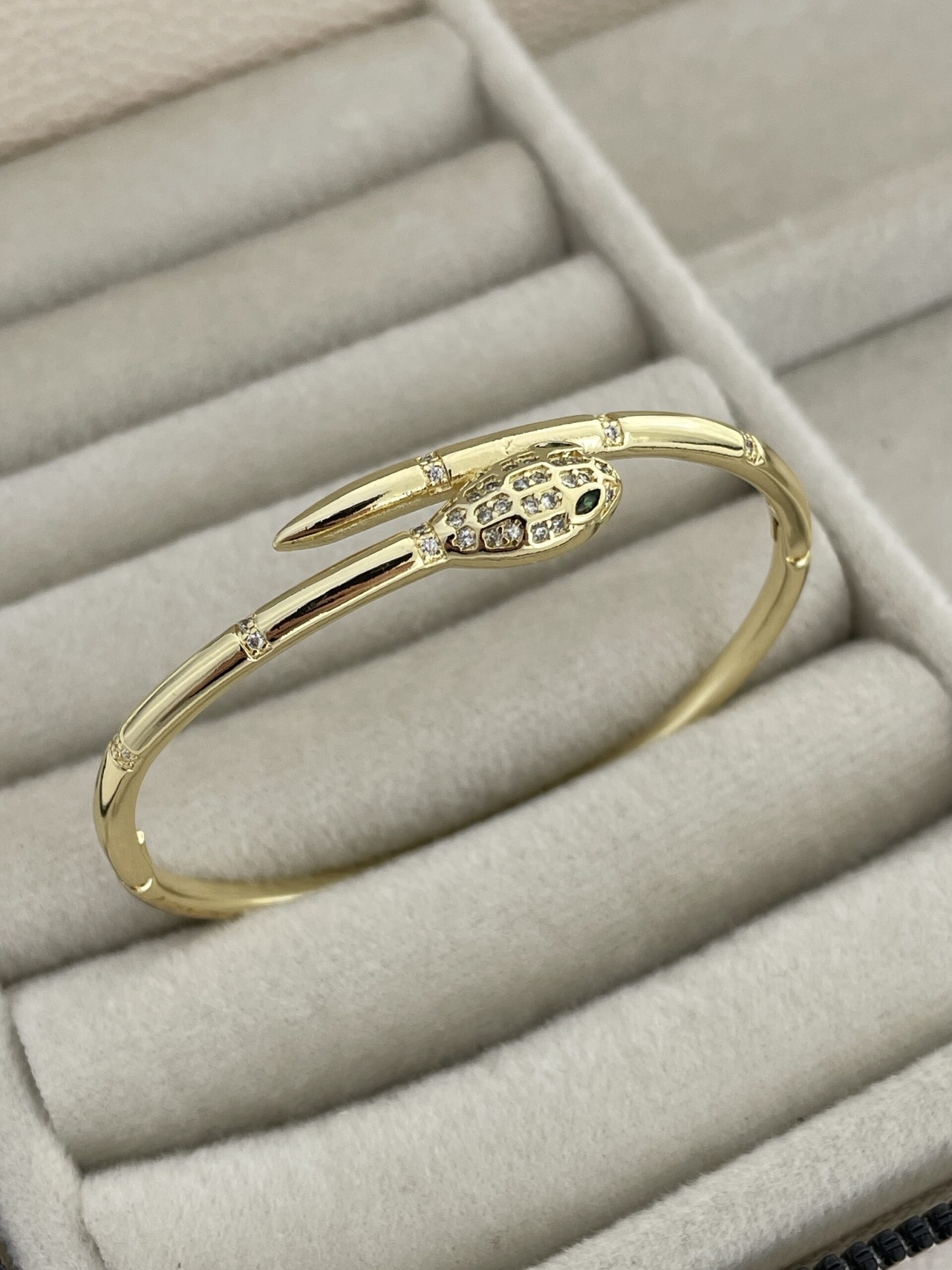 Özel Seri Yeşil Zirkon Taşlı Yılan Tasarım Gold Kelepçe Bileklik