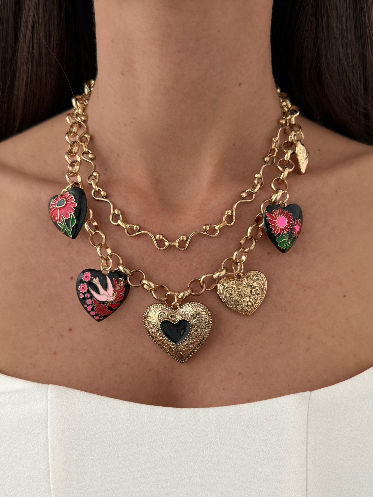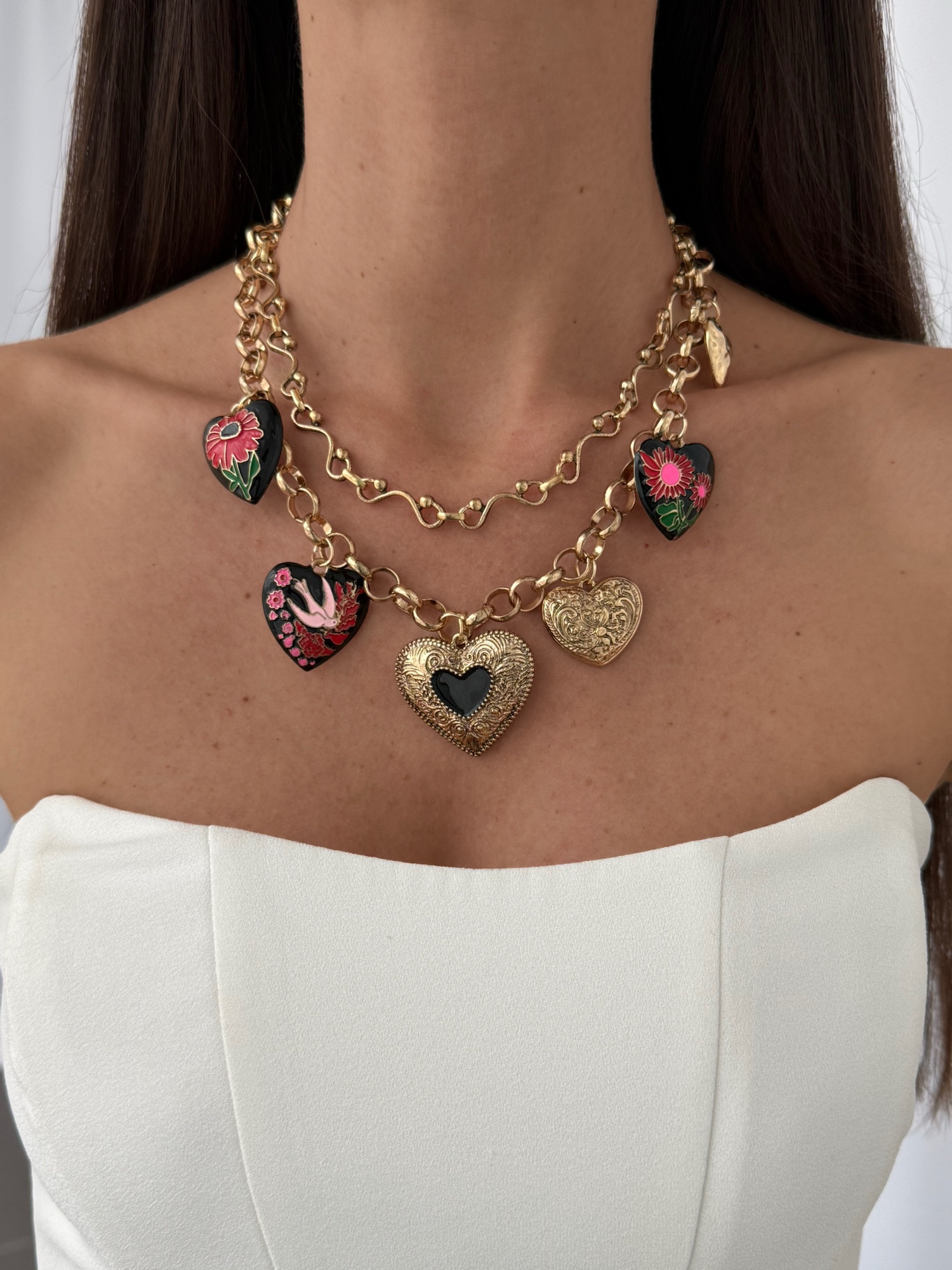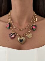 Özel Seri ZR Model Çoklu Kalp Charm Detay İkili Gold Kolye