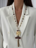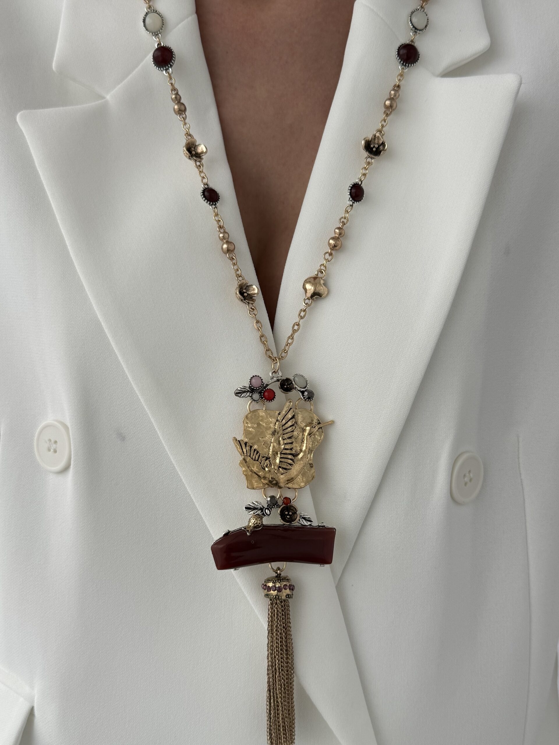 Özel Seri ZR Model Eskitme Renkli Taşlı Püskül Detay Kanat Tasarım Gold Kolye