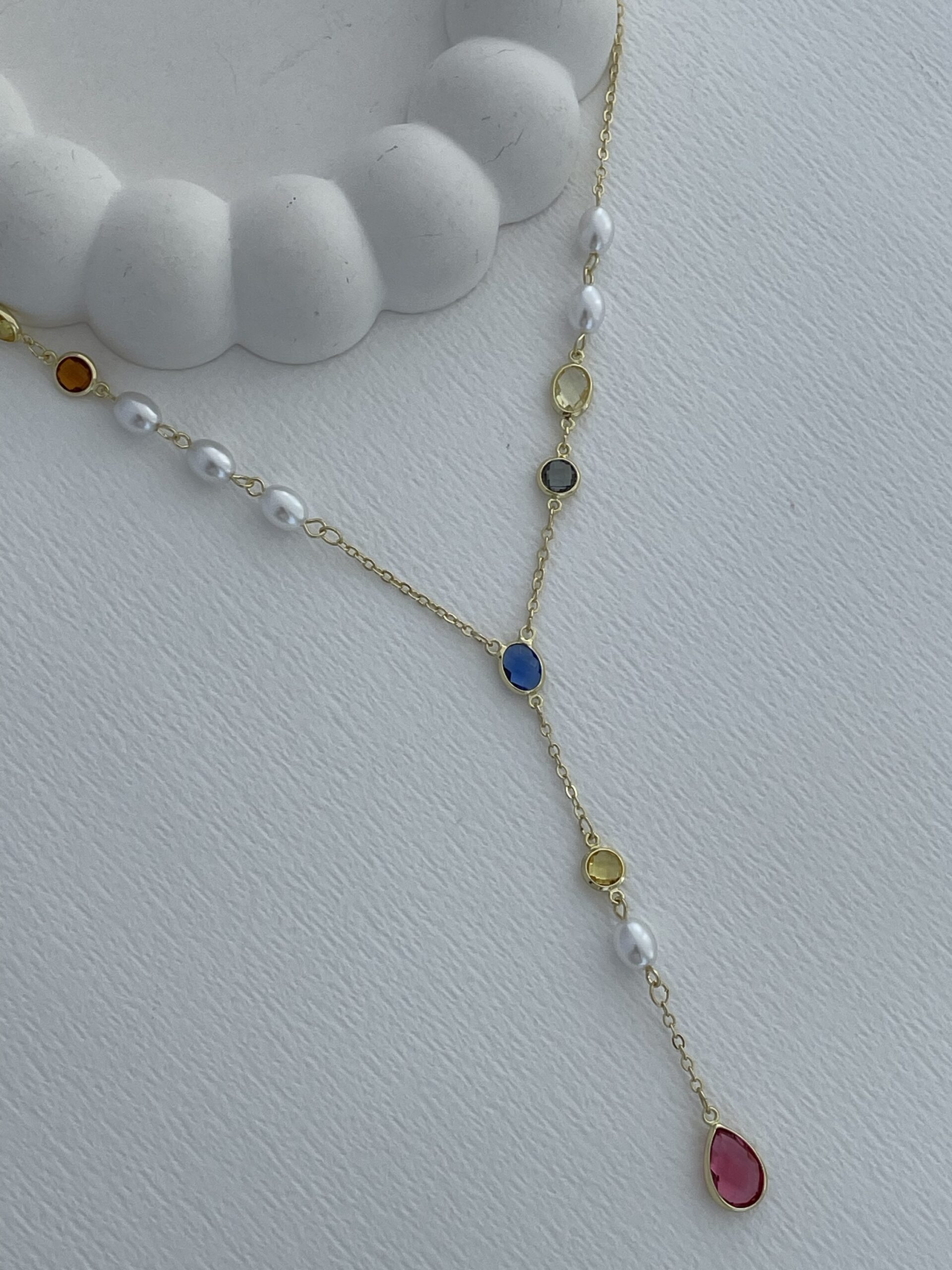 Özel Seri İnci Detay Renkli Taş Gold Y Kolye