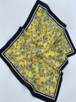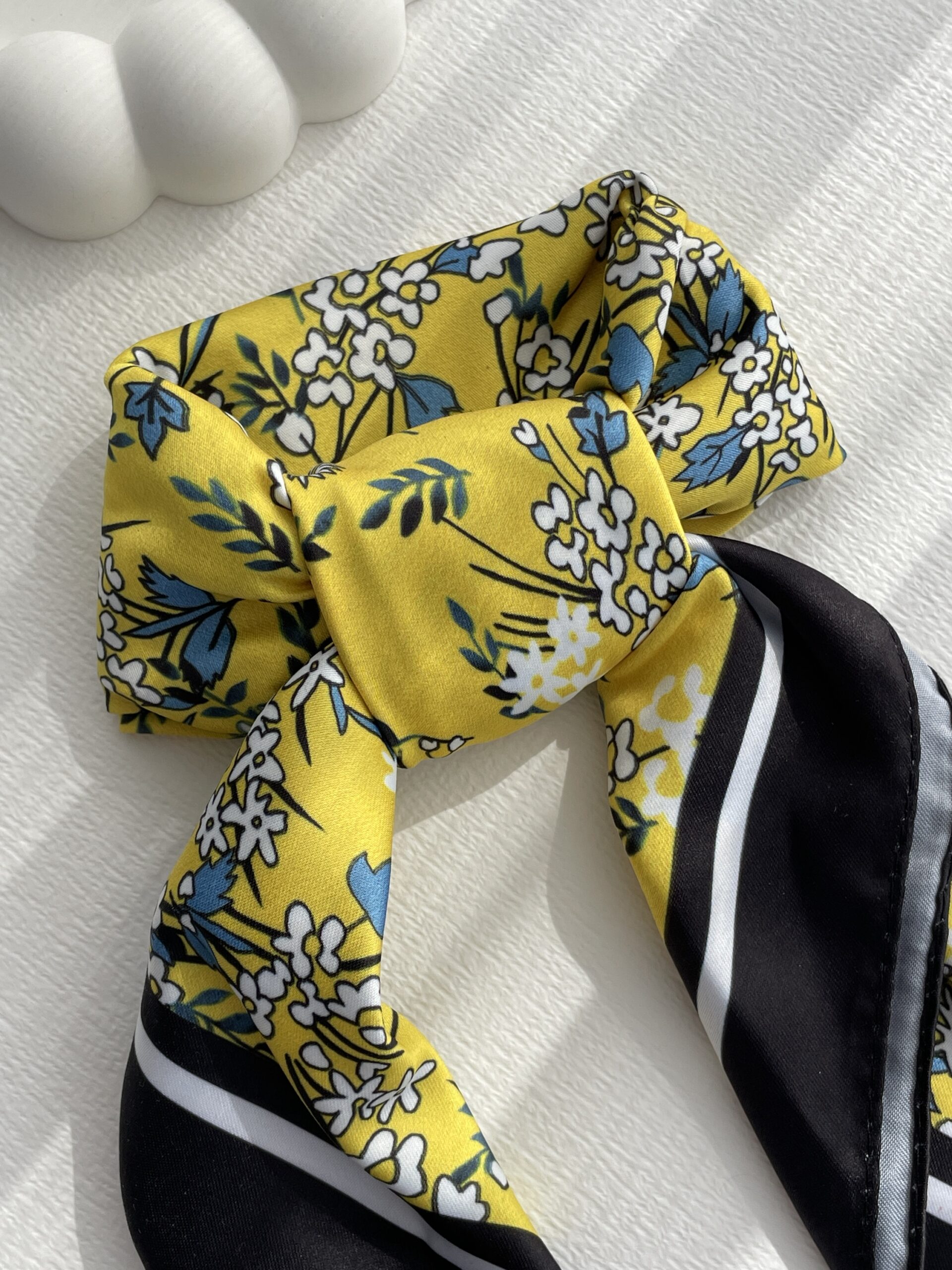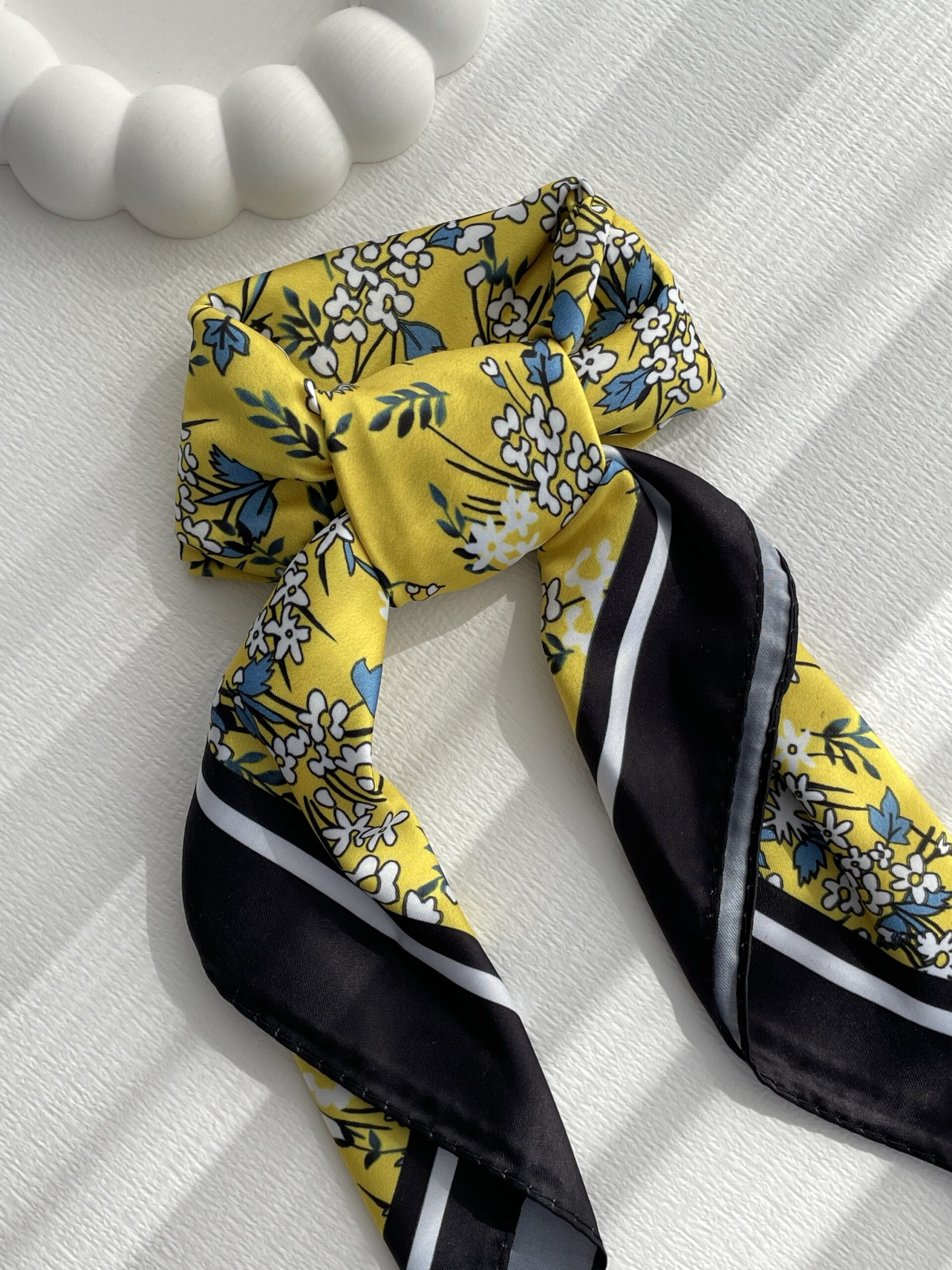 Siyah Beyaz Biyeli Sarı Çiçek Desen Saten Fular