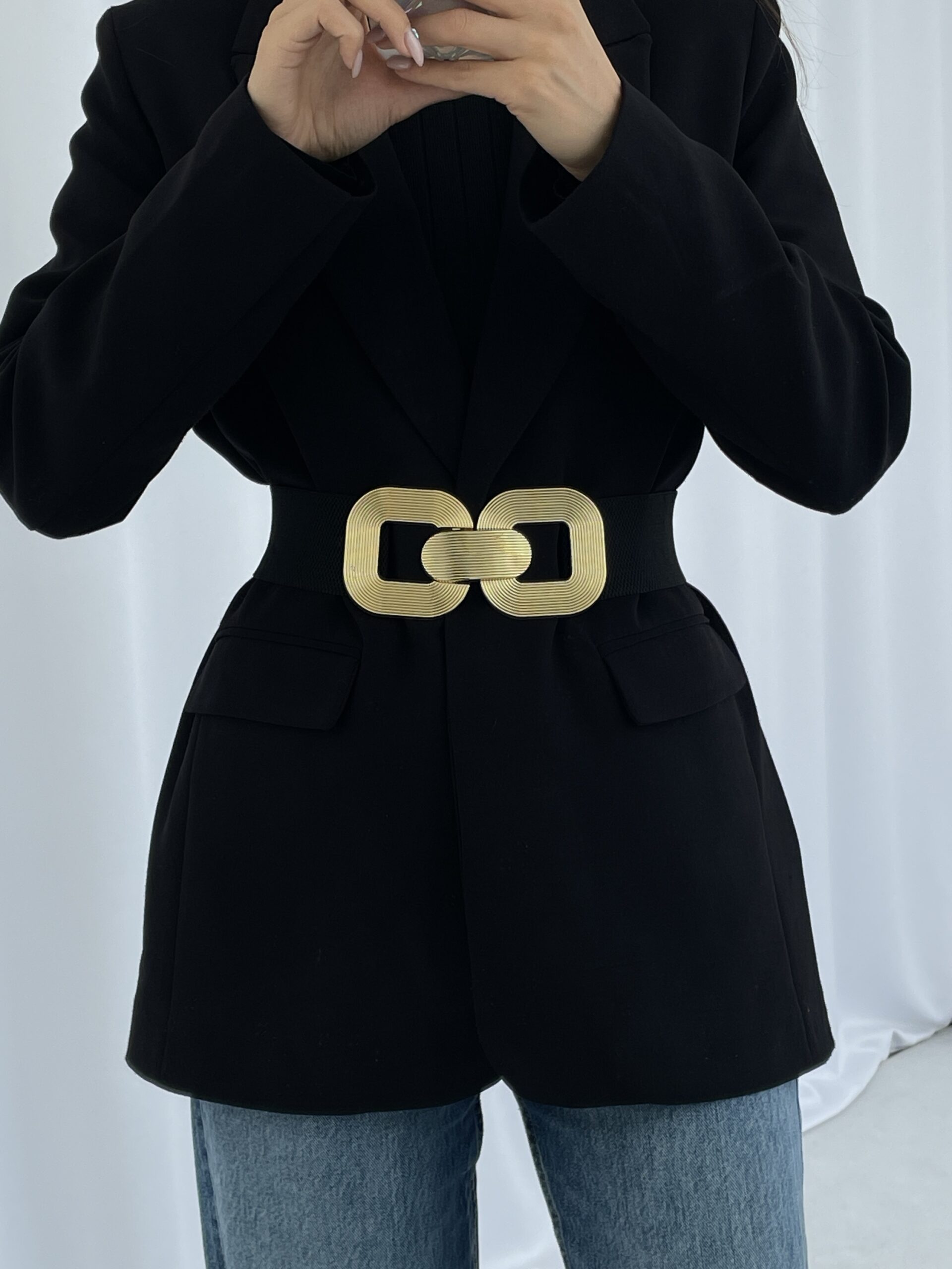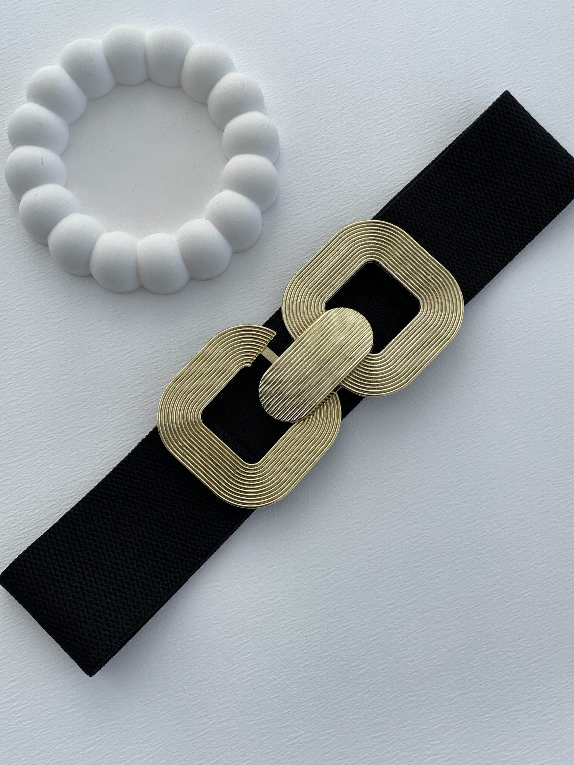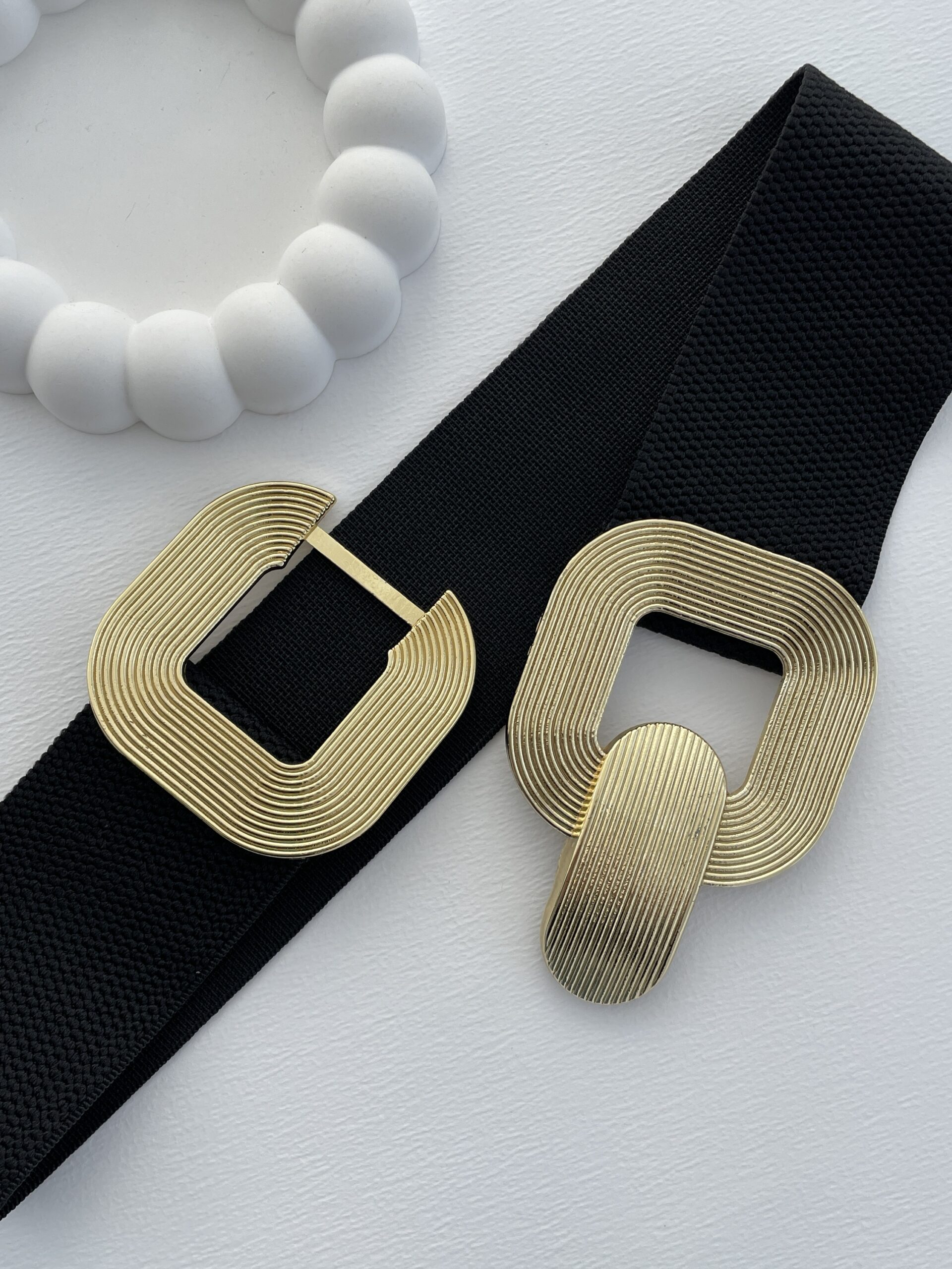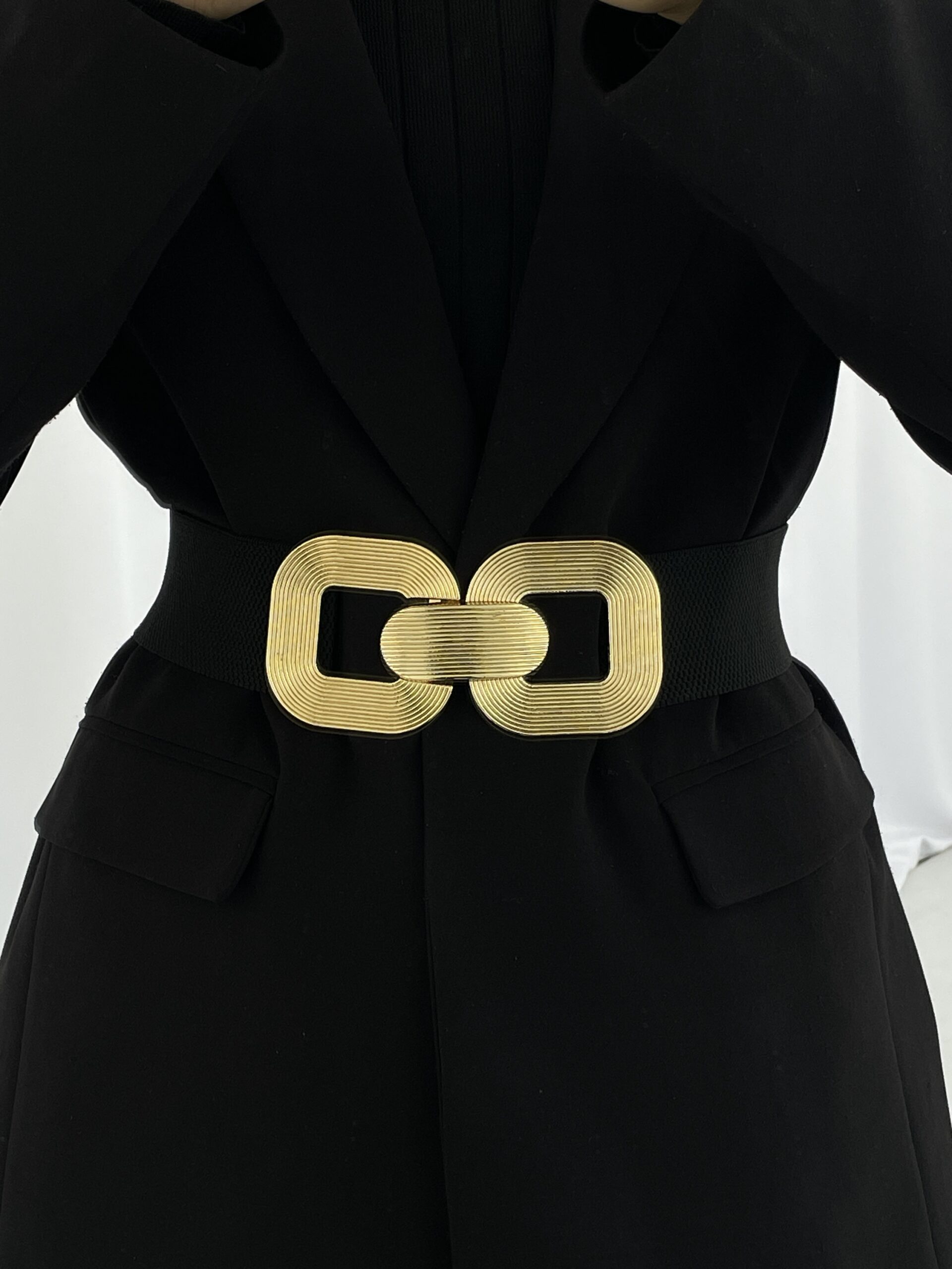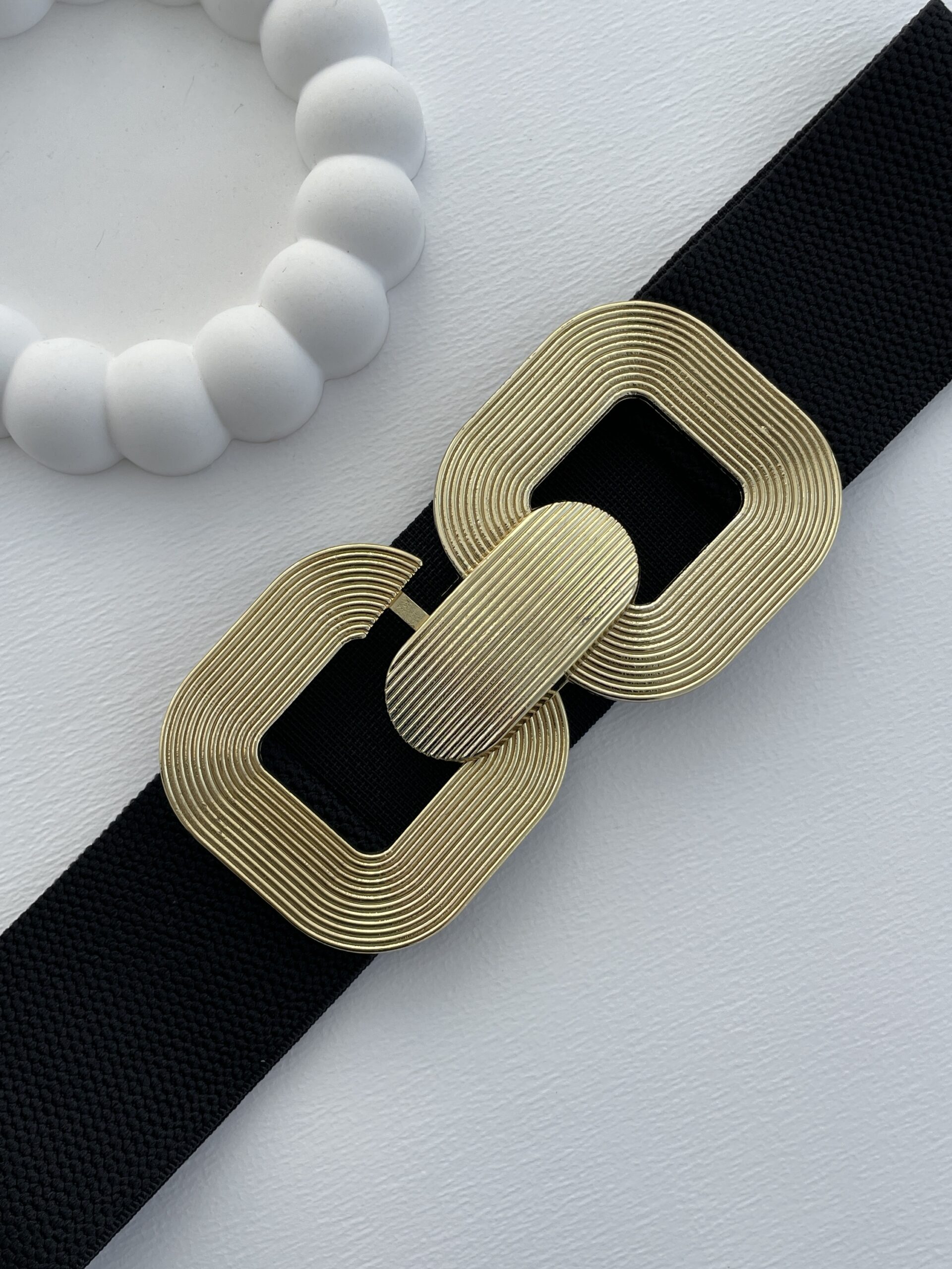 Lastikli kumaştan, gold geometrik şeklinde metal detaylı kemer. Genişlik 5,5cm.
