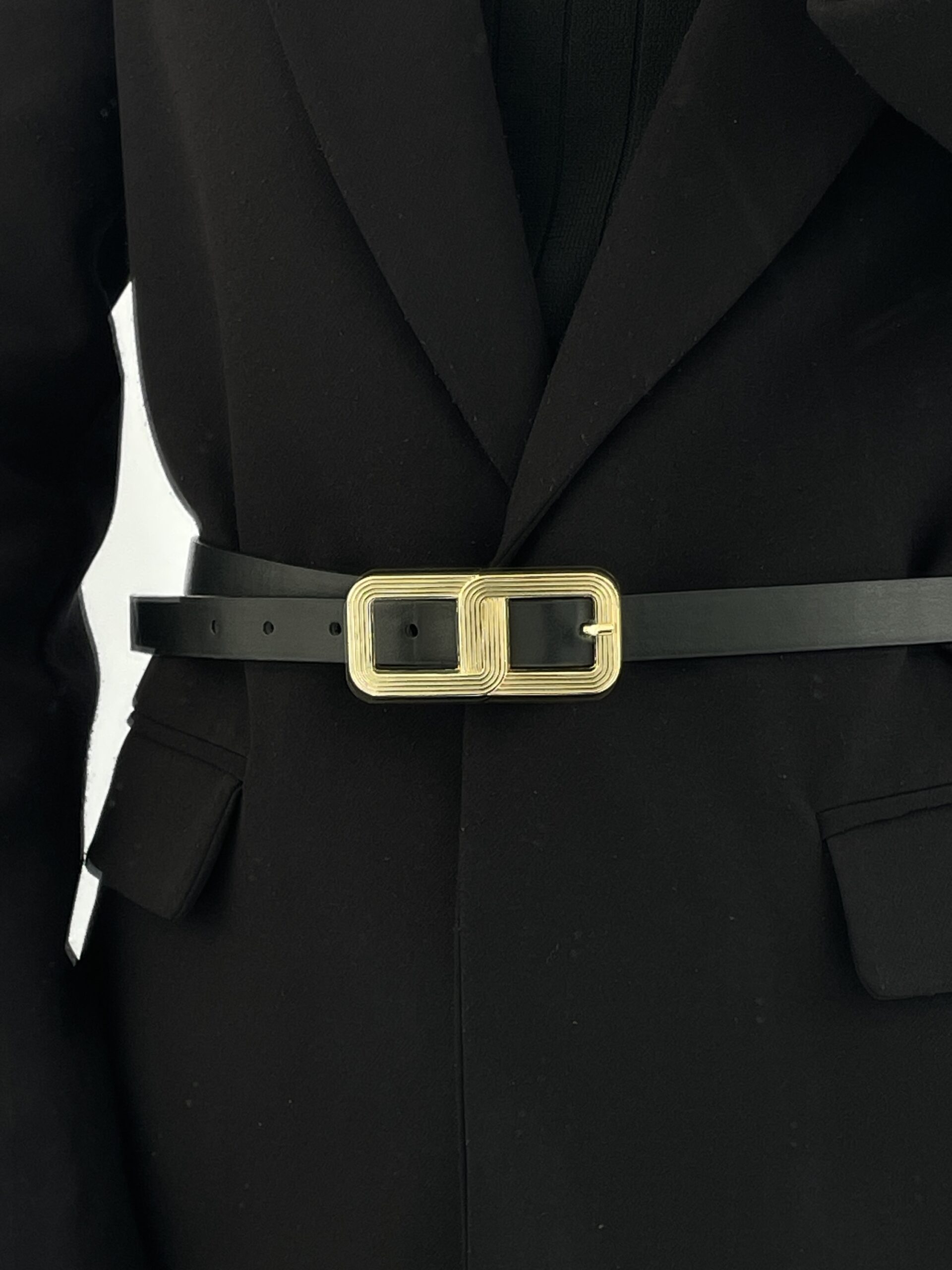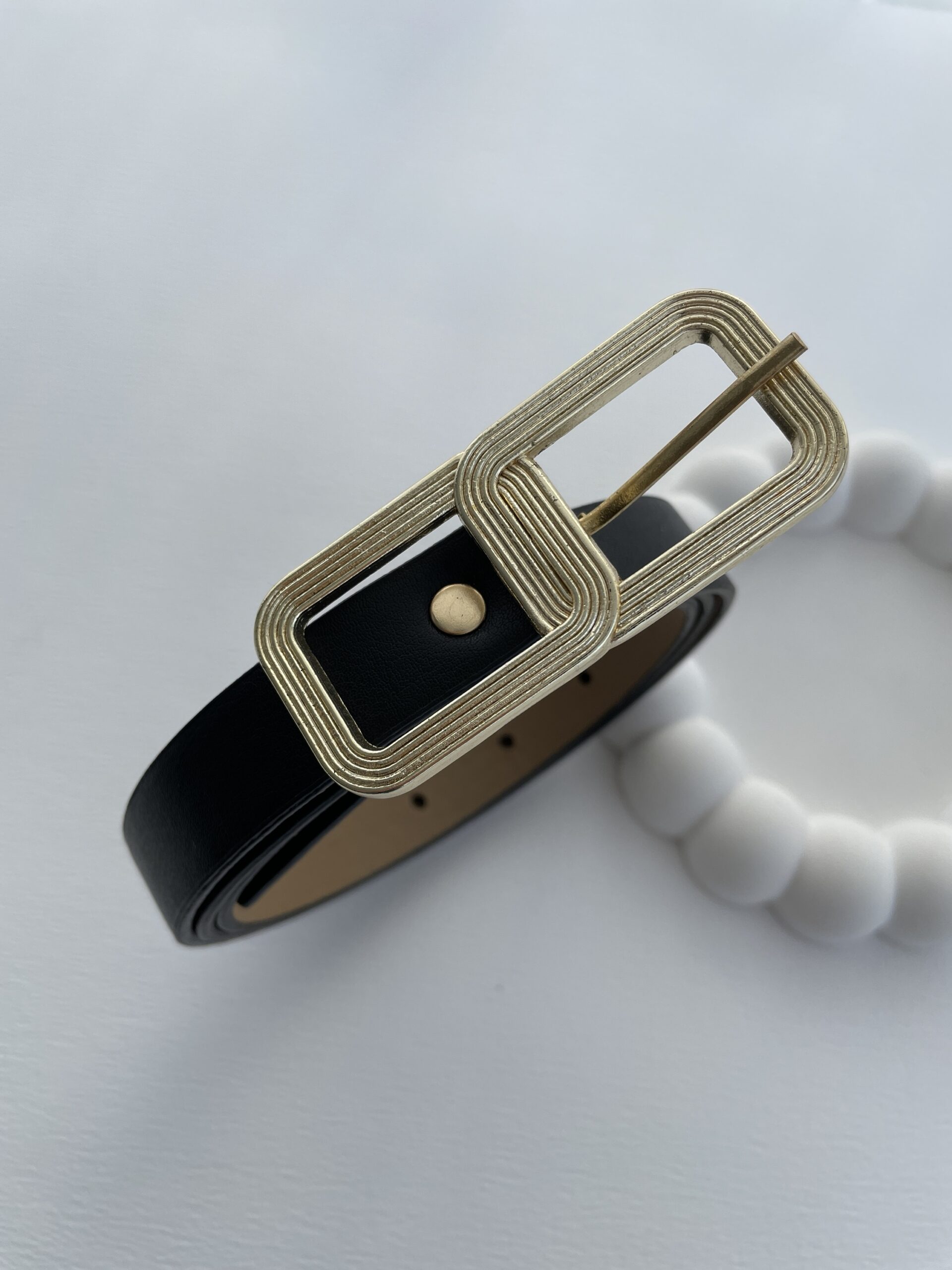 Tırtık Desen Geometrik Gold Tokalı Siyah Suni Deri Kemer