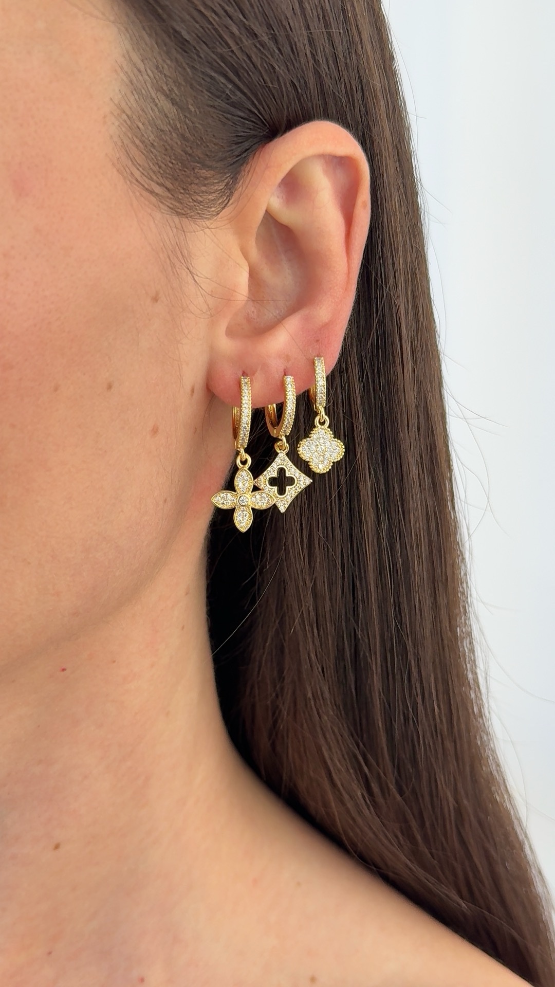 Özel Seri Zirkon Taşlı Yonca Model Sallantılı Gold Üçlü Küpe Seti
