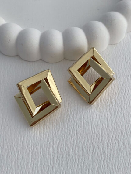 Çelik Çizgi Desen Geometrik Tasarım Gold Küpe